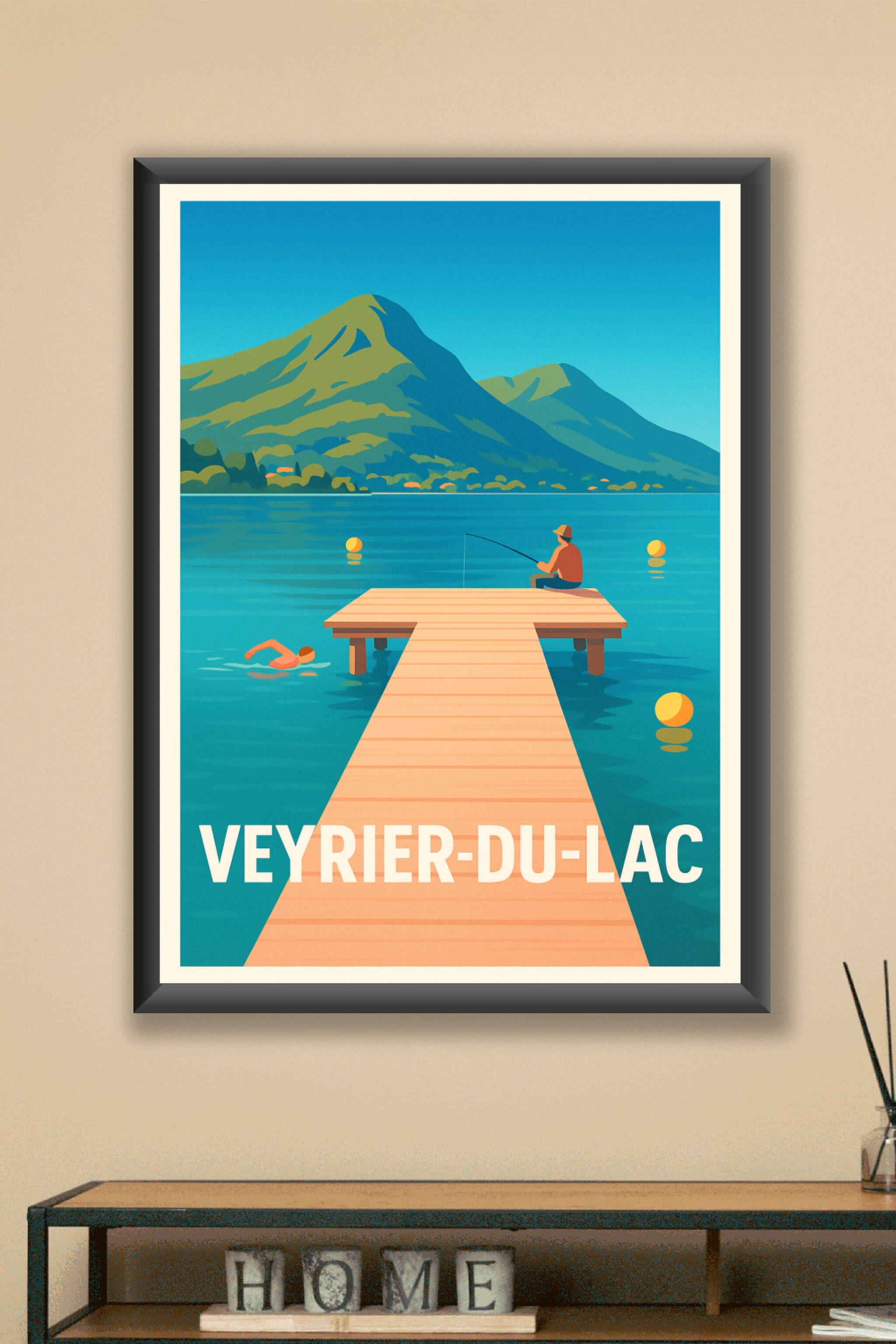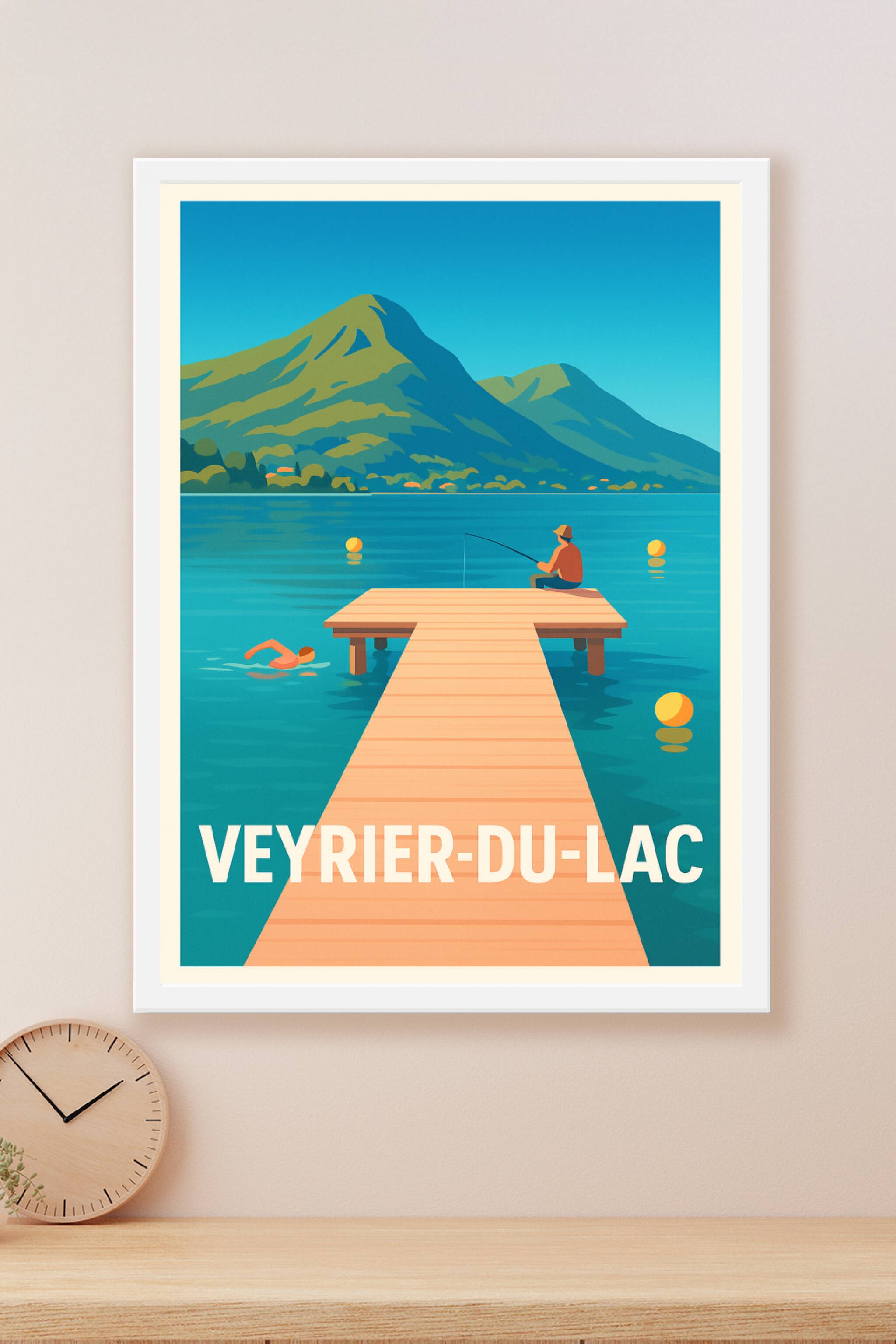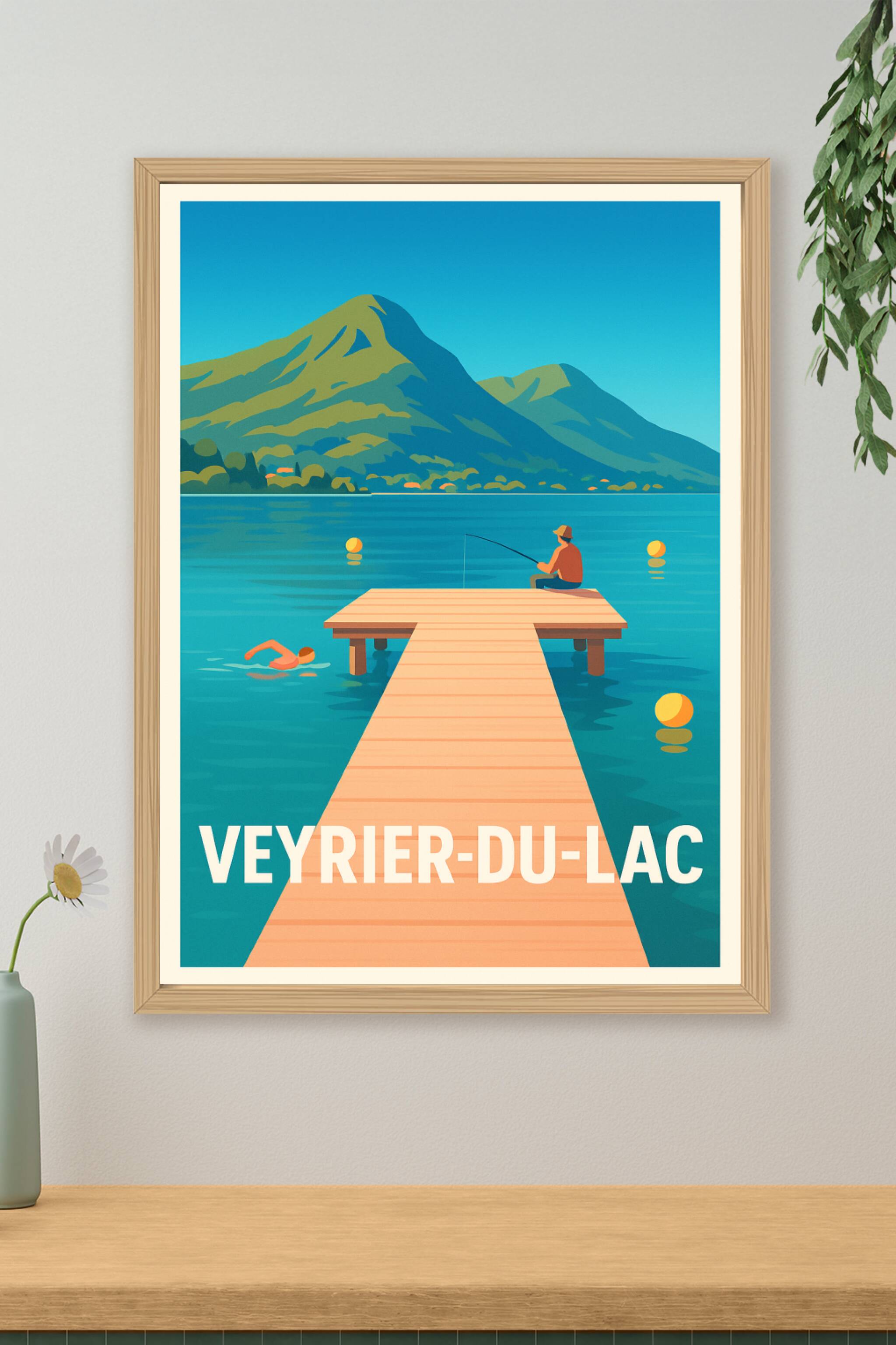 Découvrez la sérénité du lac de Veyrier-du-Lac avec cette affiche au design épuré et aux couleurs apaisantes, mettant en scène un instant de détent...