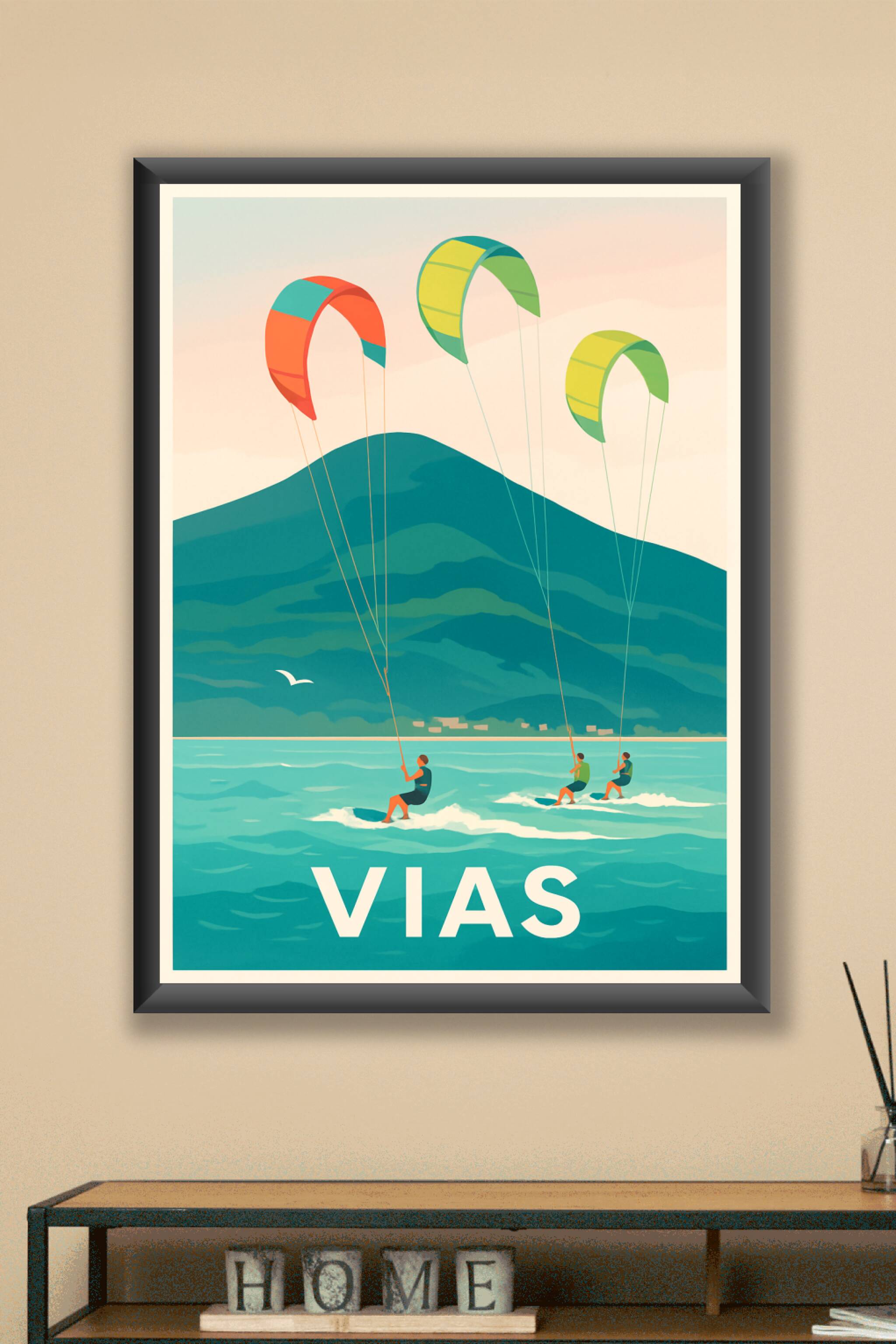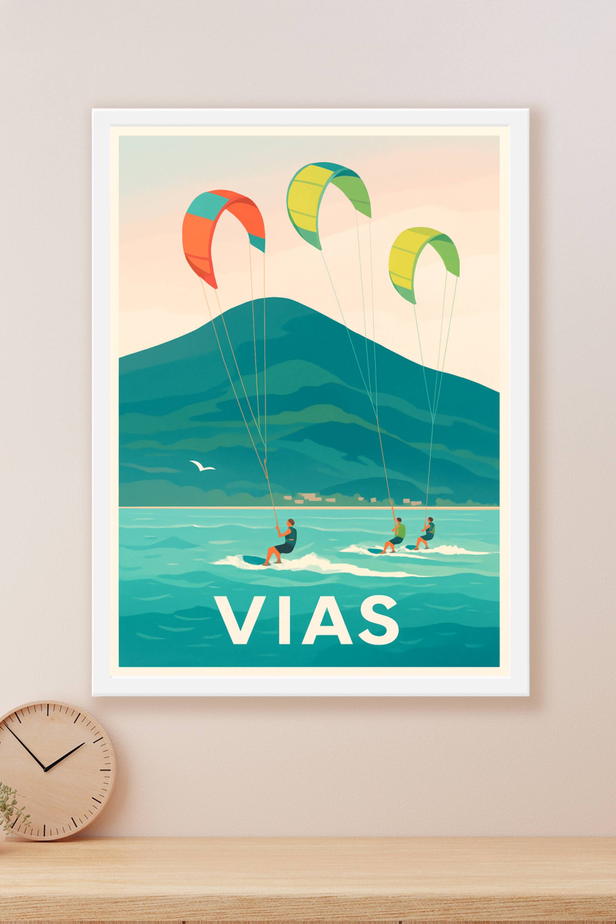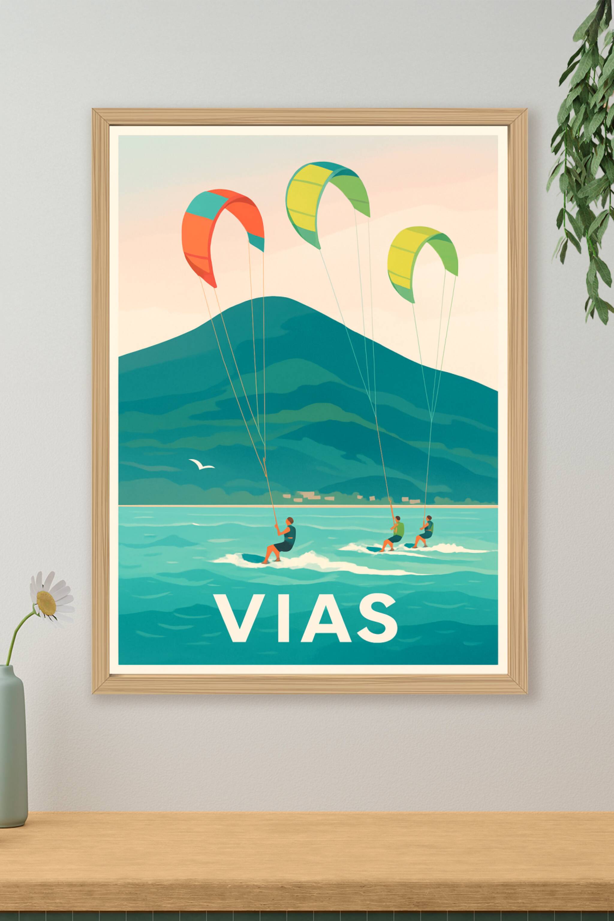 Découvrez l'énergie et la liberté du kitesurf à Vias avec cette superbe affiche illustrée, capturant parfaitement l'ambiance marine et sportive de ...