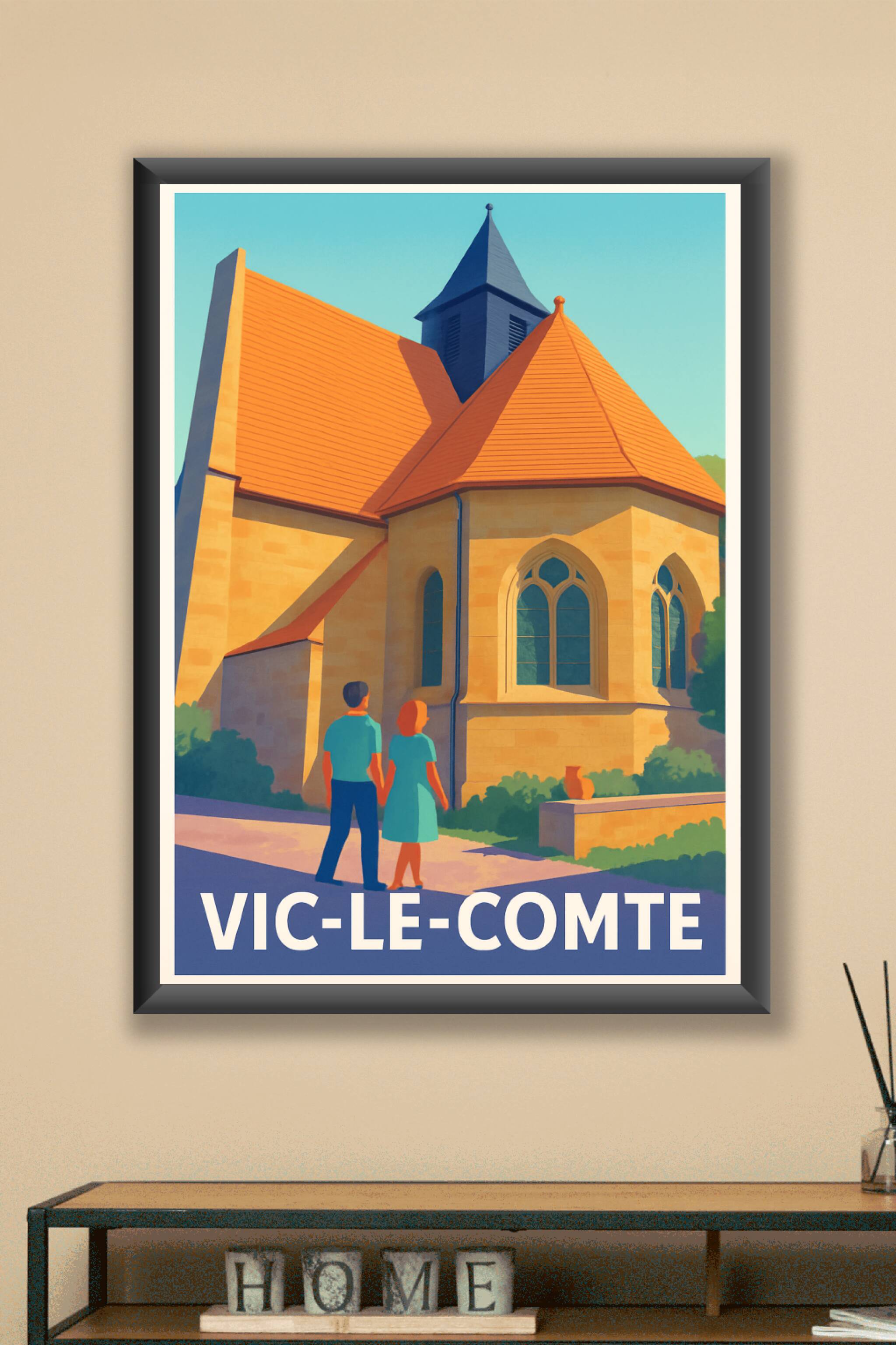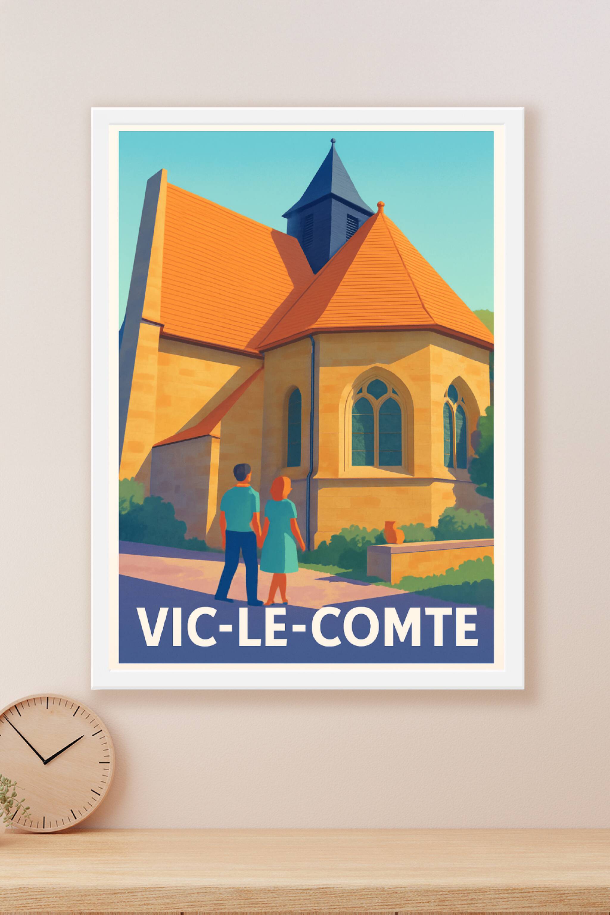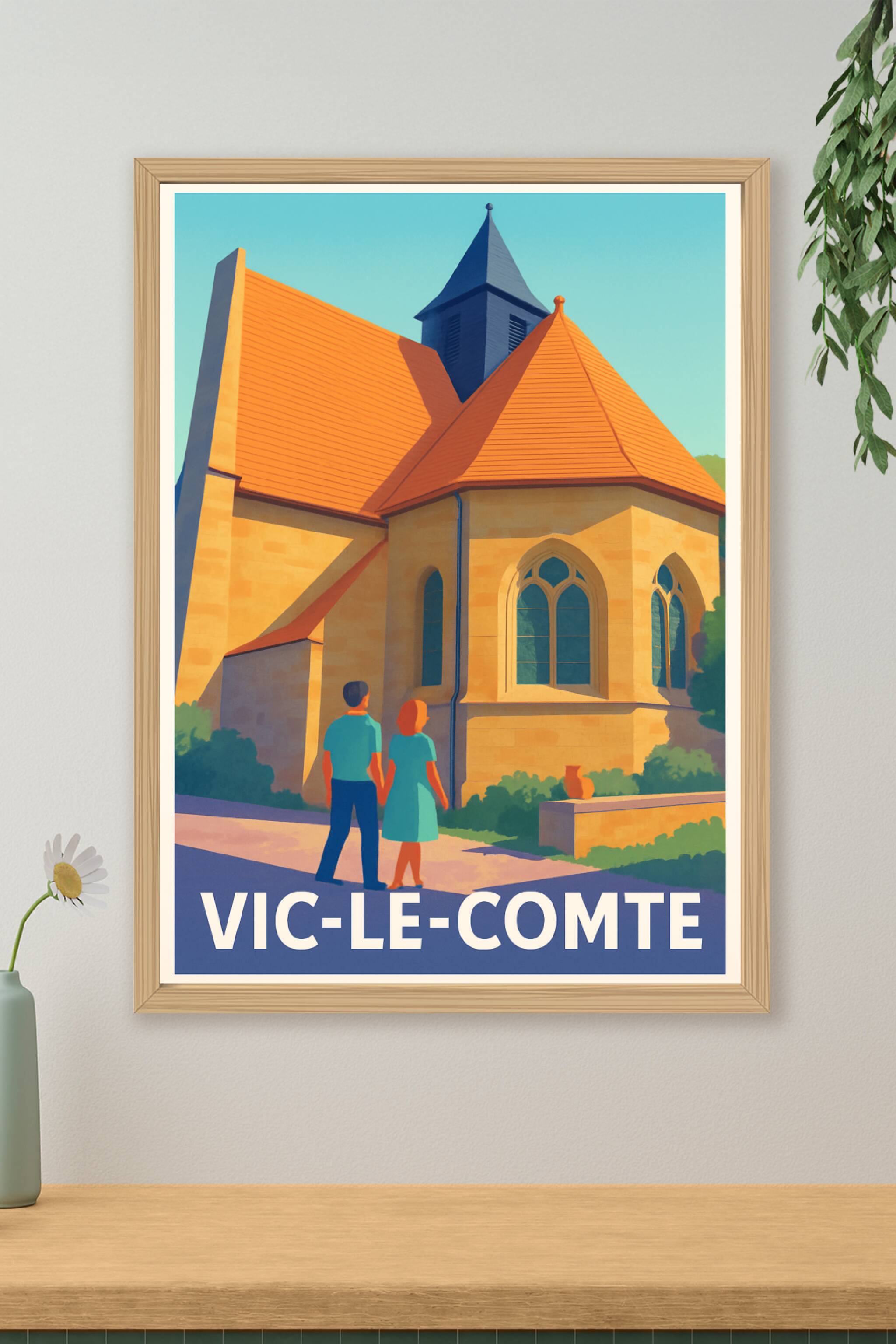 Découvrez l'élégance intemporelle de Vic-le-Comte avec cette affiche qui met en lumière l’architecture remarquable de cette ville auvergnate. Le poster illustre une scène paisible où un couple contemple les contours d’une église typique, évoquant l’histoire et la sérénité du lieu.Cette affiche est imprimée en tirage Fine Art sur papier 305g coton, garantissant une qualité d’impression exceptionnelle et des couleurs vibrantes. Disponible en formats A1 à A4, avec ou sans cadre, ce poster premium est conçu pour sublimer votre décoration intérieure ou offrir un souvenir authentique aux amoureux de la région.Fabriquée en France, cette affiche est le choix parfait pour habiller vos murs avec élégance et raffinement.