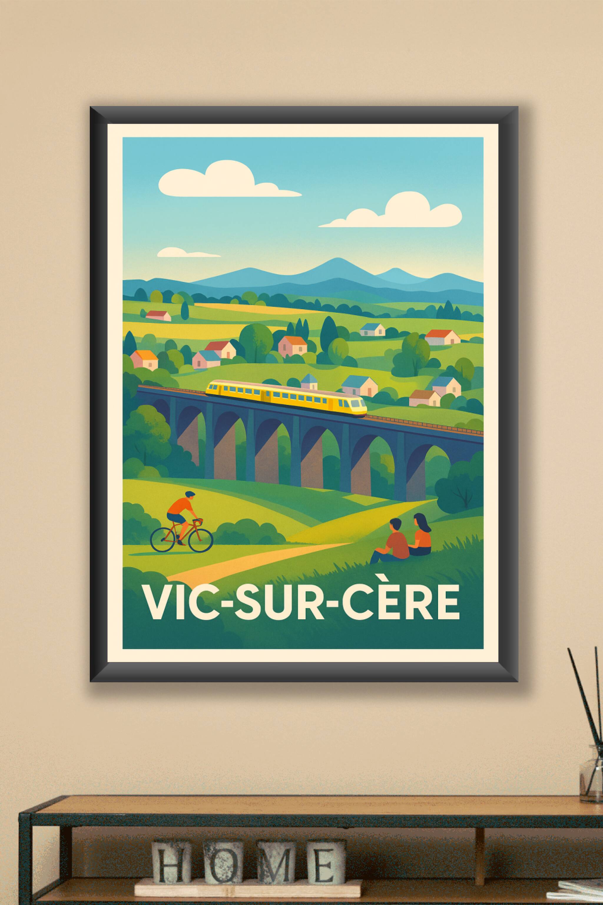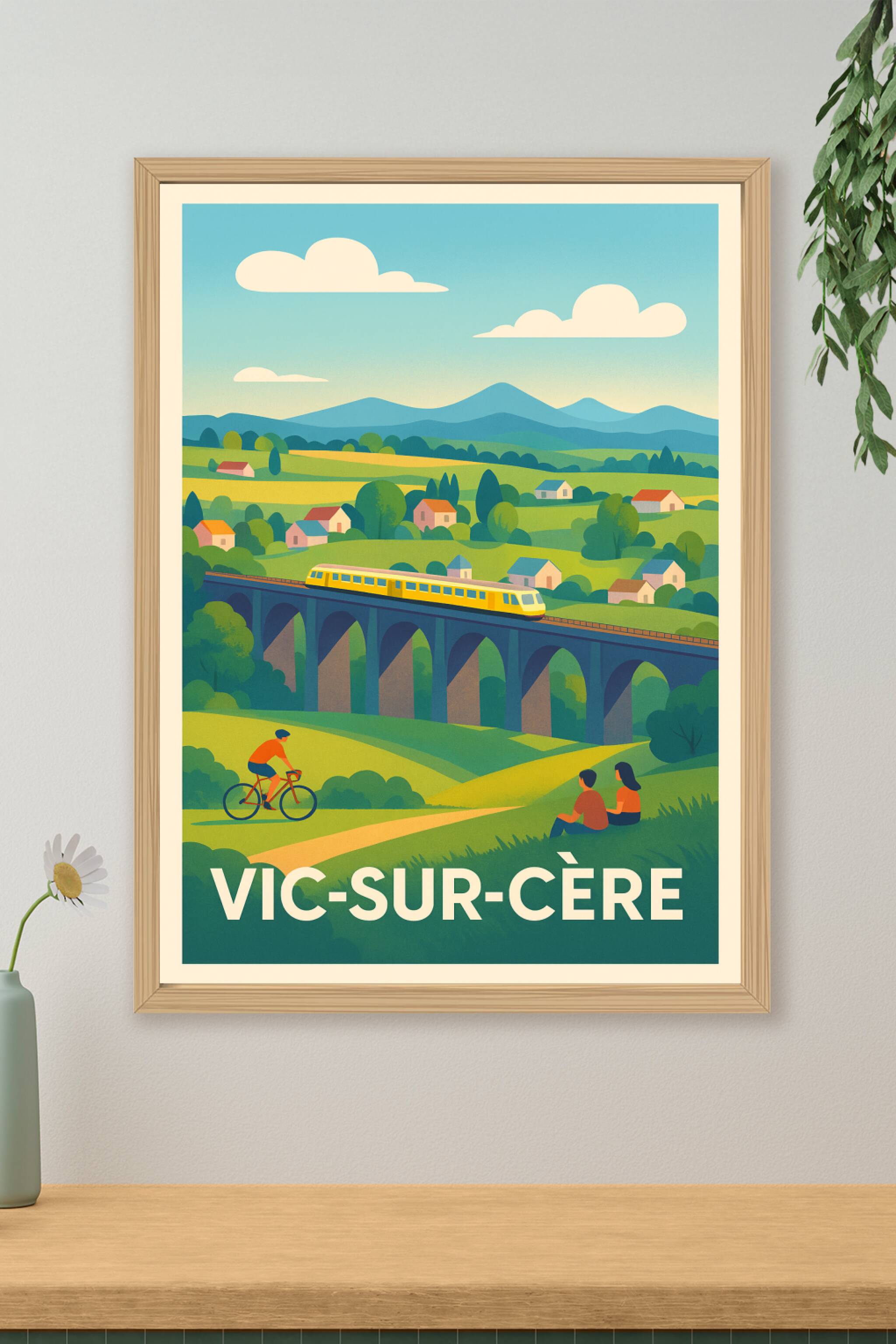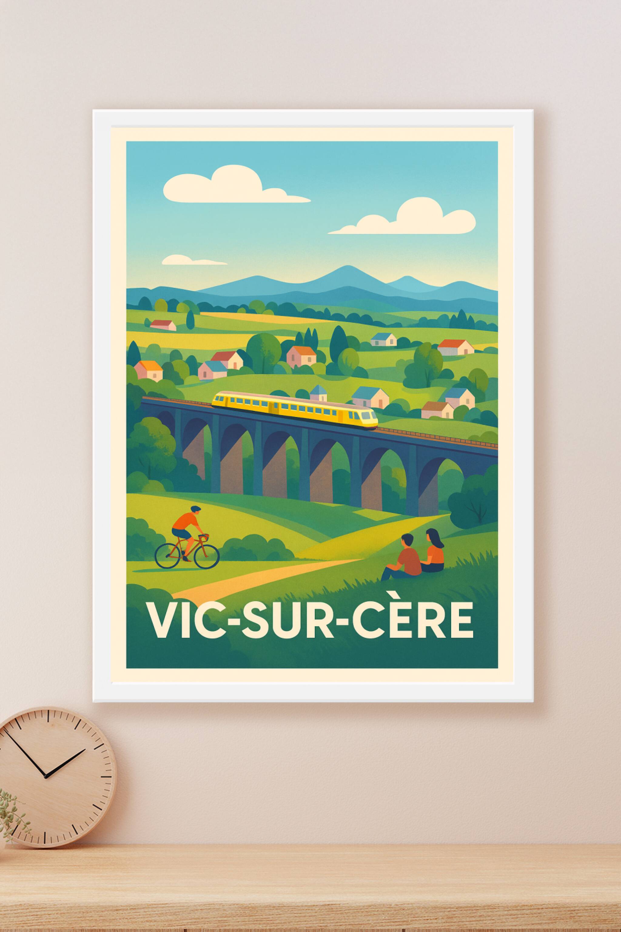 Découvrez la charmante ville de Vic-sur-Cère avec cette affiche illustrée où la nature luxuriante rencontre le charme paisible des petites maisons ...
