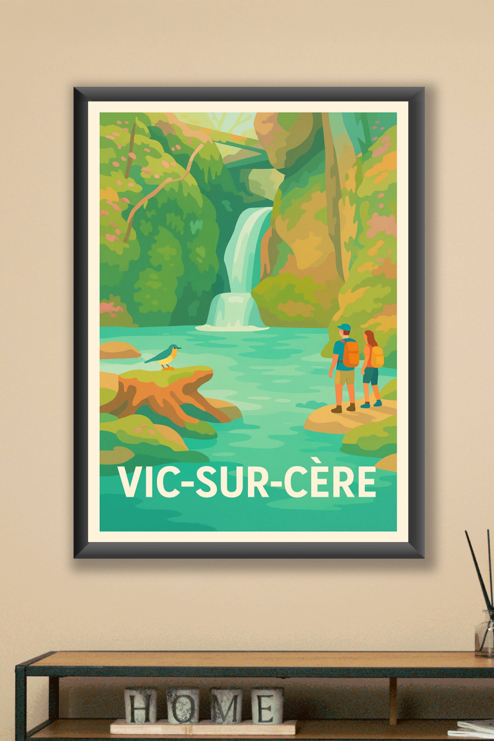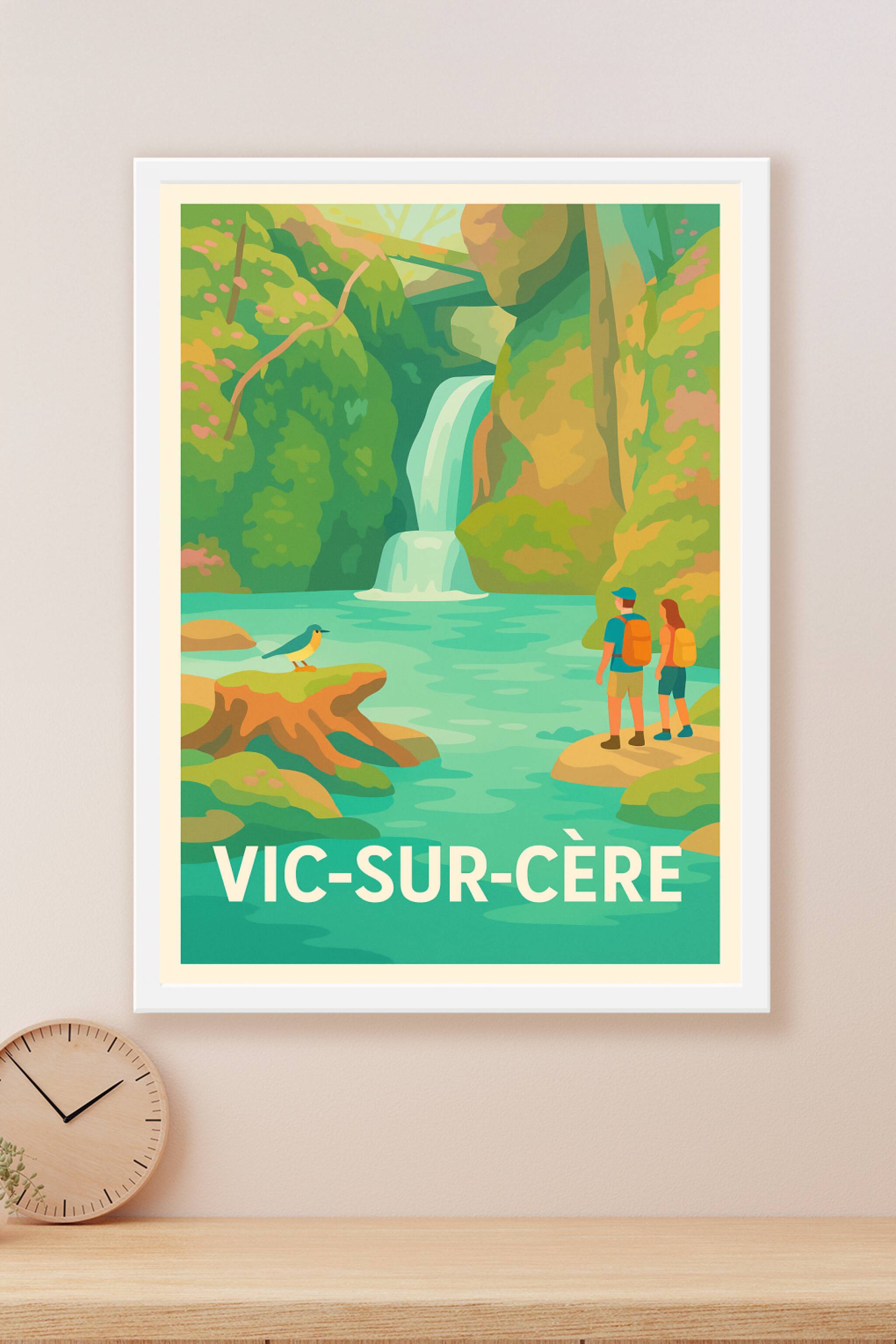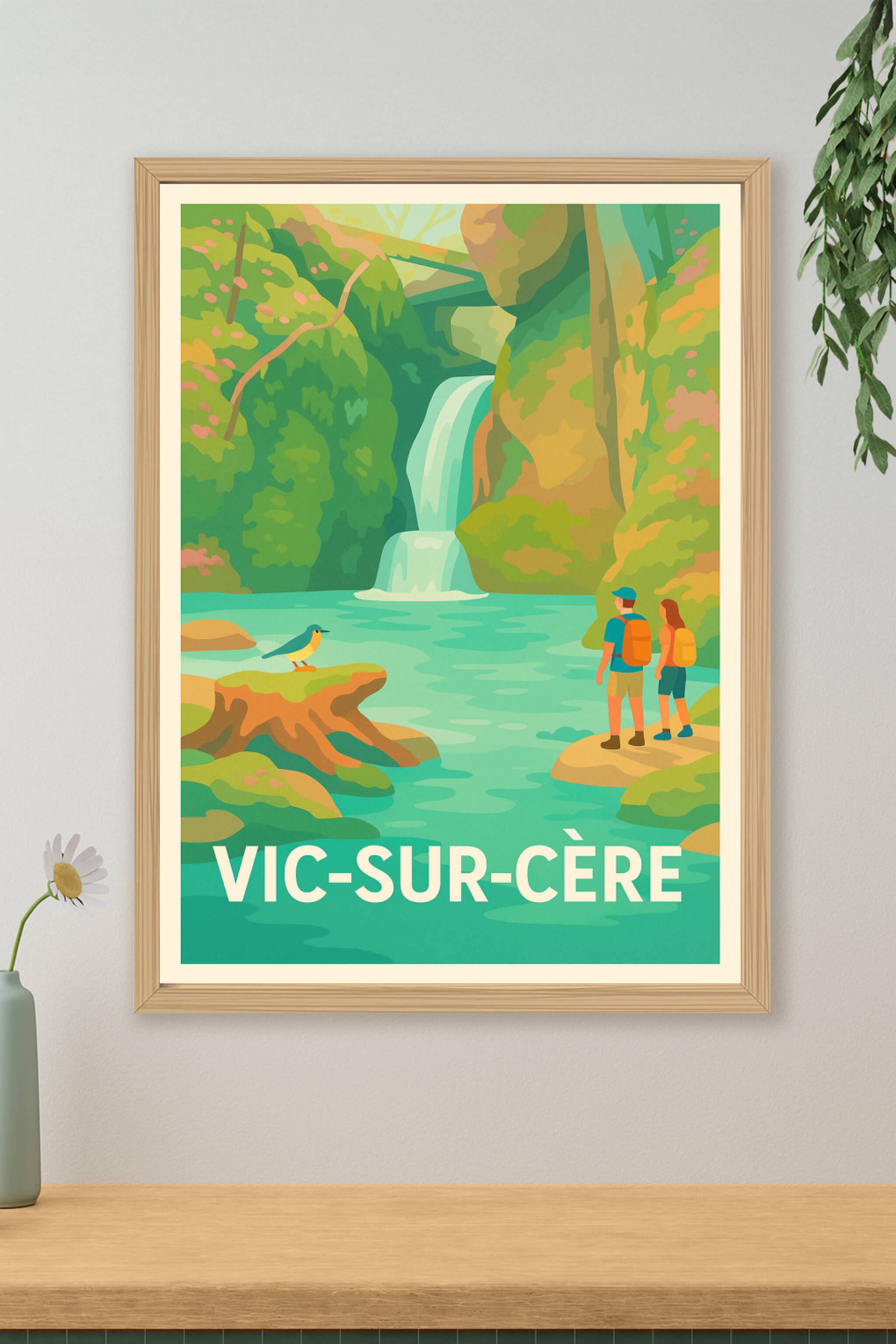 Découvrez l'incroyable beauté naturelle de Vic-sur-Cère avec cette affiche stylisée représentant une cascade paisible entourée d'une végétation lux...