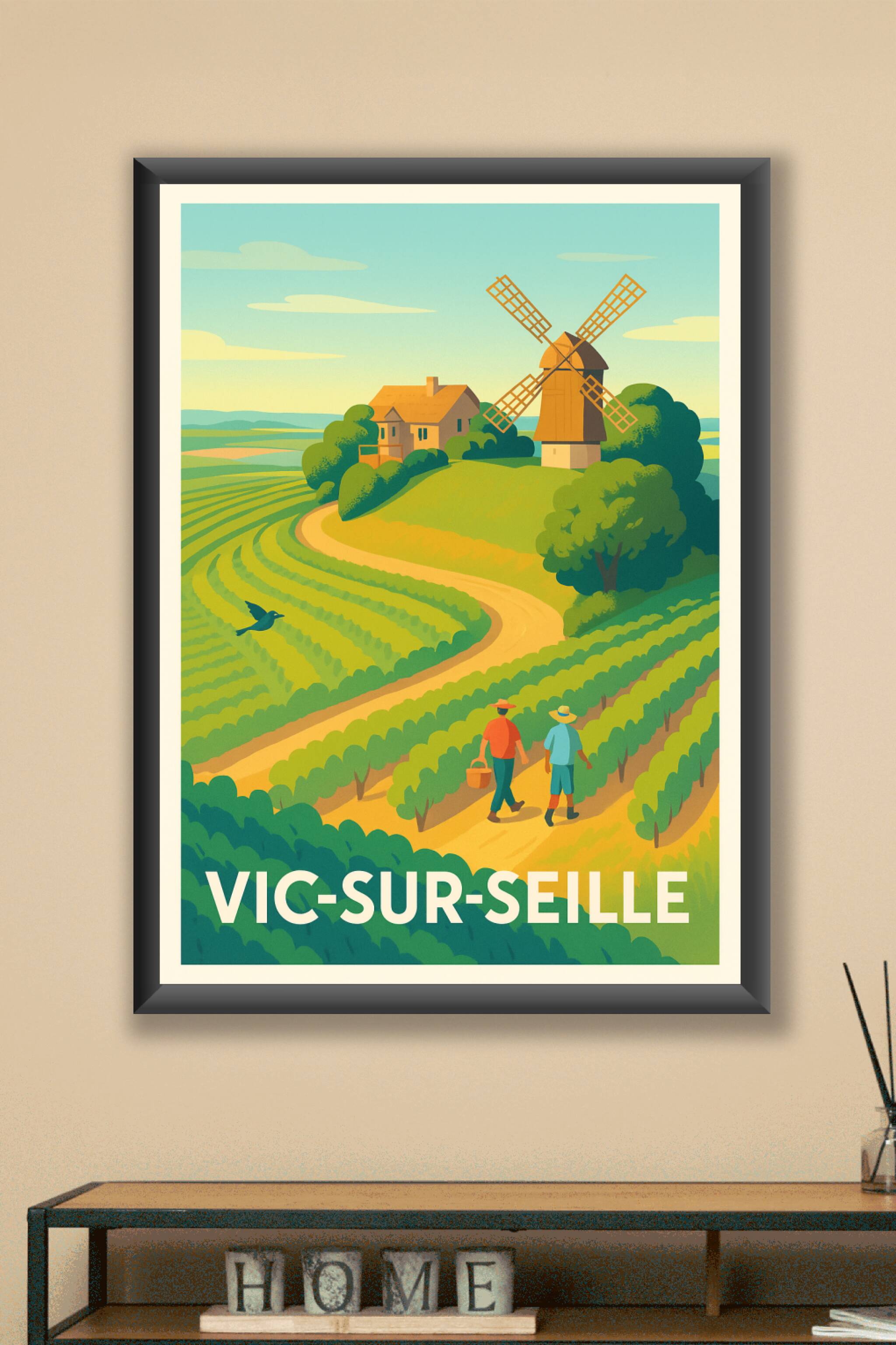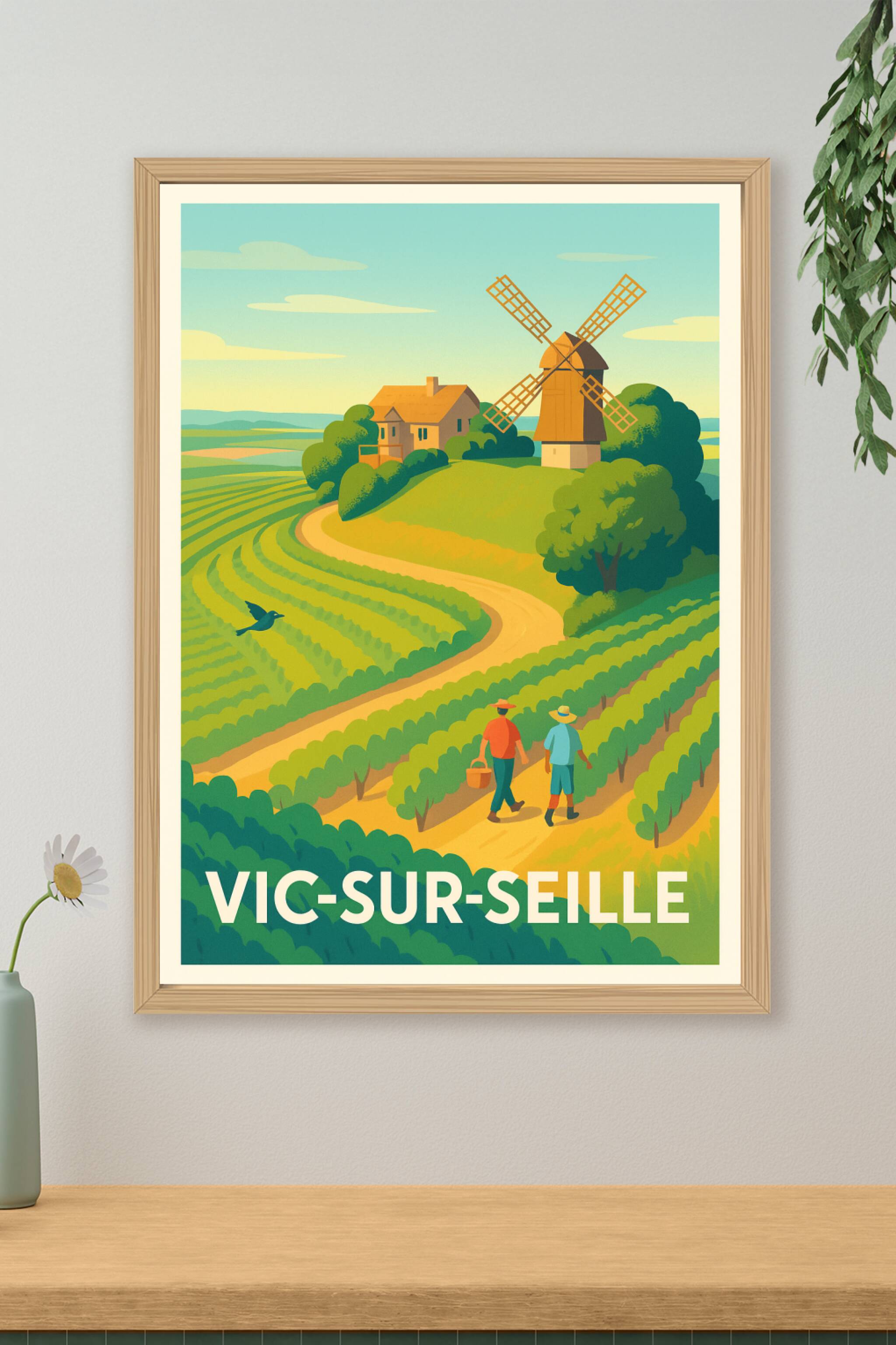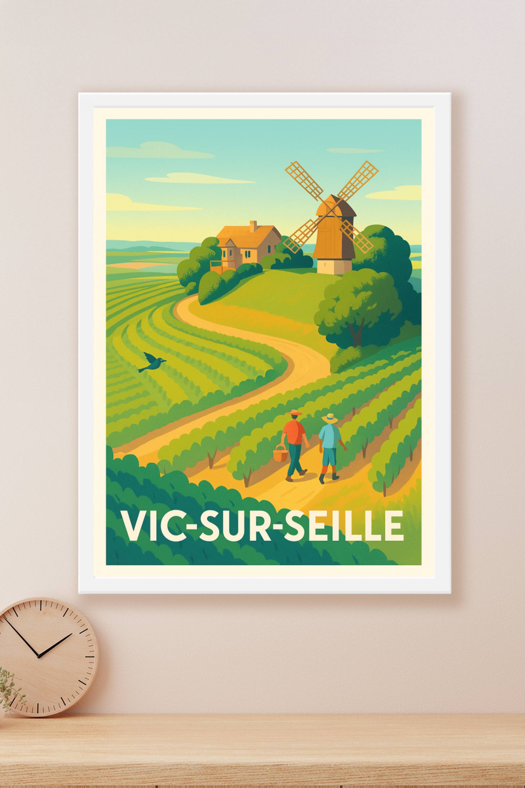 Apportez une touche bucolique et authentique à votre décoration avec ce poster illustré représentant les paysages verdoyants et le célèbre moulin de Vic-sur-Seille. Cette affiche met en lumière l'atmosphère paisible des vignobles et des chemins sinueux entourant cette charmante commune. Imprimée en tirage "Fine Art" sur papier 305g coton de haute qualité, cette affiche se décline du format A1 au format A4, avec ou sans cadre selon vos envies. Profitez d'une impression premium, 100 % fabriquée en France, pour embellir votre intérieur ou offrir un cadeau raffiné aux passionnés de la région et de ses traditions rurales.