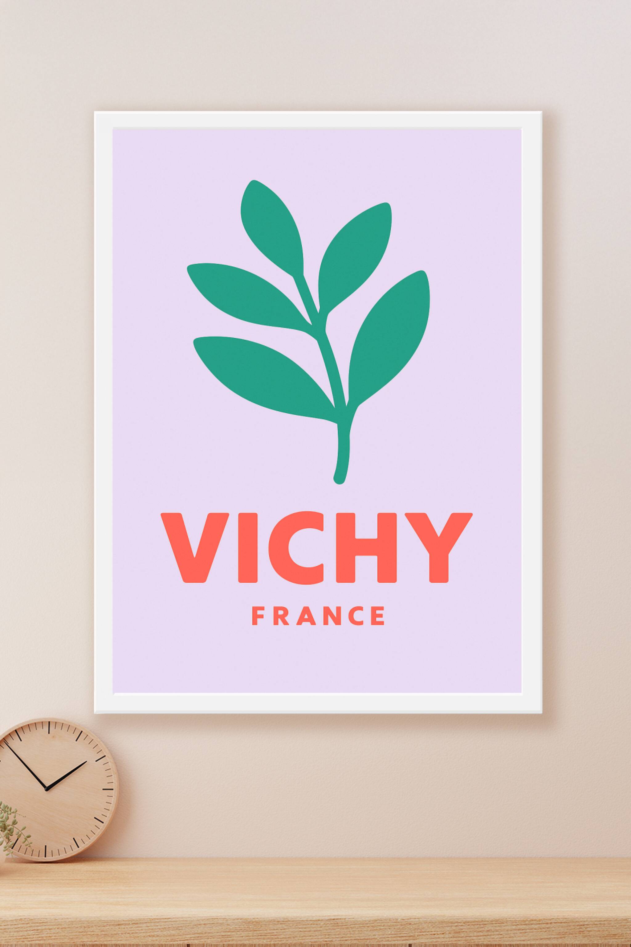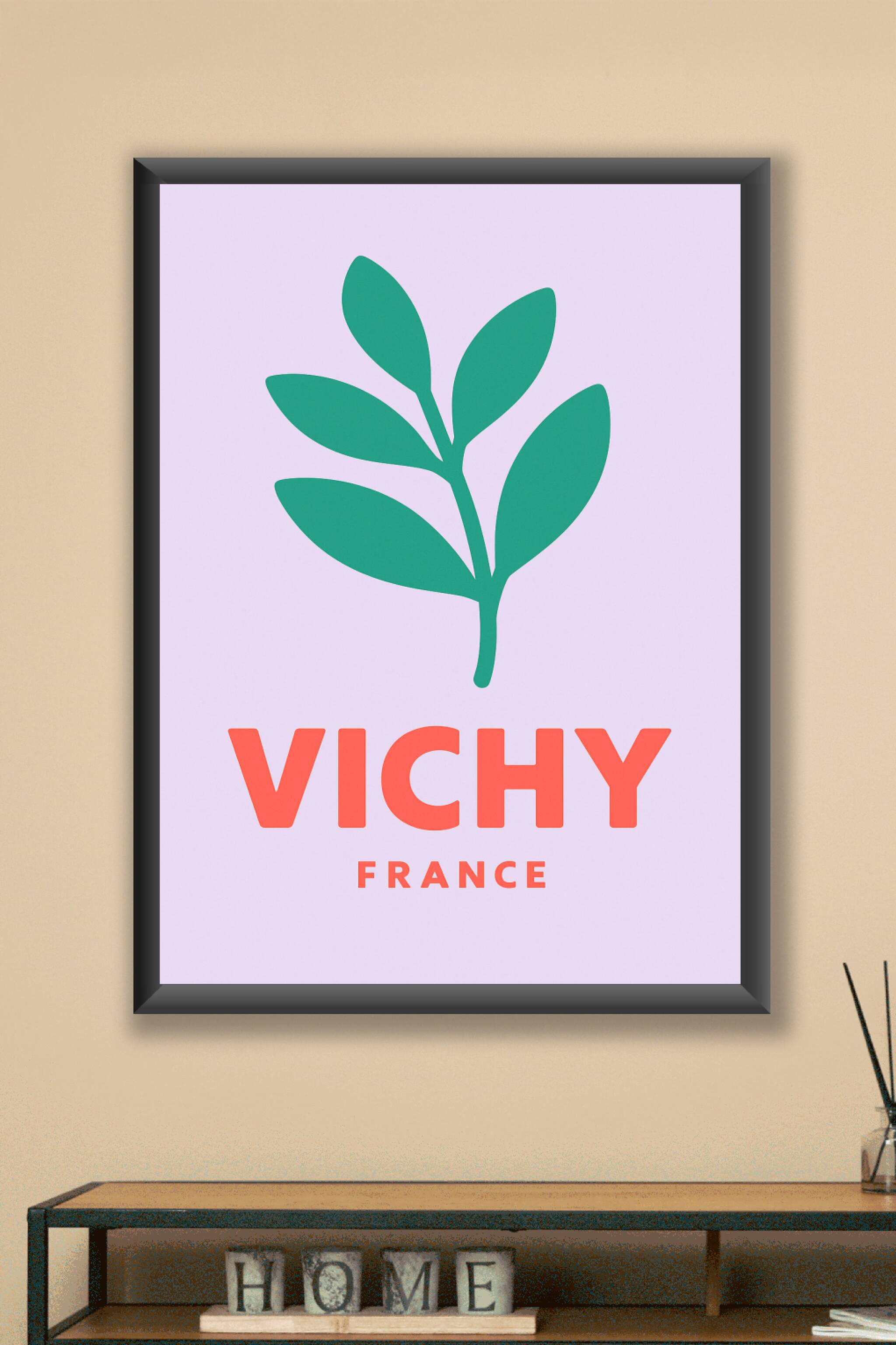Découvrez cette affiche minimaliste dédiée à Vichy, symbole d'élégance et de nature. Le design épuré met en avant une feuille verte contrastant ave...