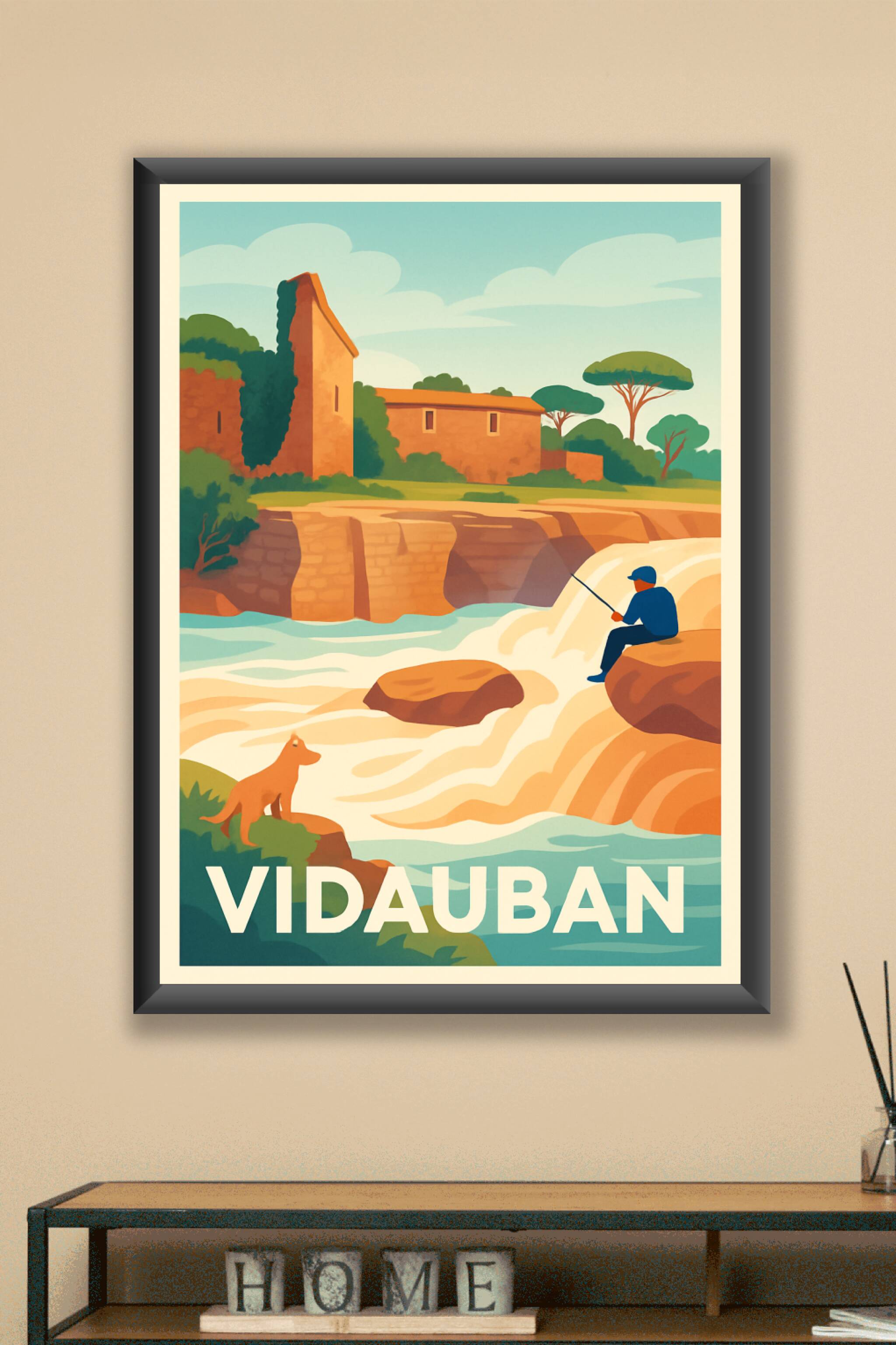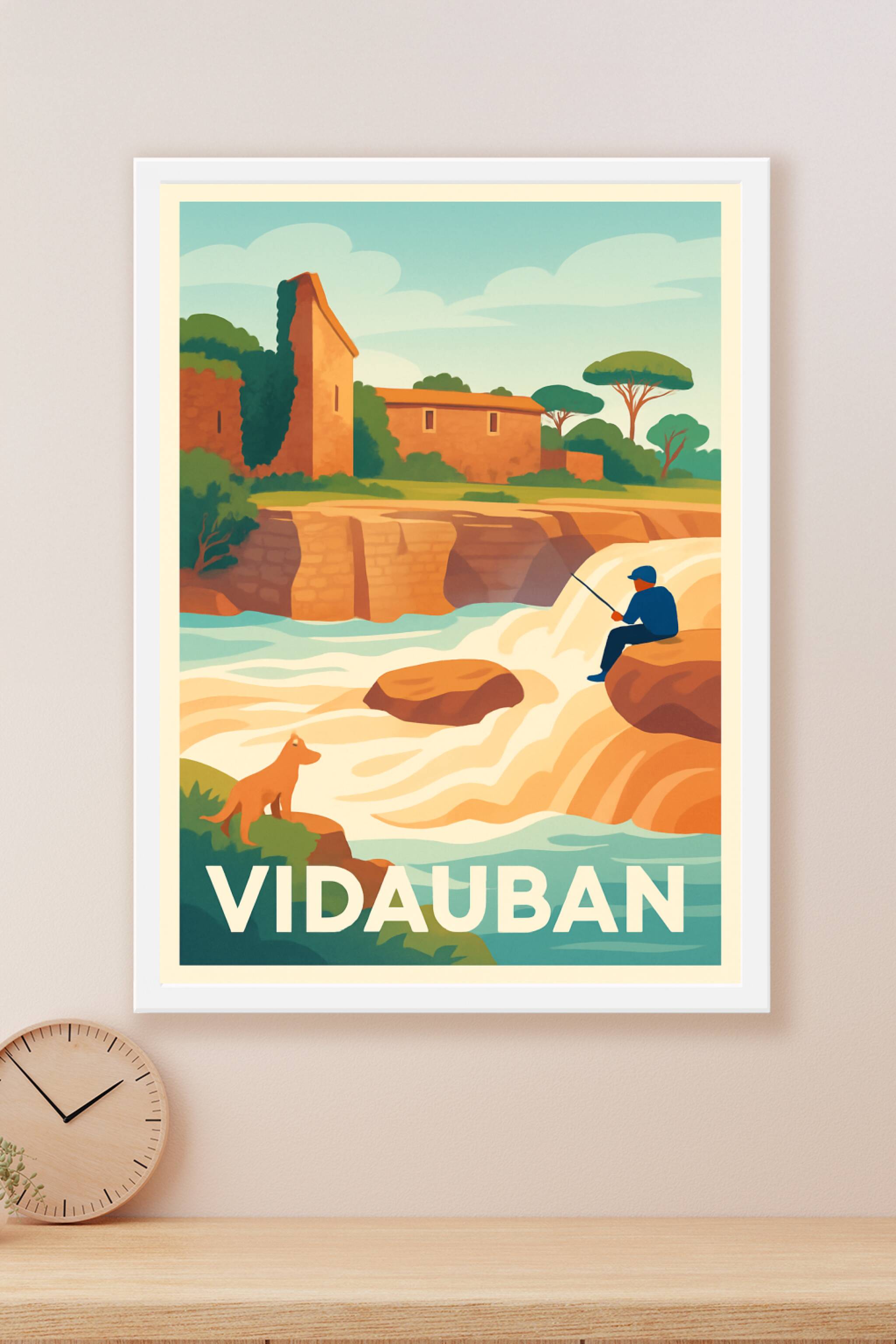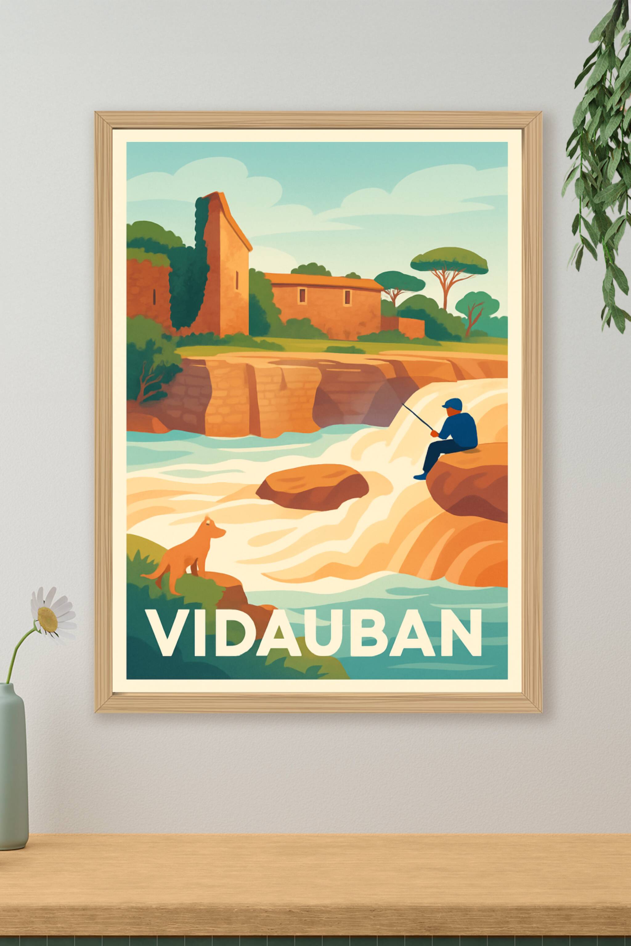 Découvrez l'atmosphère paisible et bucolique de Vidauban avec cette affiche illustrée mettant en scène un pêcheur au bord des cascades et un chien ...