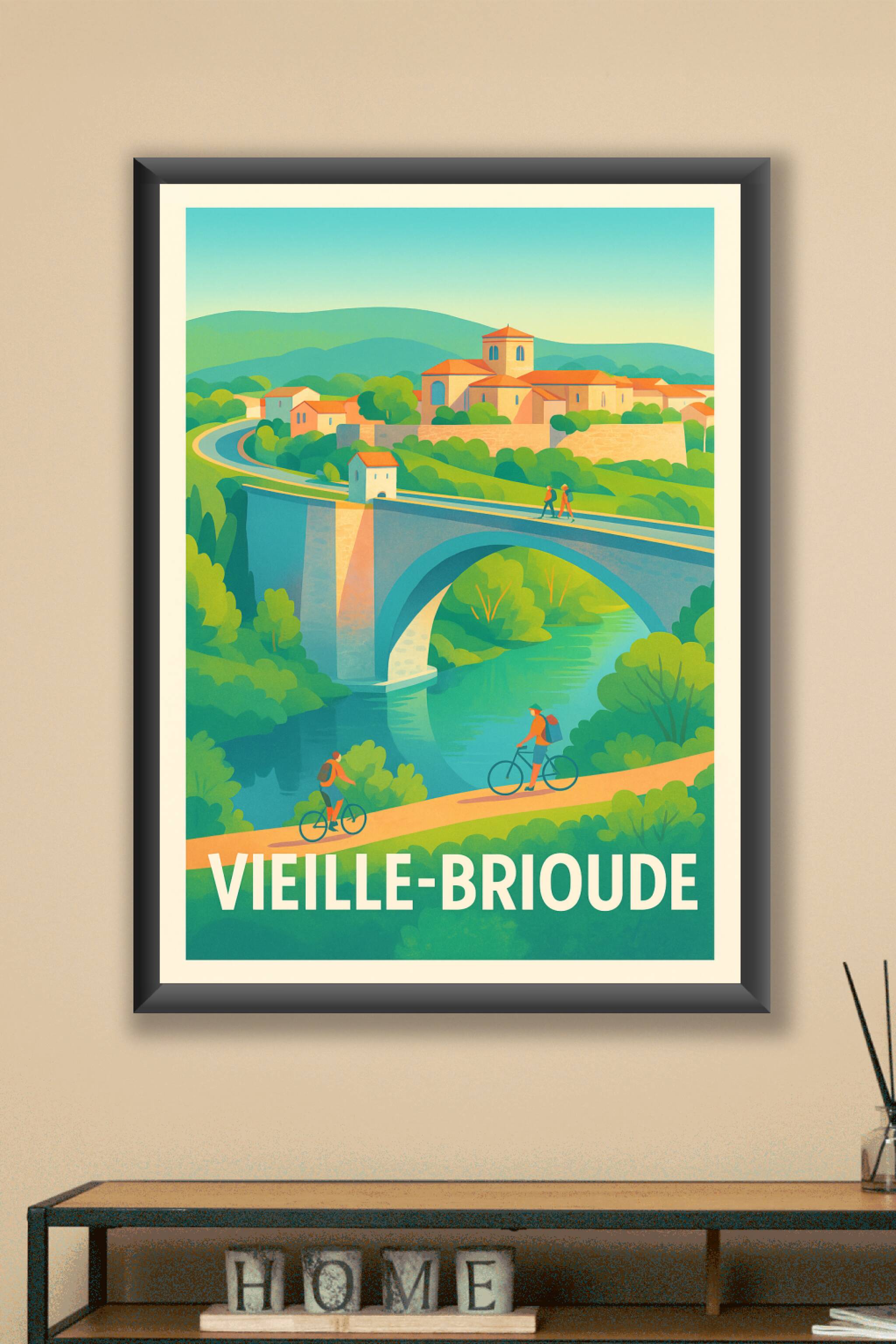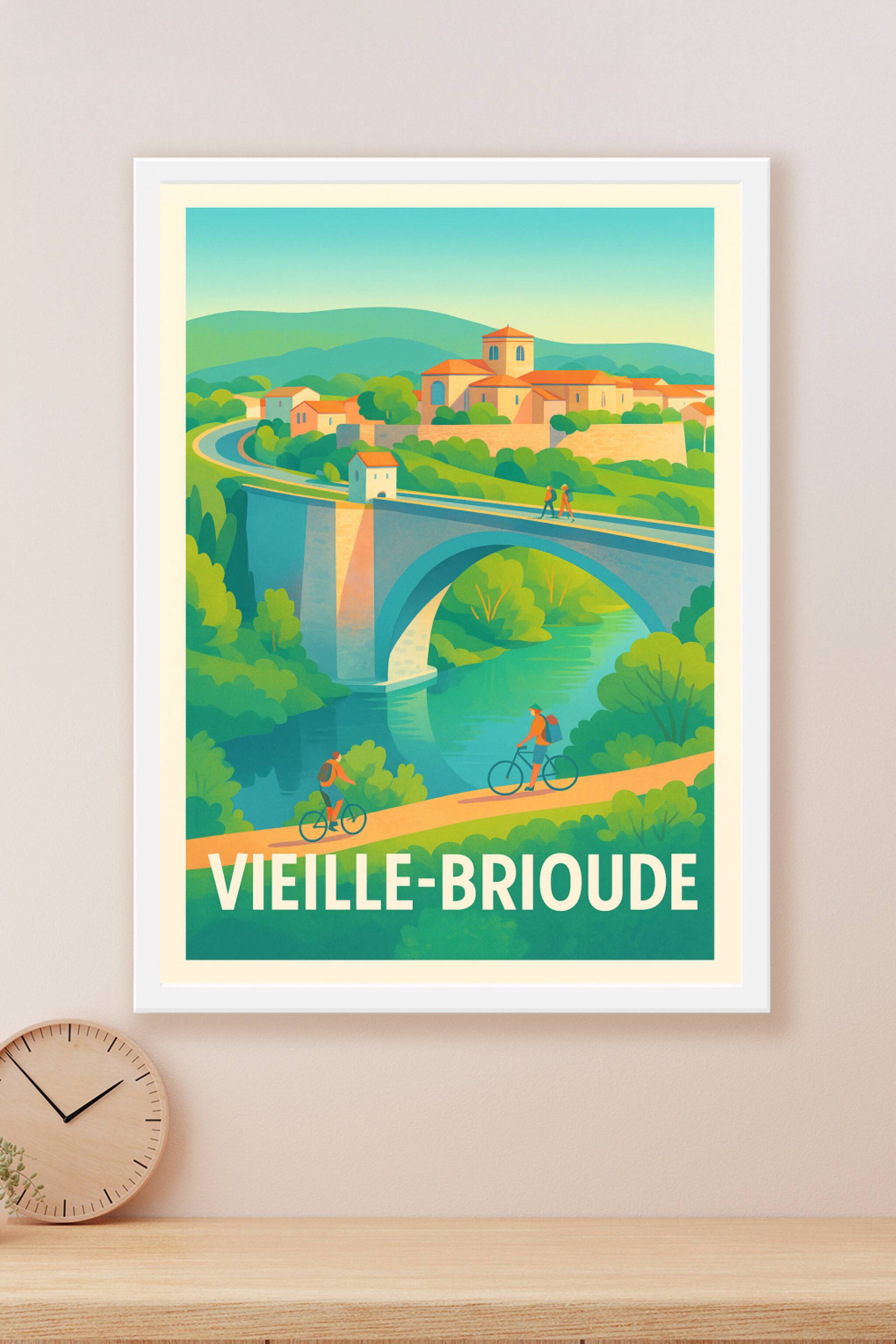 Découvrez le charme intemporel de Vieille-Brioude avec cette affiche illustrée qui met en valeur le pont historique et les paysages verdoyants de l...