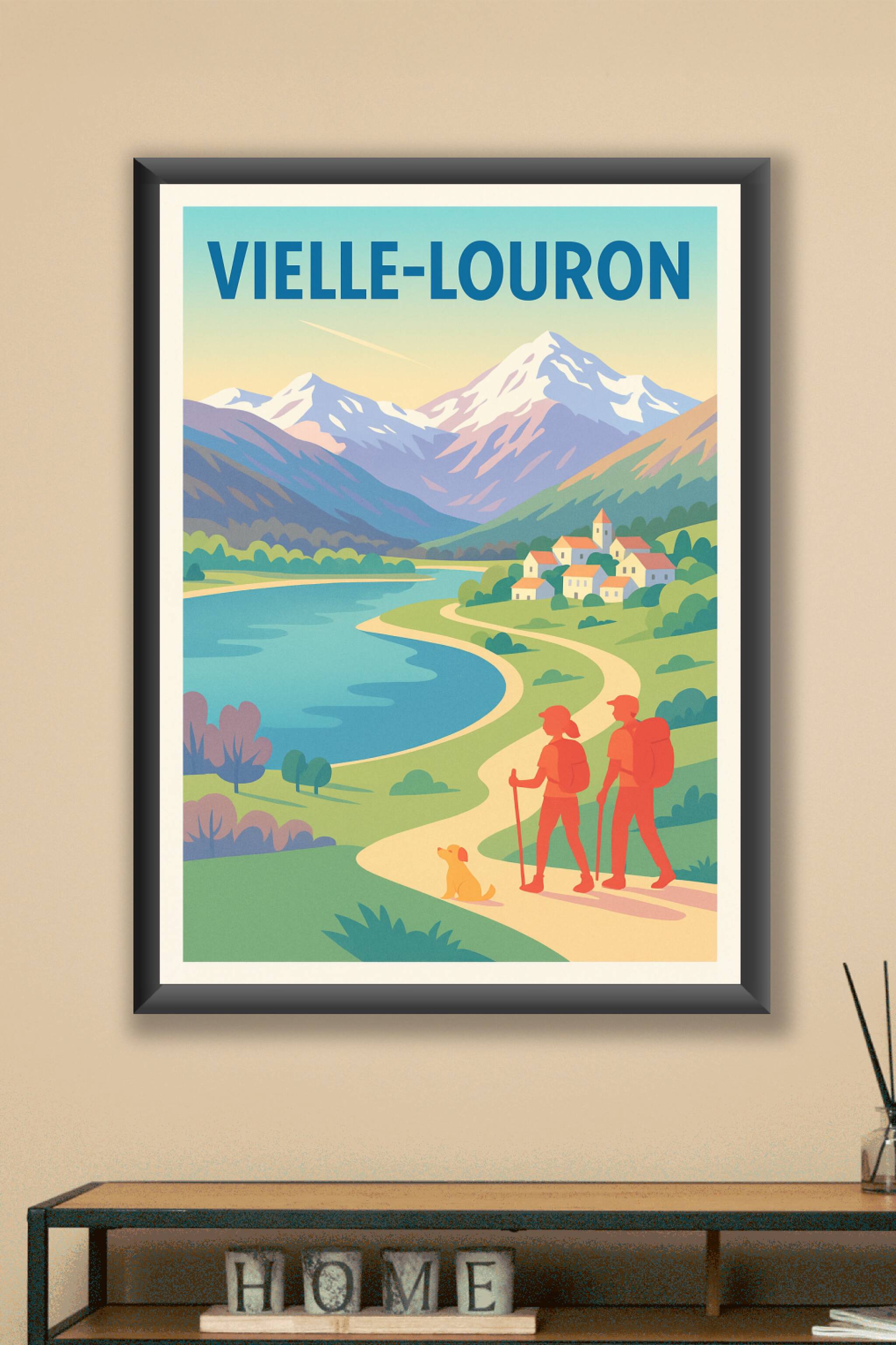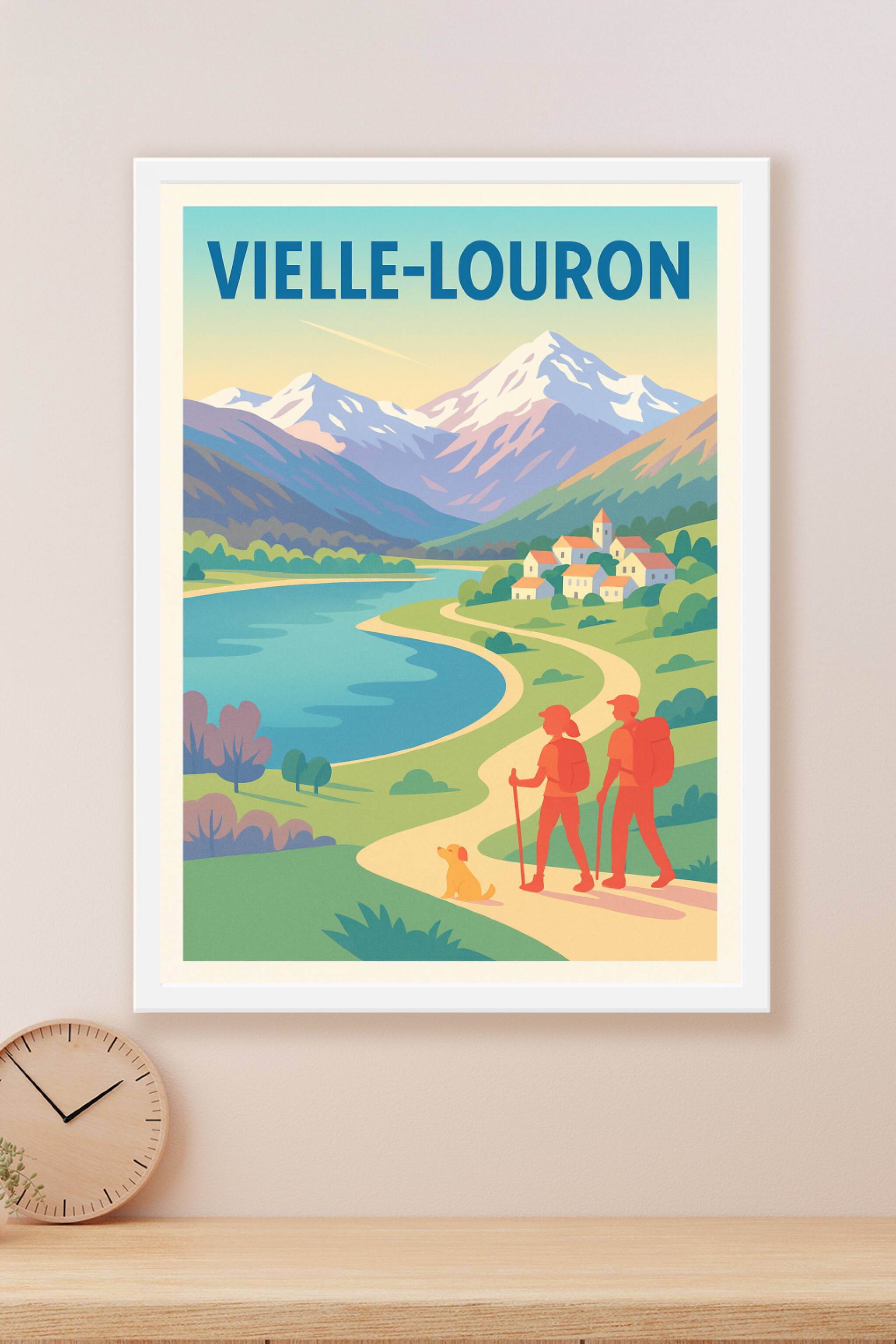 Découvrez la beauté naturelle de Vielle-Louron avec cette affiche au style vintage qui met en scène une randonnée bucolique le long d'une rivière e...