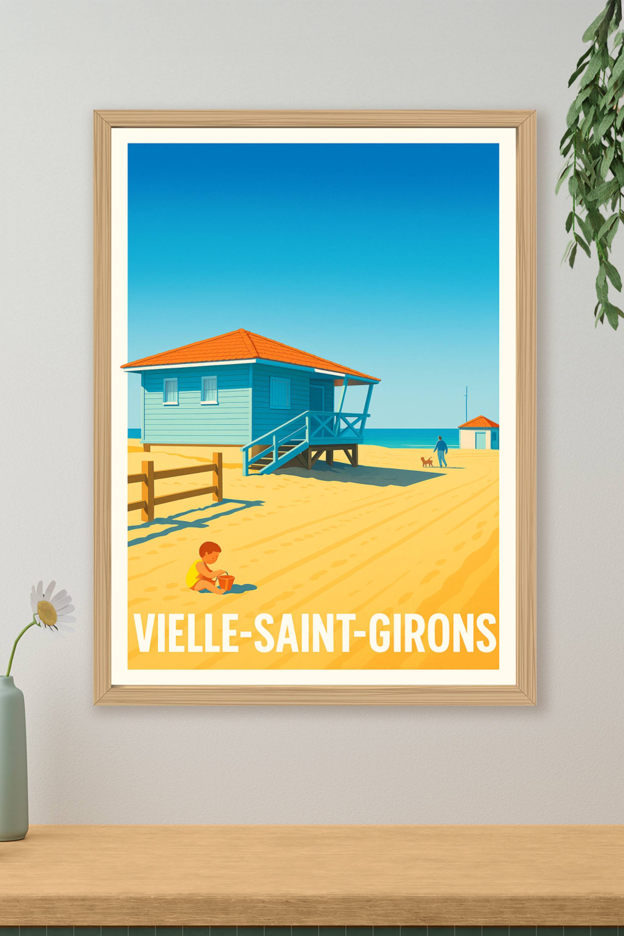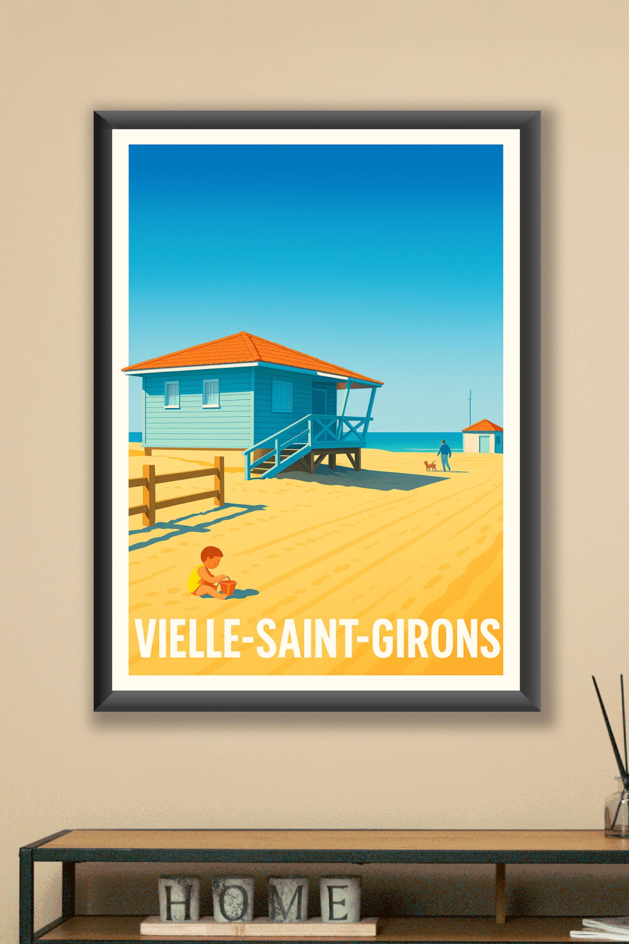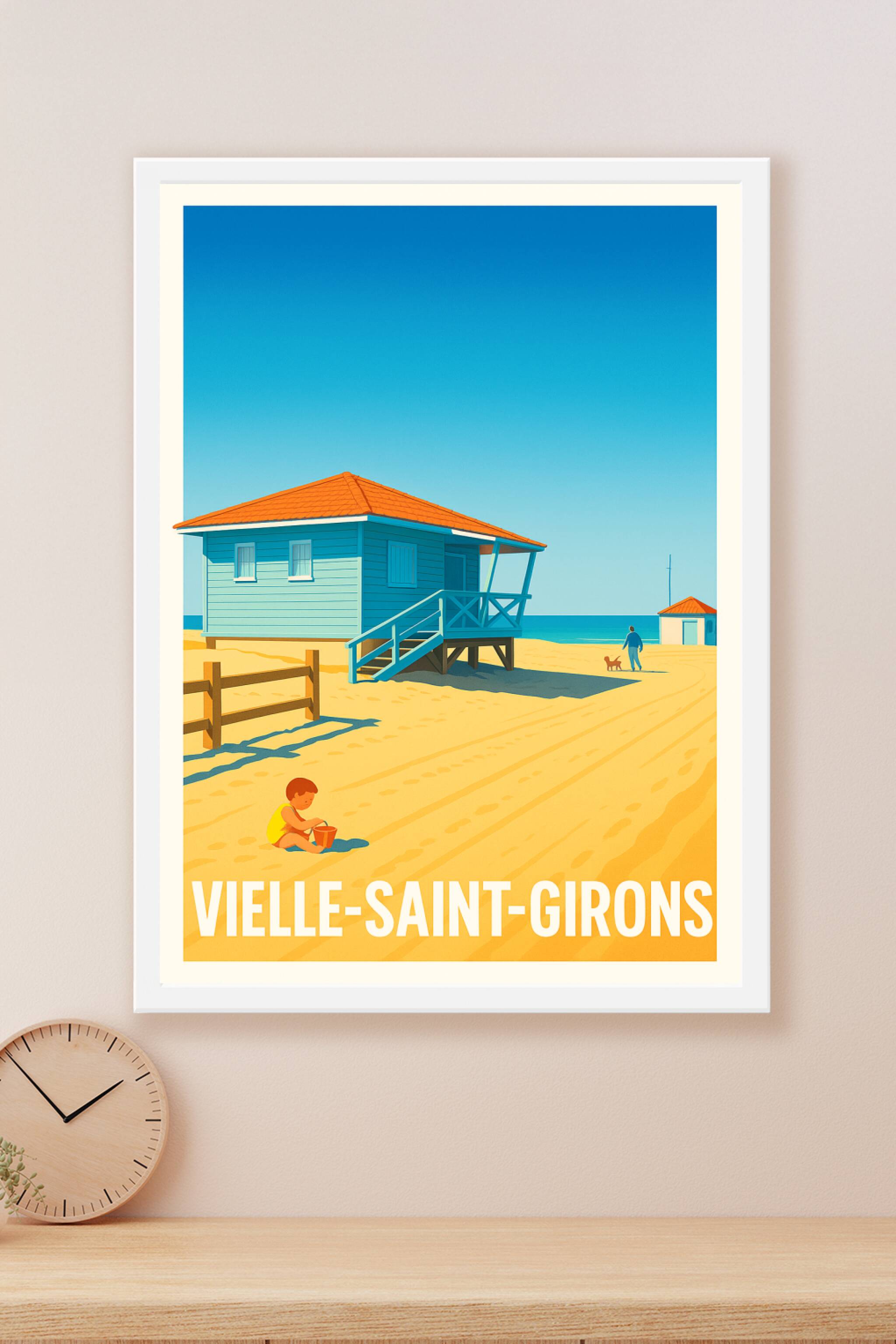 Découvrez la quiétude et la douceur de vivre à Vielle-Saint-Girons avec cette affiche au style épuré et lumineux. Le poster met en scène une cabane...