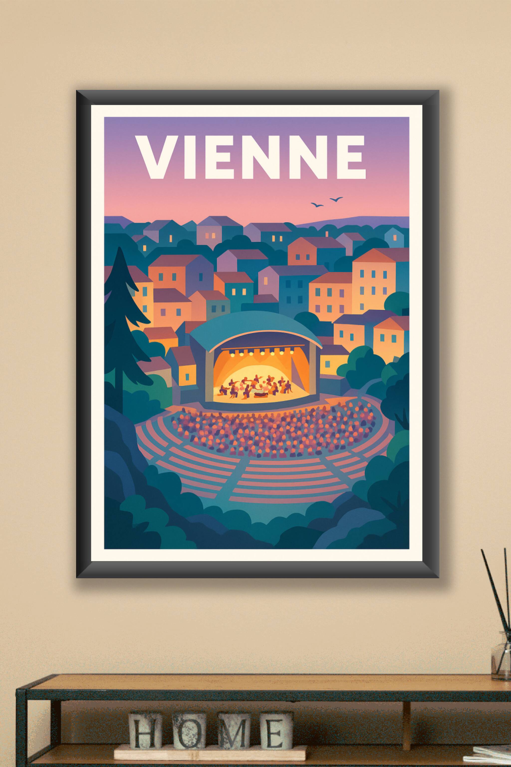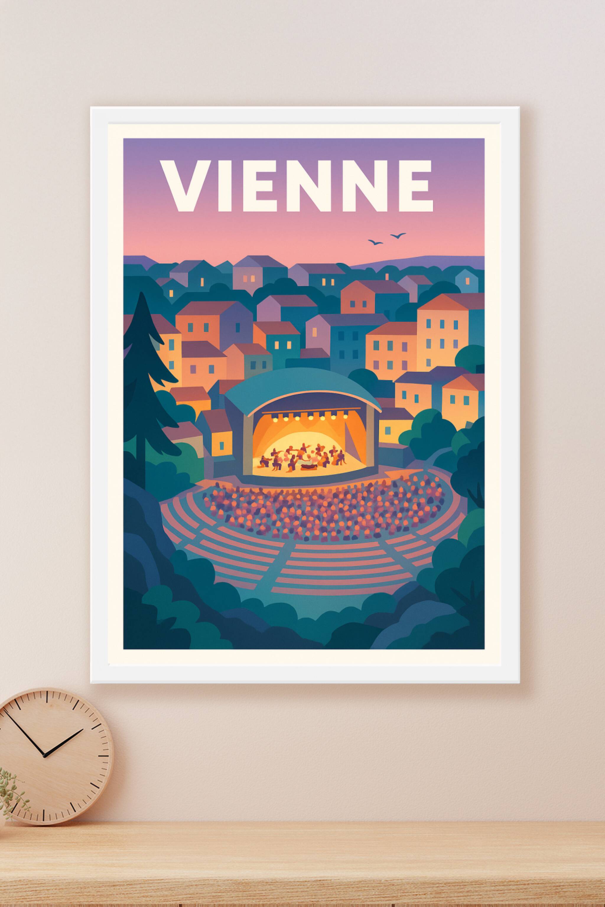 Découvrez la chaleur et l'animation de Vienne à travers ce poster illustré, qui met en scène un amphithéâtre en plein air baigné par la lumière dou...