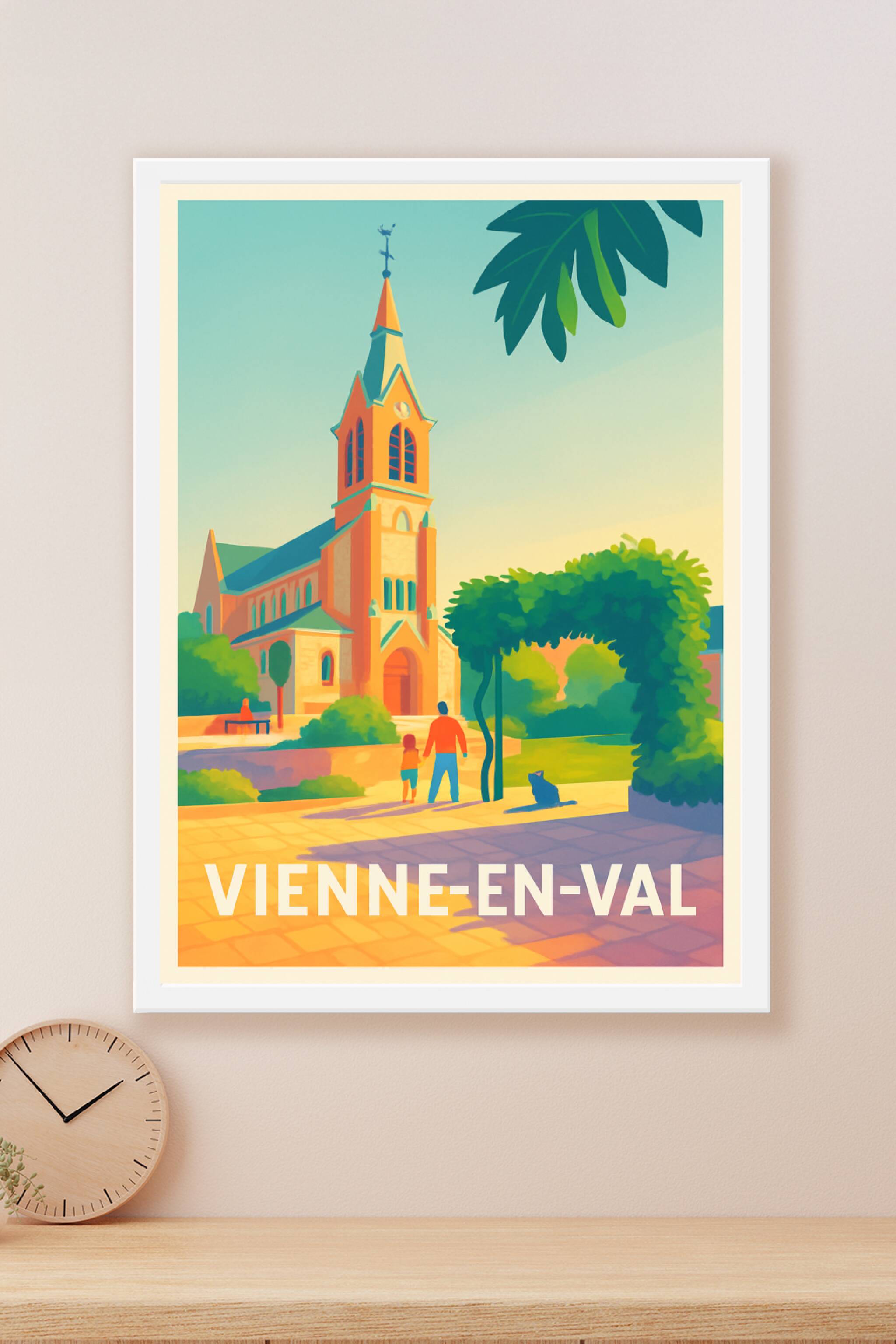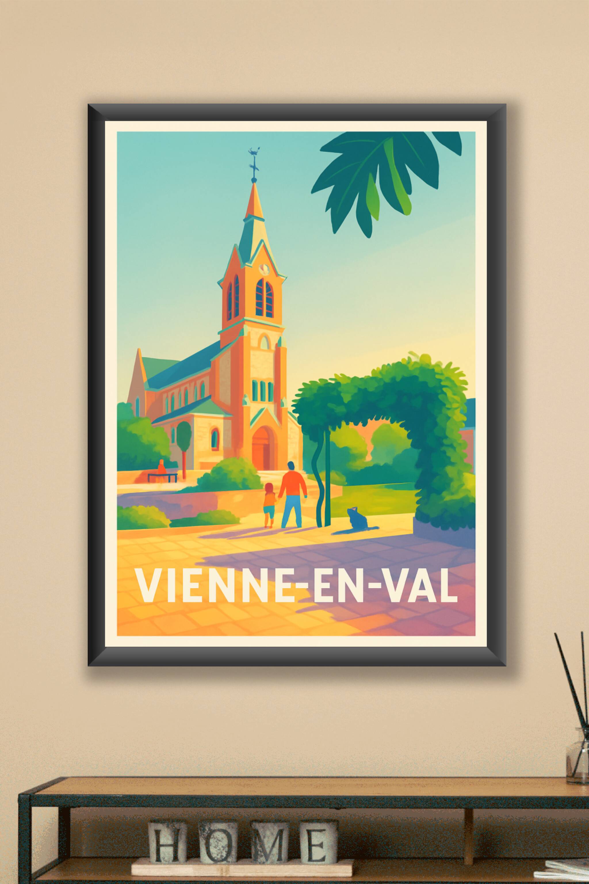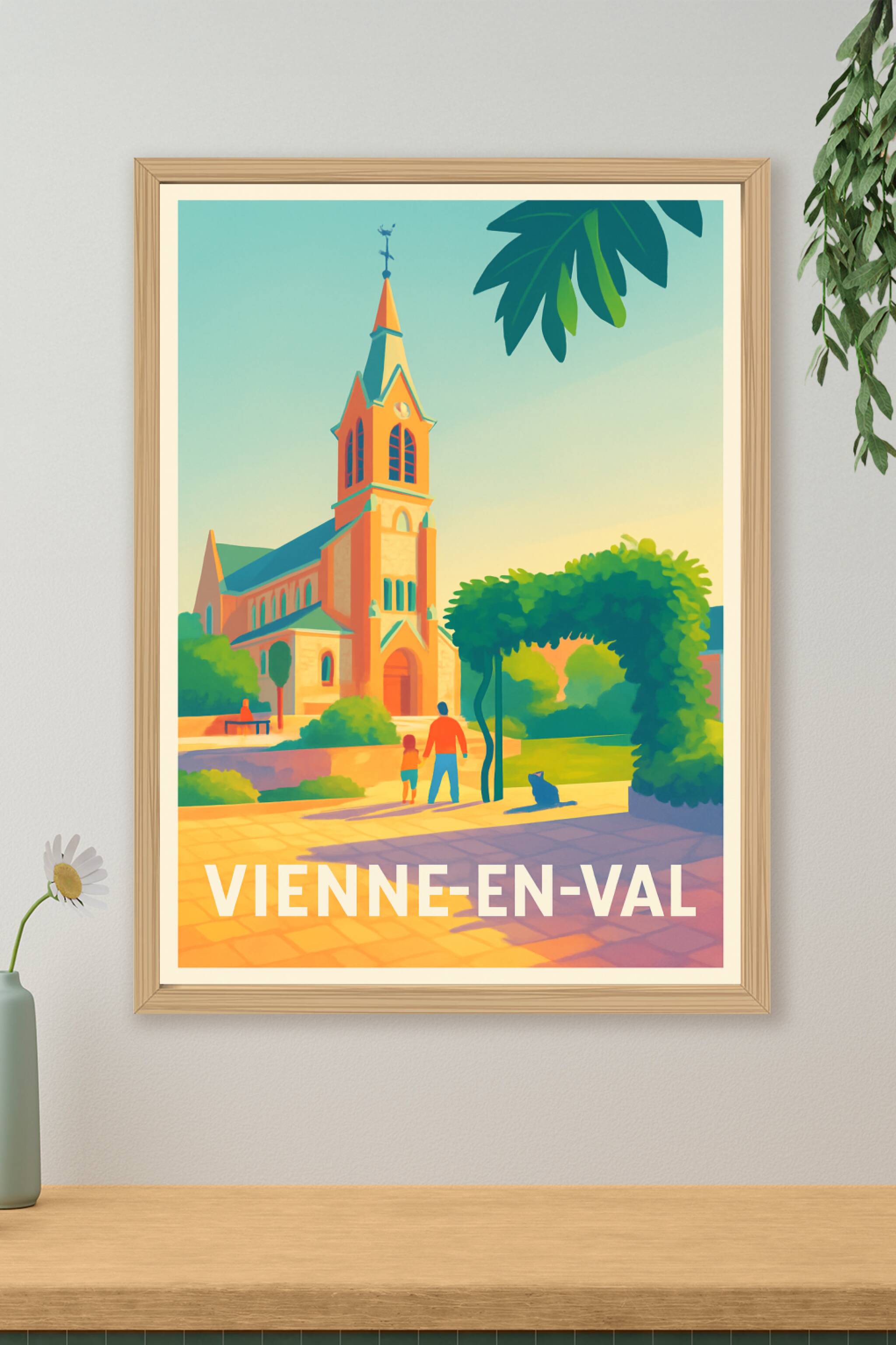 Découvrez l'ambiance paisible et pleine de charme de Vienne-en-Val à travers cette affiche illustrée au style vintage lumineux. Le poster met en sc...