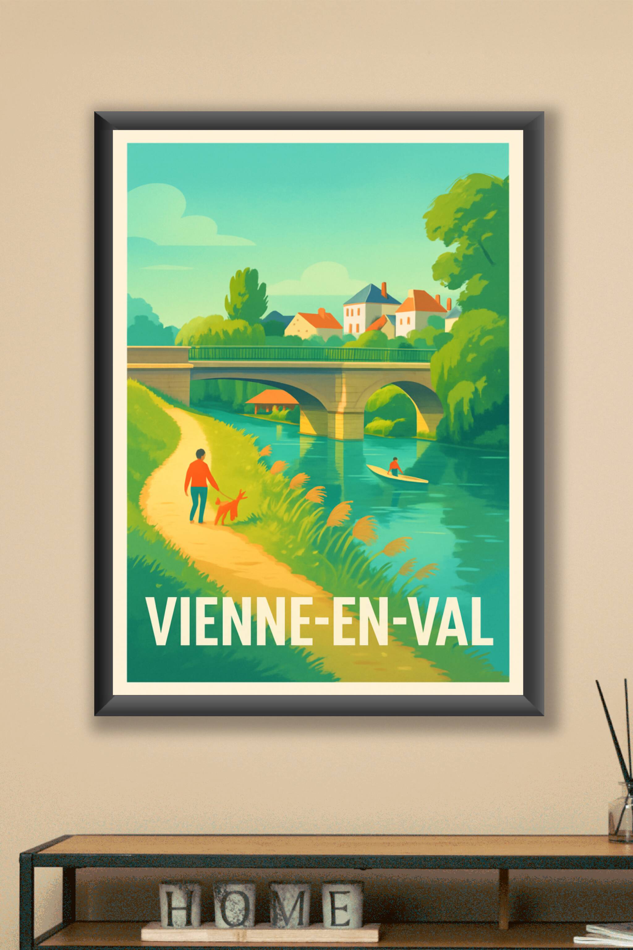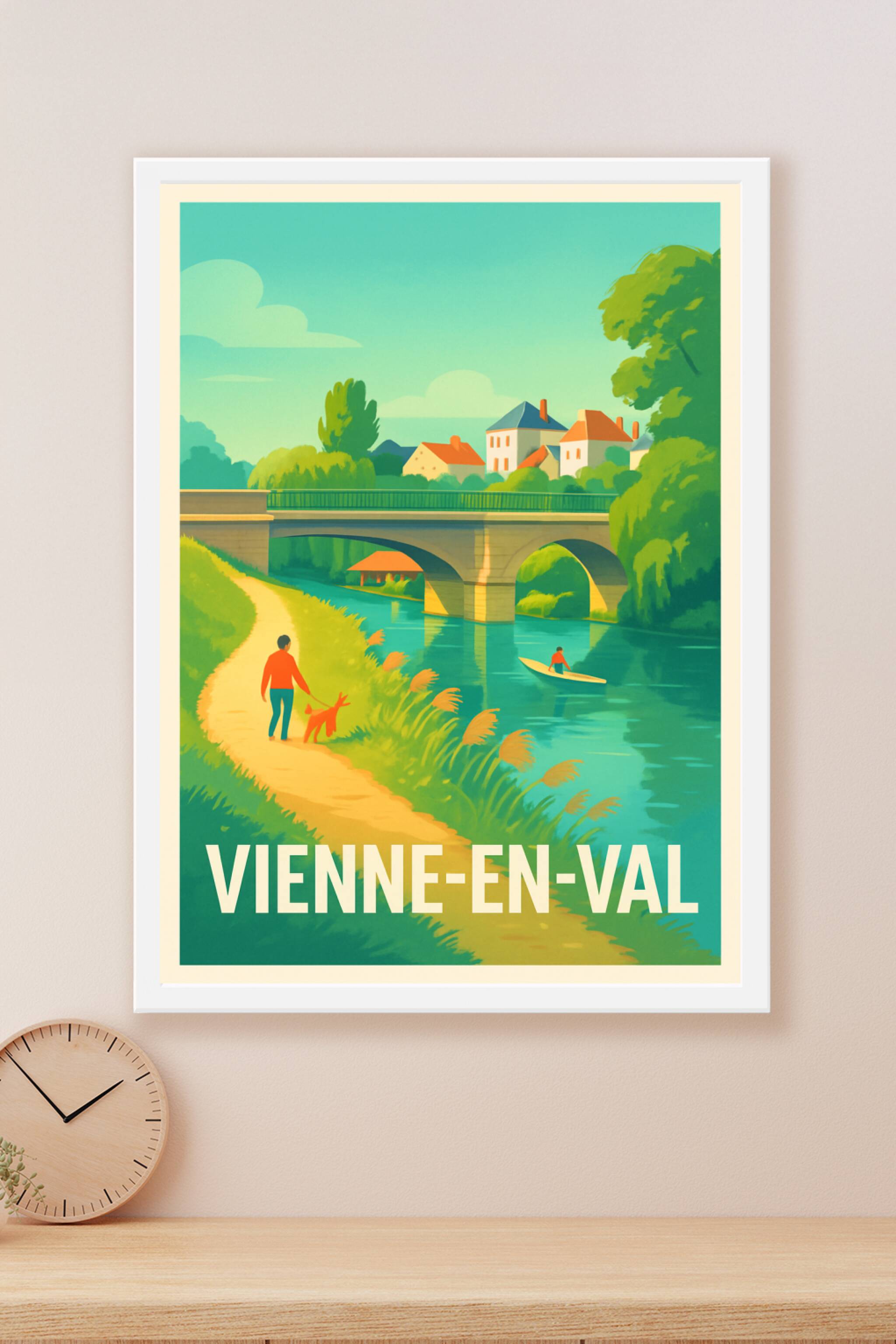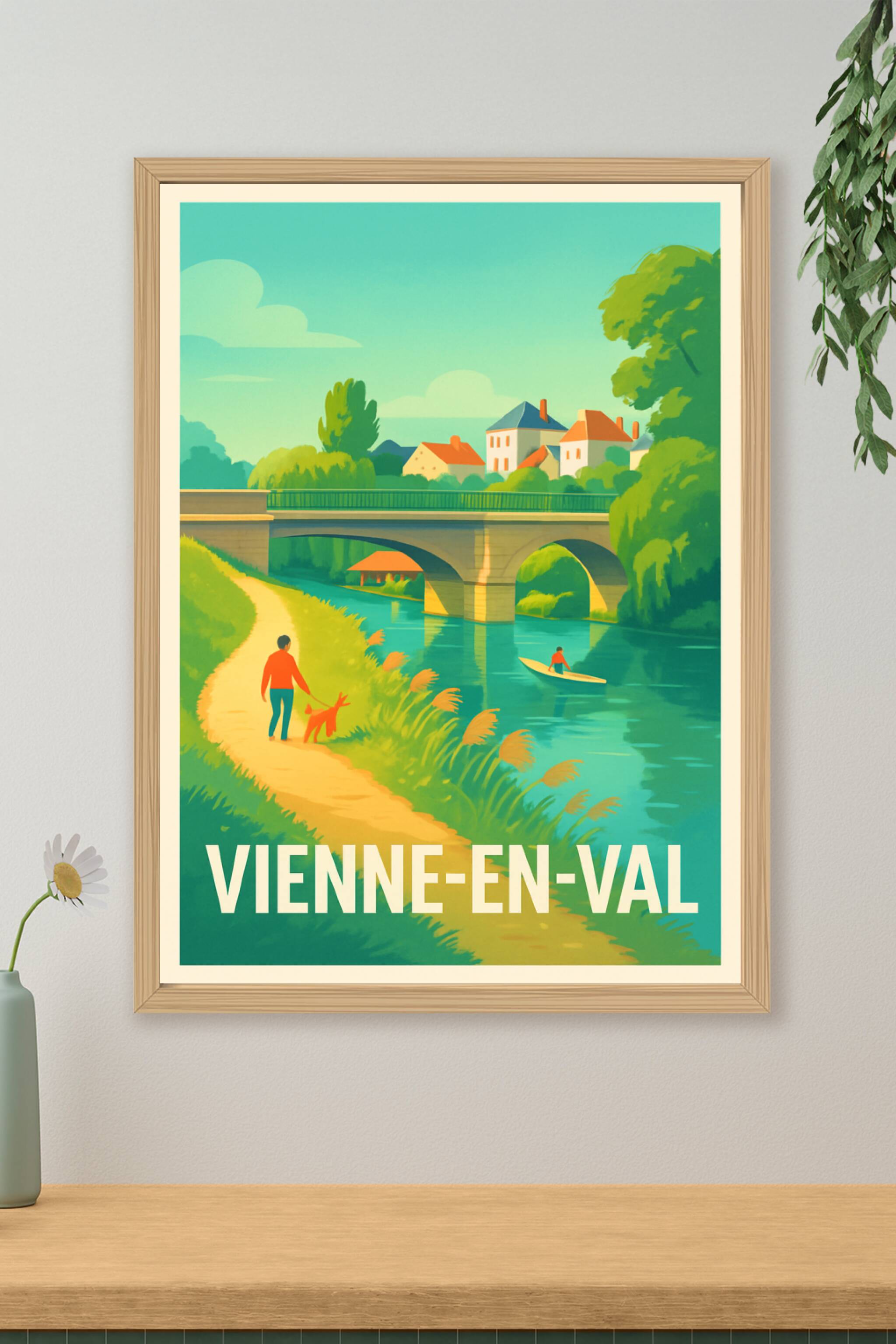 Découvrez le charme paisible de Vienne-en-Val avec cette affiche illustrée captivante qui met en scène une promenade bucolique le long de la rivièr...