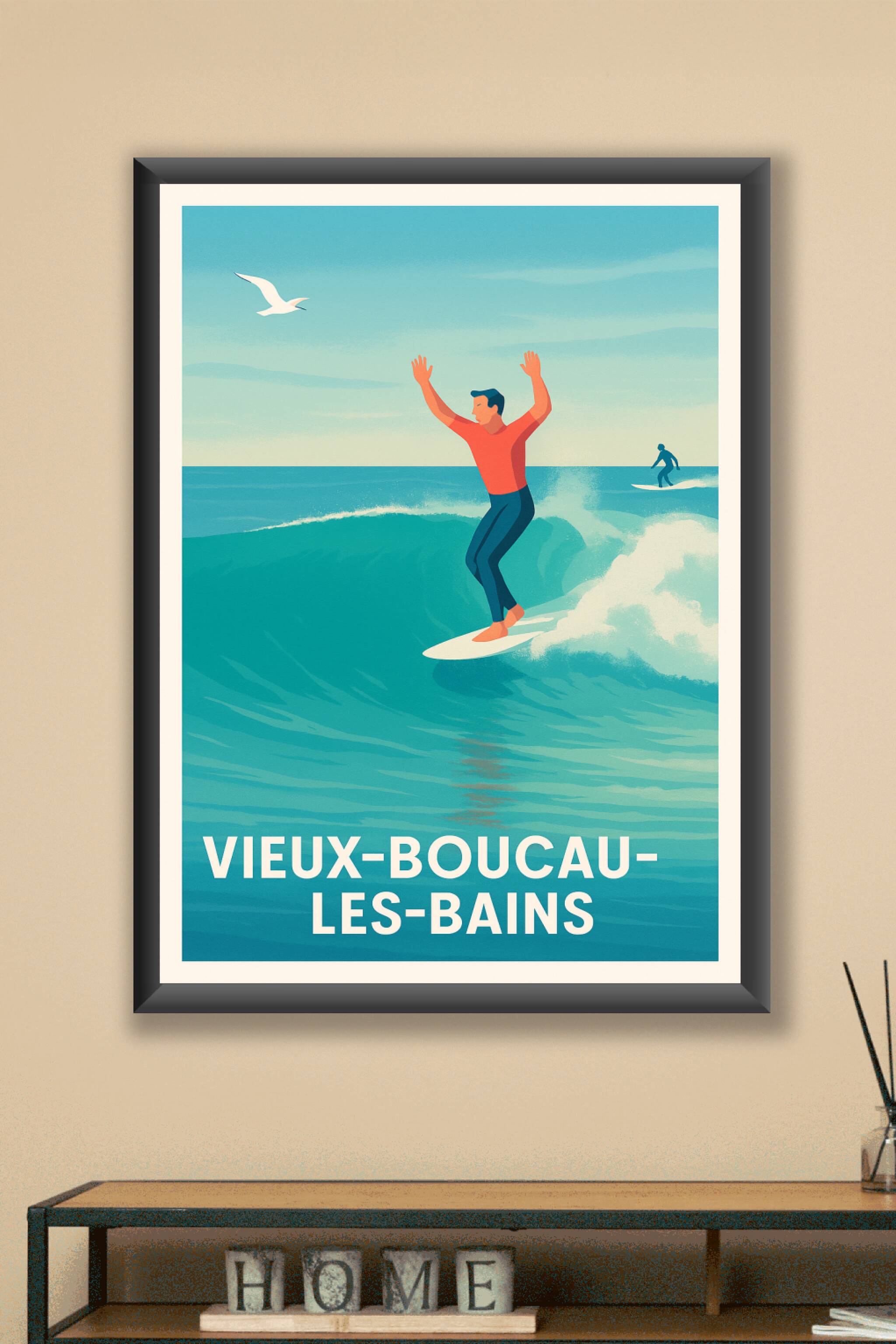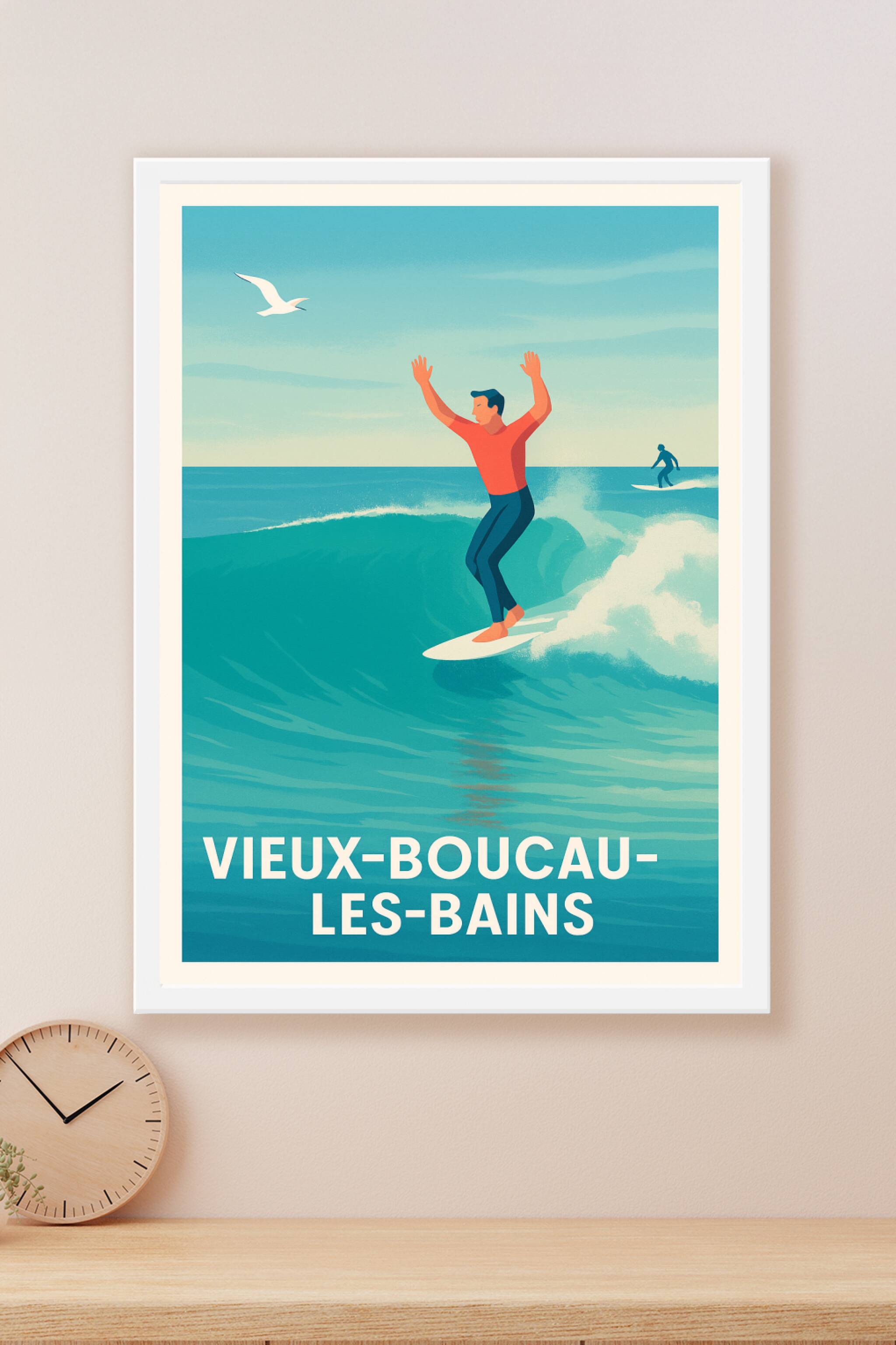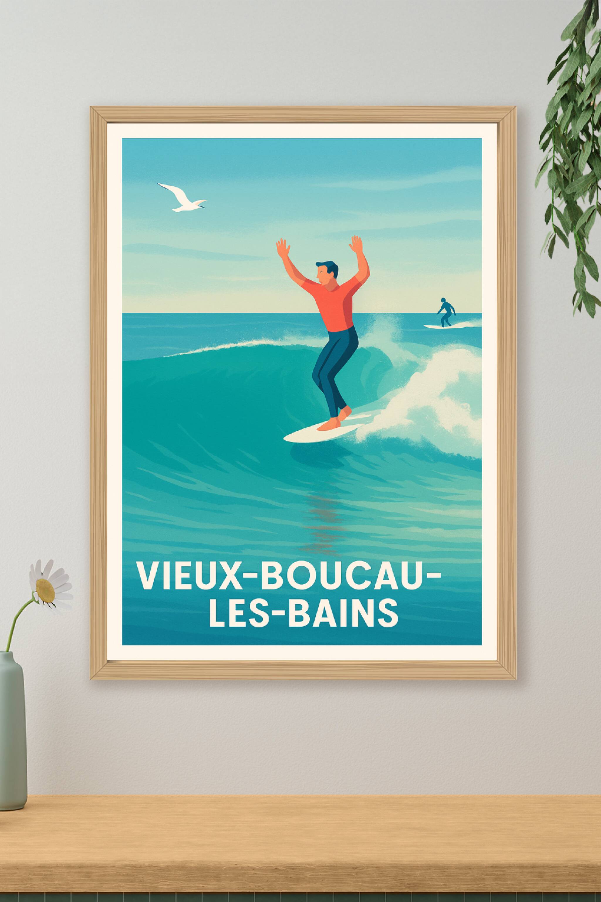 Découvrez l'ambiance apaisante et dynamique de Vieux-Boucau-les-Bains avec cette affiche illustrée mettant en scène un surfeur en équilibre sur les...