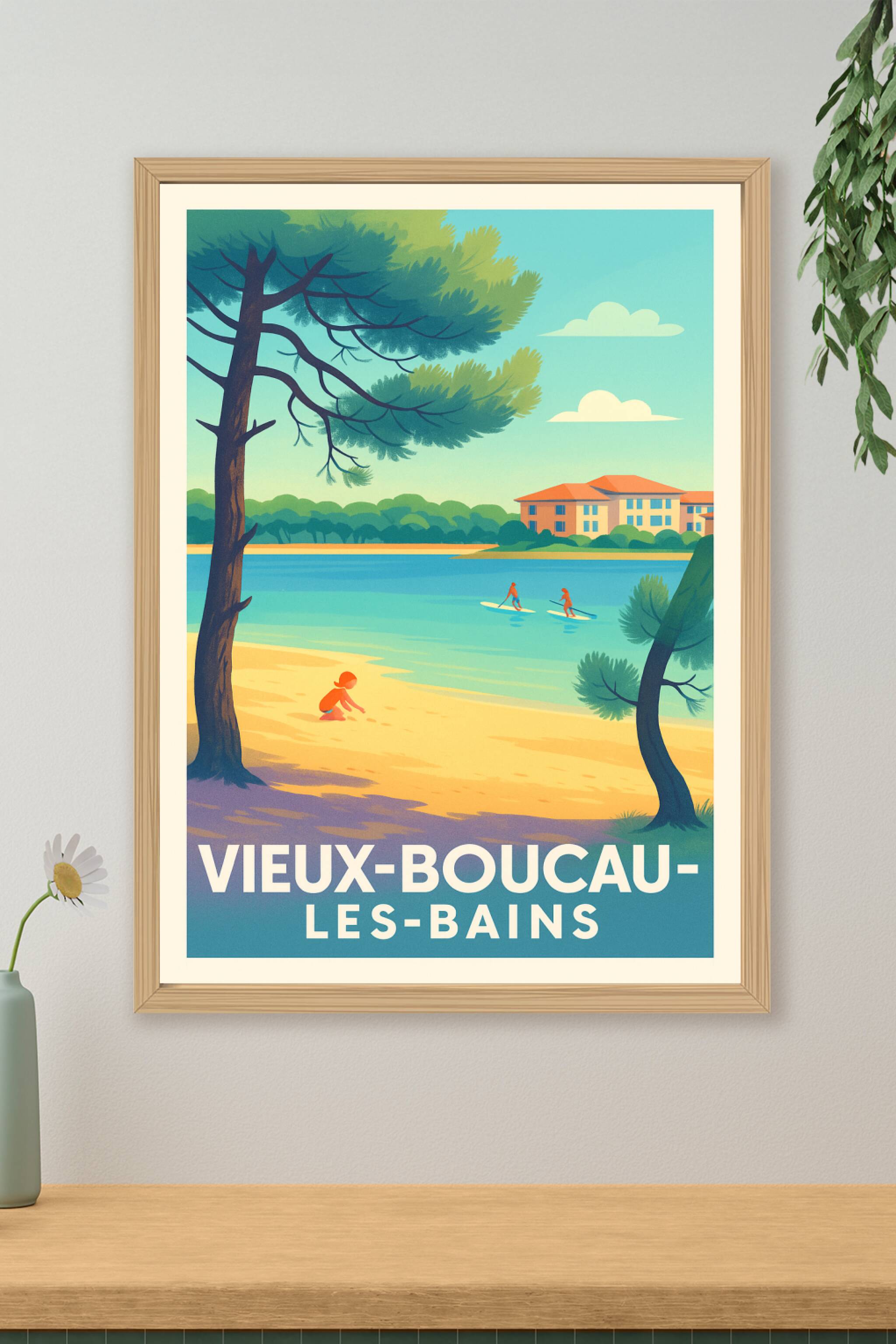 Découvrez la douceur de vivre au bord de l'eau avec cette affiche illustrée qui capture l'atmosphère paisible de Vieux-Boucau-les-Bains. Entre sabl...