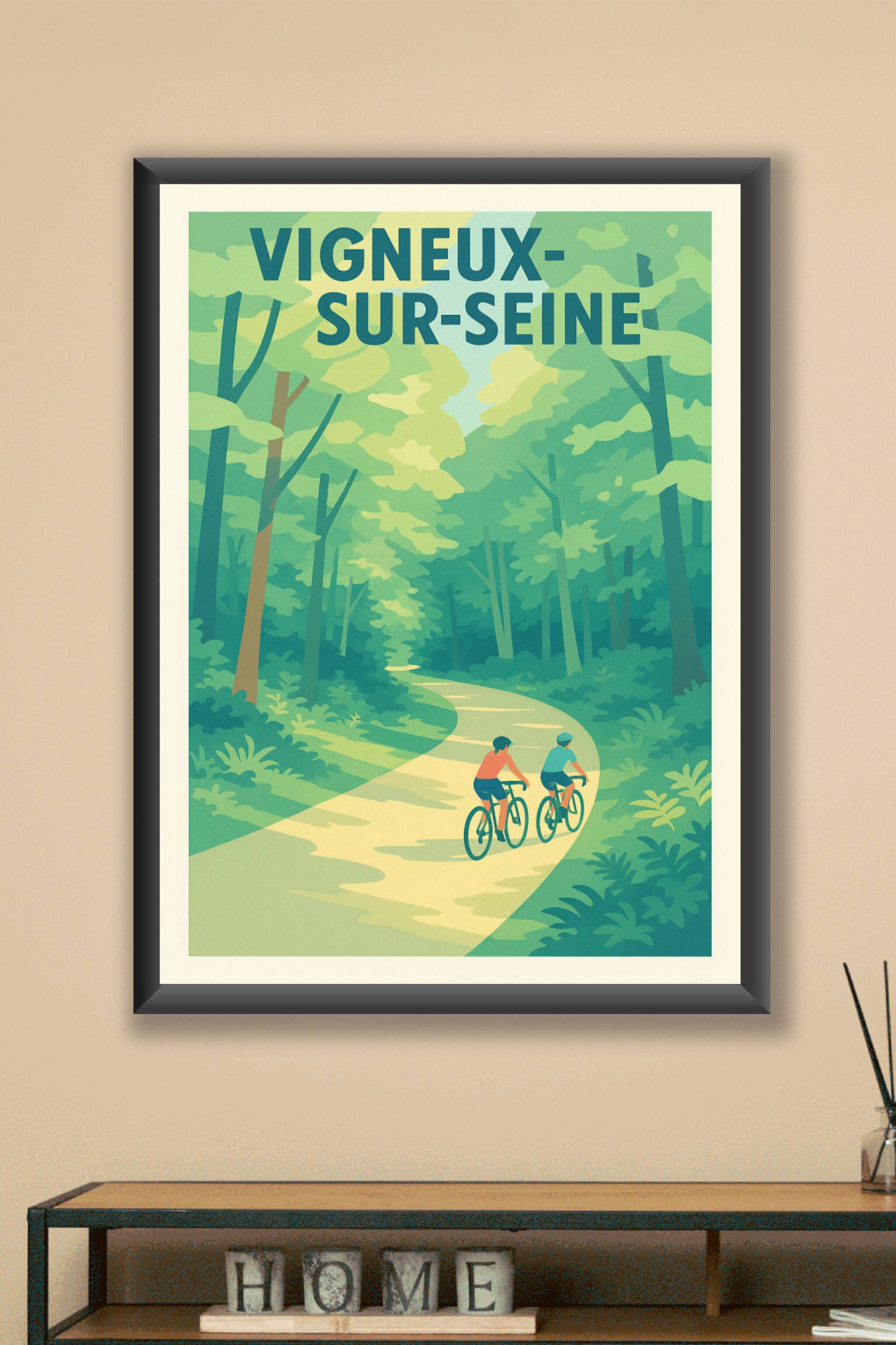 Découvrez la sérénité de Vigneux-sur-Seine avec cette affiche au design épuré mettant en scène une balade à vélo au cœur d'une forêt verdoyante. Ce...