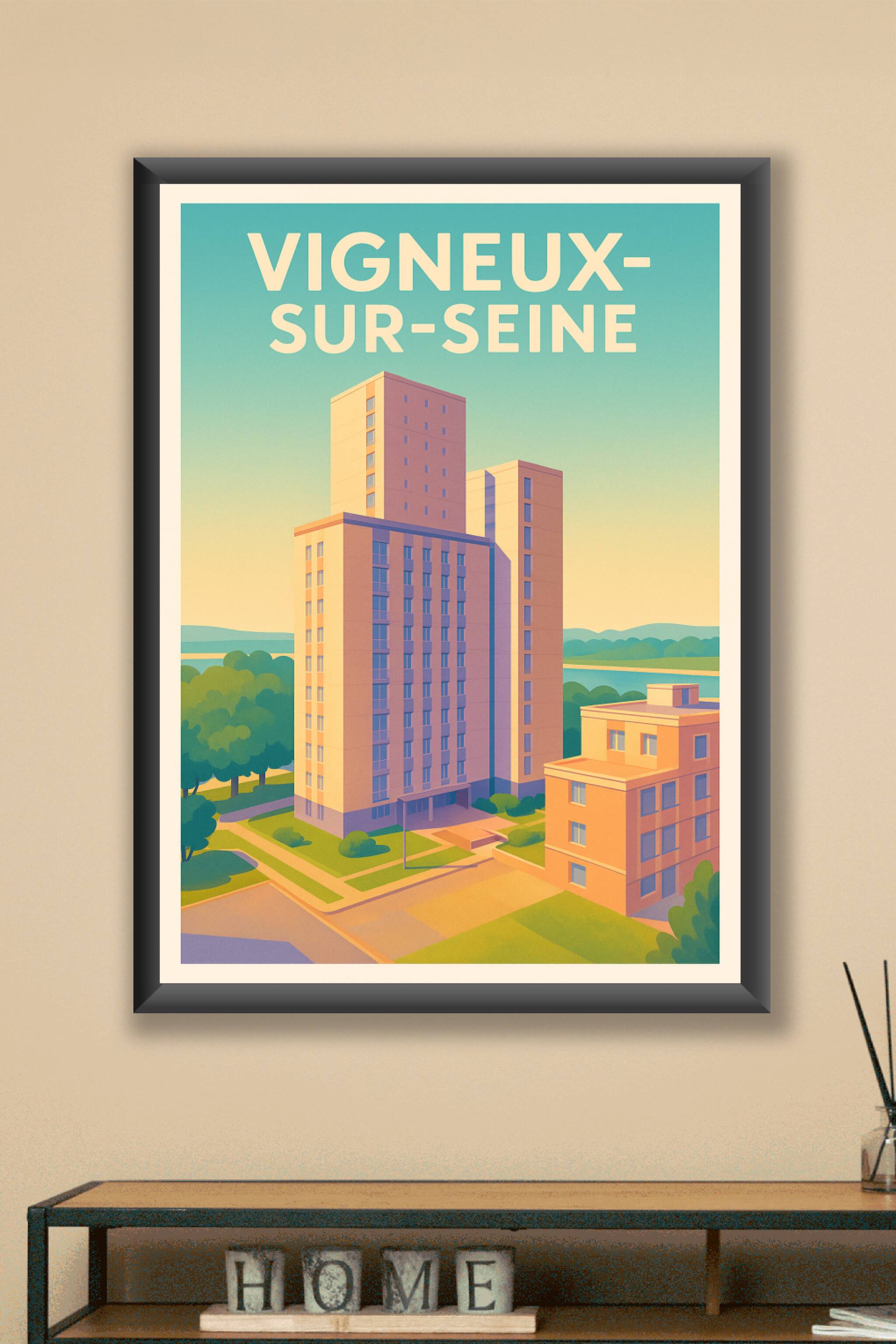 Découvrez cette affiche illustrée qui capture l'essence tranquille de Vigneux-sur-Seine avec ses élégants immeubles baignés par la lumière douce du...
