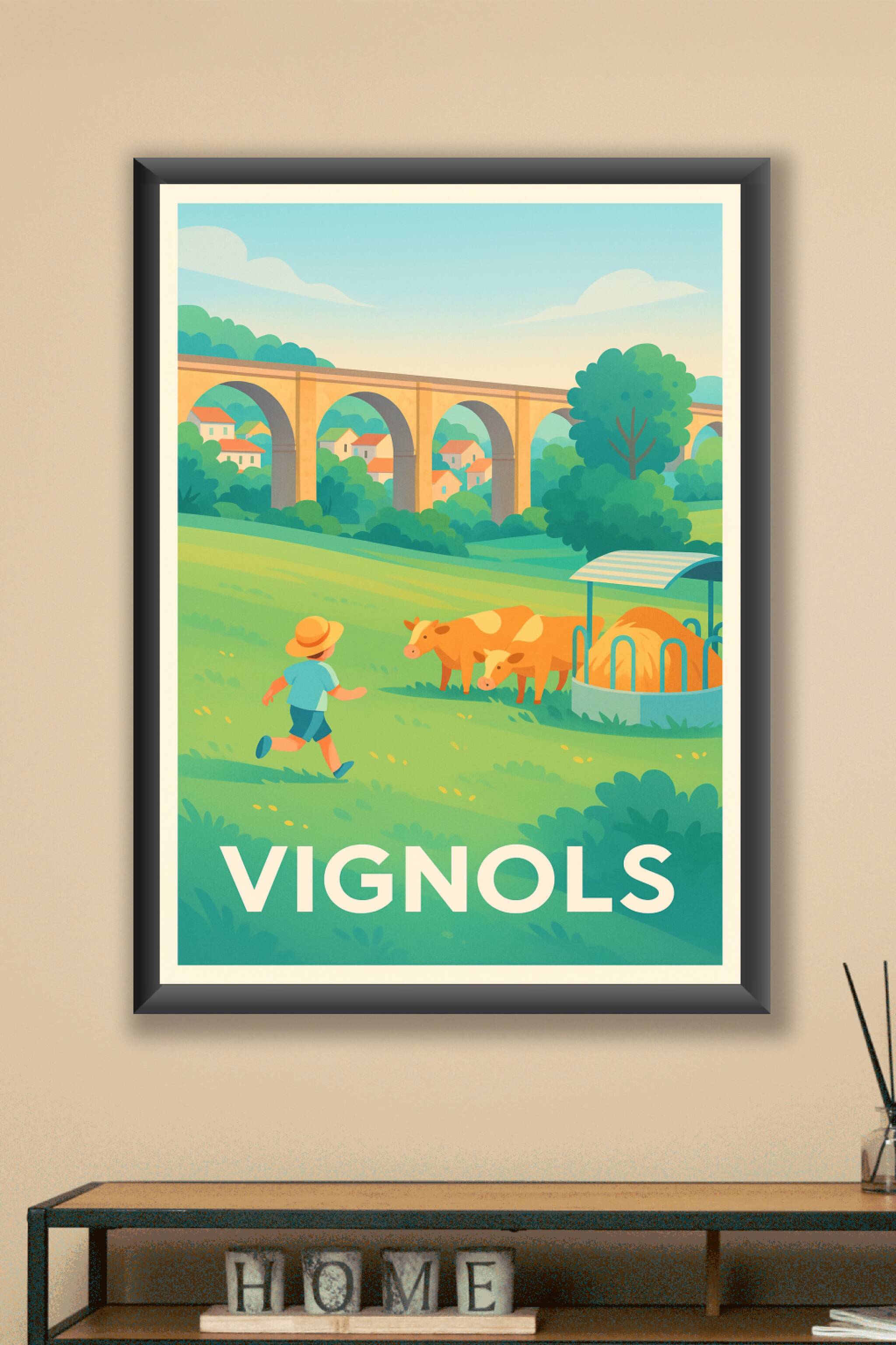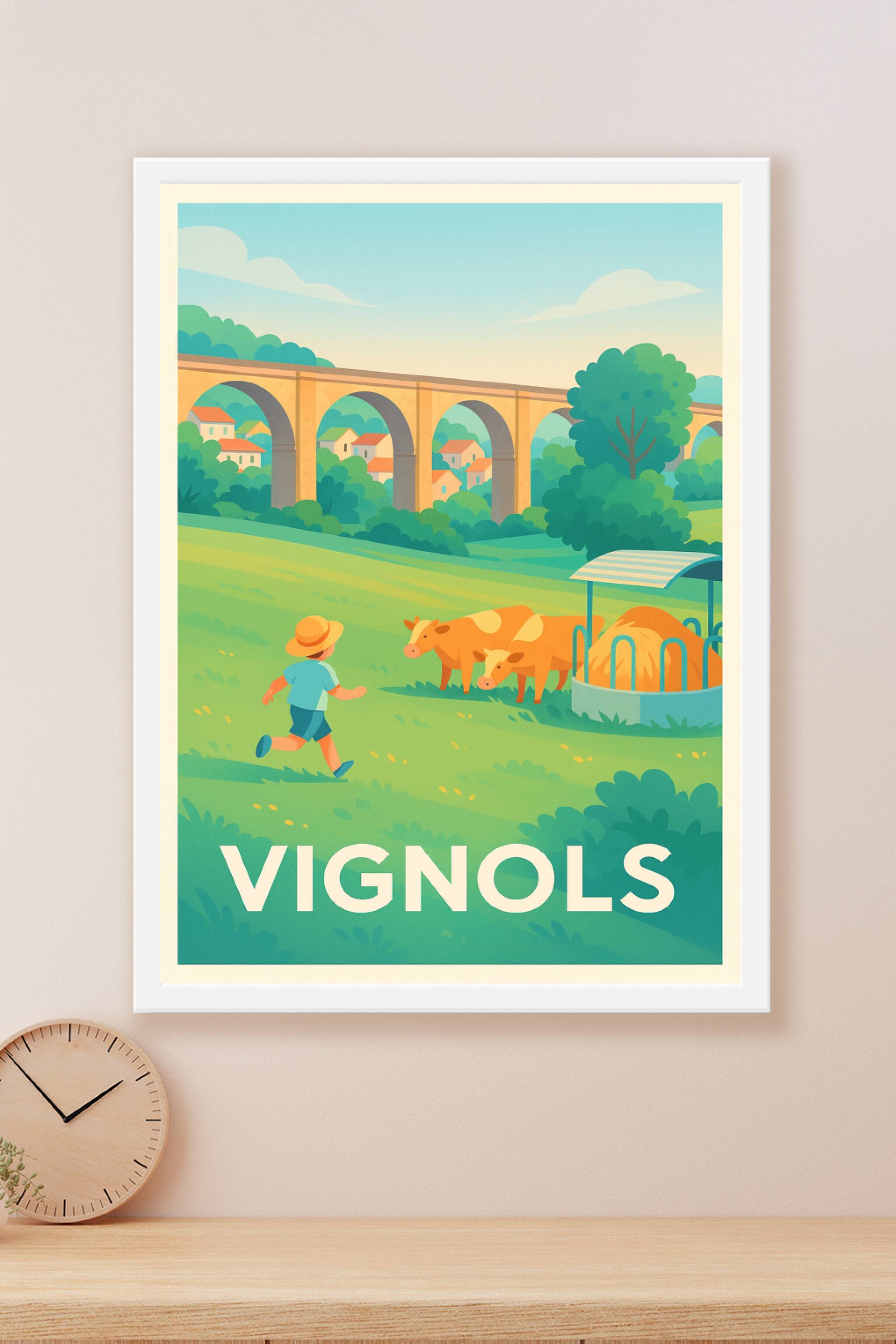 Découvrez le charme paisible de Vignols avec cette affiche illustrée aux couleurs douces et chaleureuses. Cette scène bucolique met en avant la beauté des paysages ruraux de Limousin avec ses prairies verdoyantes, son viaduc historique et ses vaches dans un cadre serein.Ce poster est imprimé en tirage "Fine Art" sur un papier 305g coton de haute qualité, garantissant des couleurs vives et une durabilité exceptionnelle. Disponible en formats A1 à A4, avec ou sans cadre, il s'adapte parfaitement à tout style d'intérieur. 100% fabriqué en France, ce tirage premium est idéal pour apporter une touche authentique et naturelle à votre décoration ou pour offrir un souvenir unique de la région.