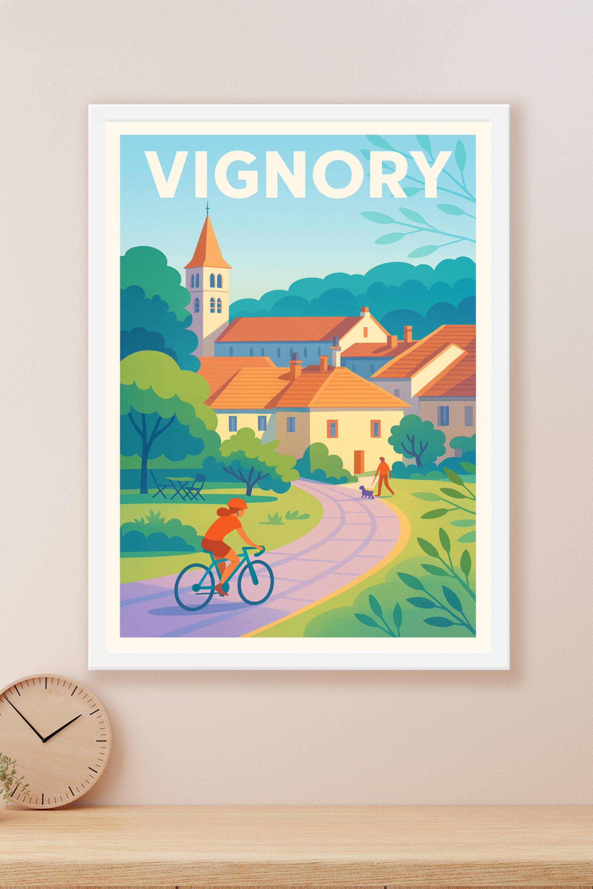 Découvrez le charme authentique de Vignory à travers cette affiche illustrée au style rétro et coloré. Cette scène paisible met en valeur la douceur de vivre du village avec ses maisons aux toits rouges, ses espaces verts et ses habitants en pleine promenade ou balade à vélo. Ce poster, parfait pour habiller votre intérieur ou offrir en cadeau, est imprimé en tirage "Fine Art" sur un papier coton 305g de haute qualité, assurant des couleurs éclatantes et une excellente tenue dans le temps. Disponible en formats A1 à A4, avec ou sans cadre, cette affiche apportera une touche chaleureuse et élégante à votre décoration, alliant art et souvenir authentique de Vignory.