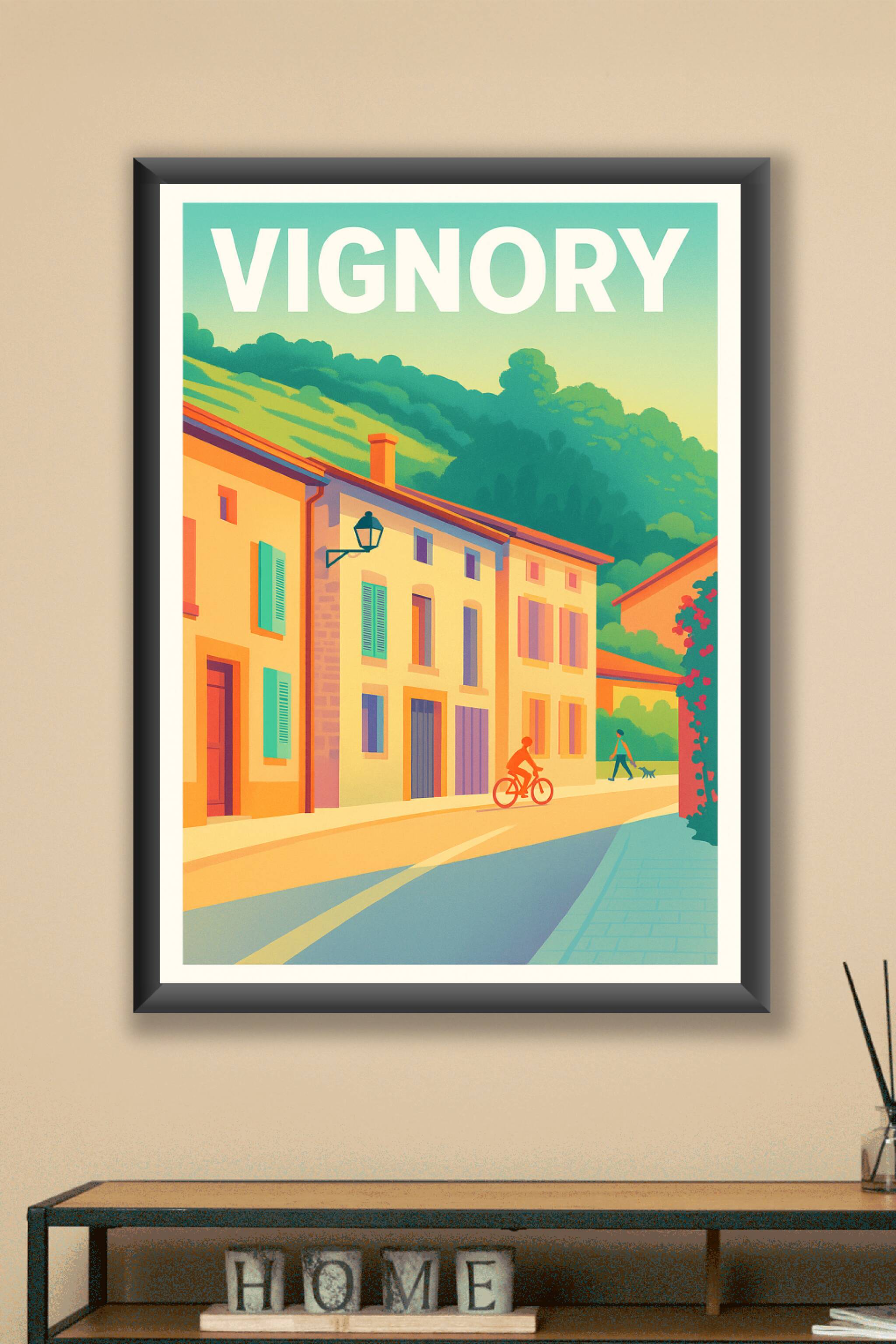 Découvrez l'atmosphère paisible et lumineuse de Vignory avec cette affiche au style graphique vintage et couleurs chaudes. Le poster capture une sc...