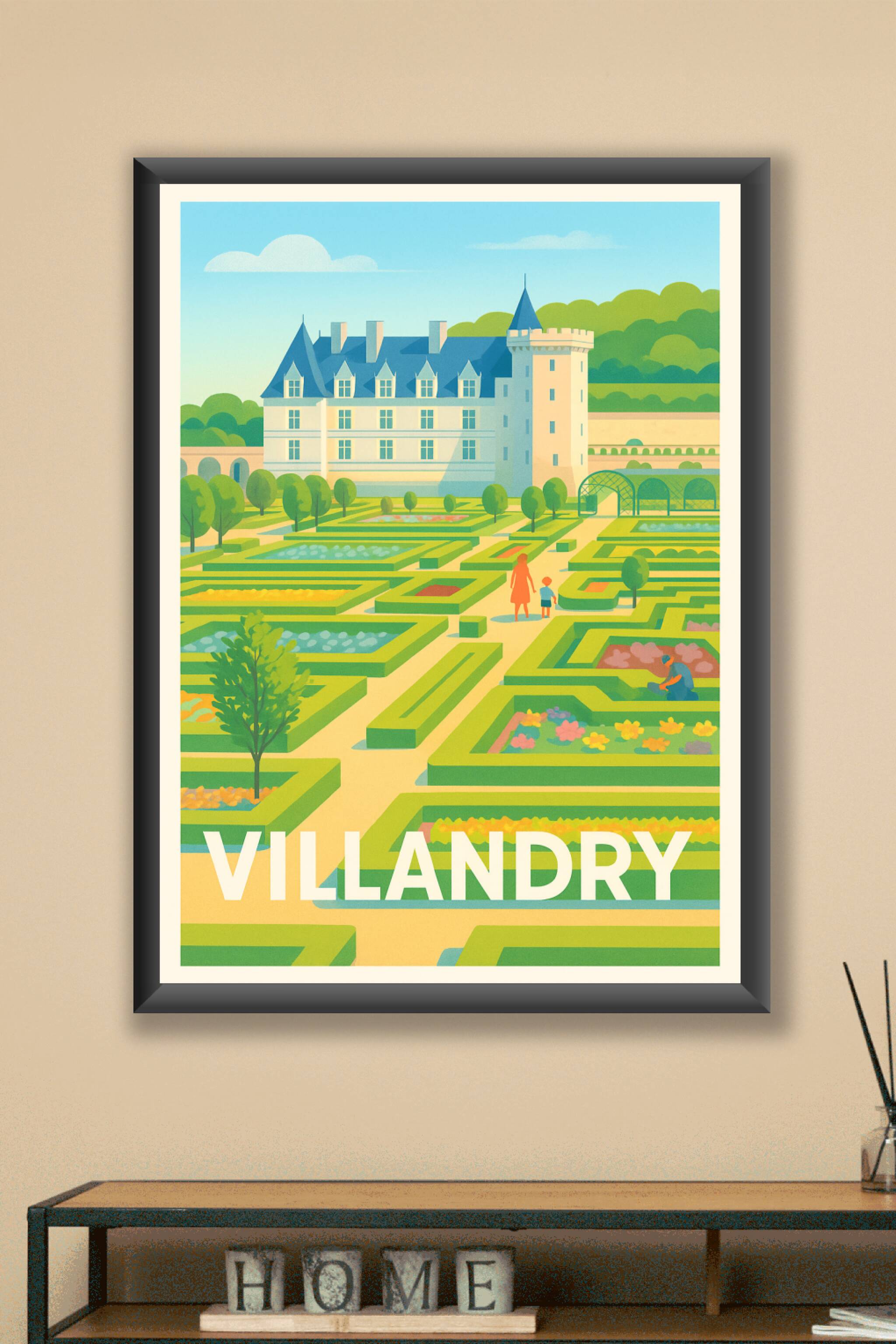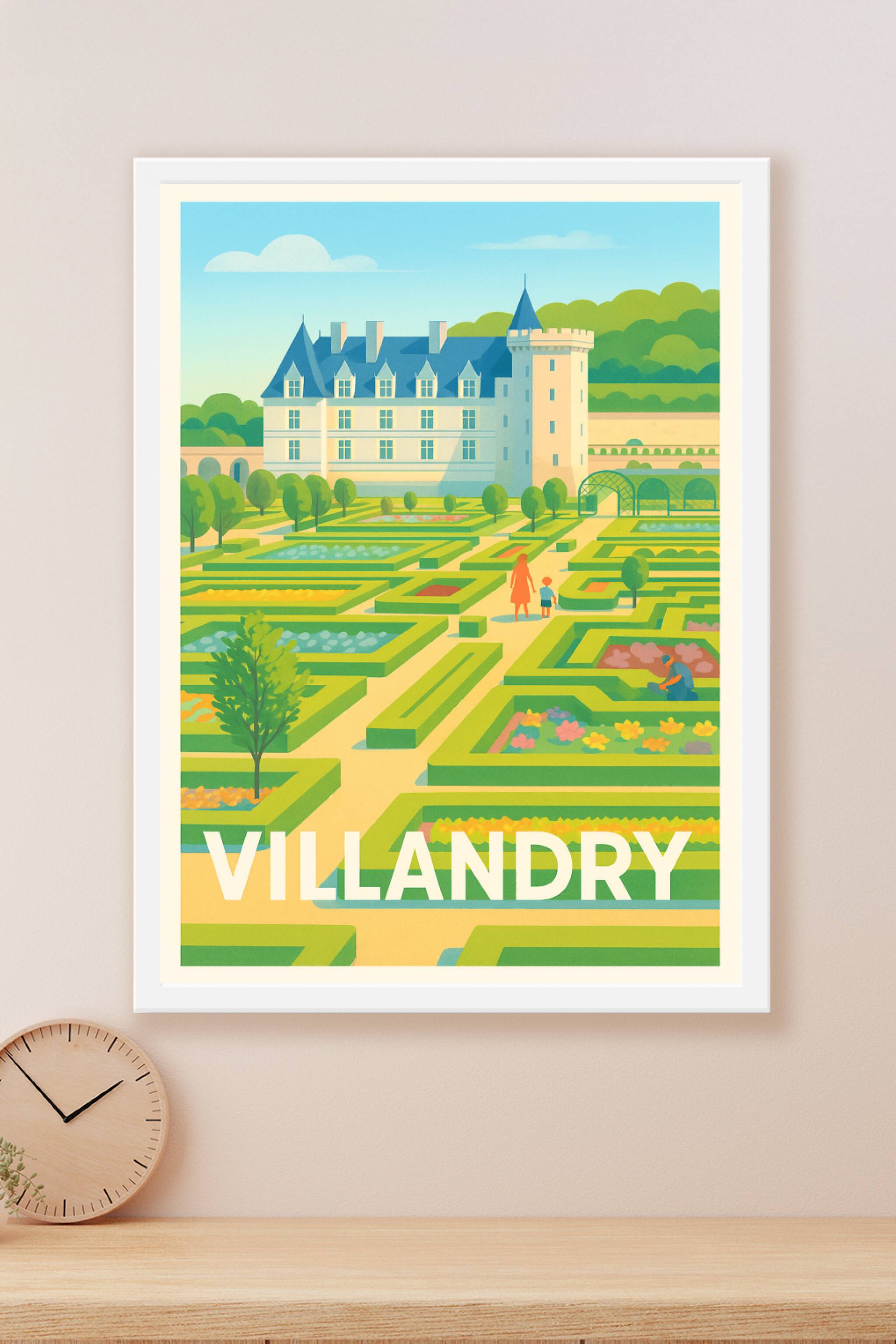 Découvrez la beauté paisible des célèbres jardins de Villandry à travers cette affiche illustrée au style lumineux et graphique. Ce poster met en v...