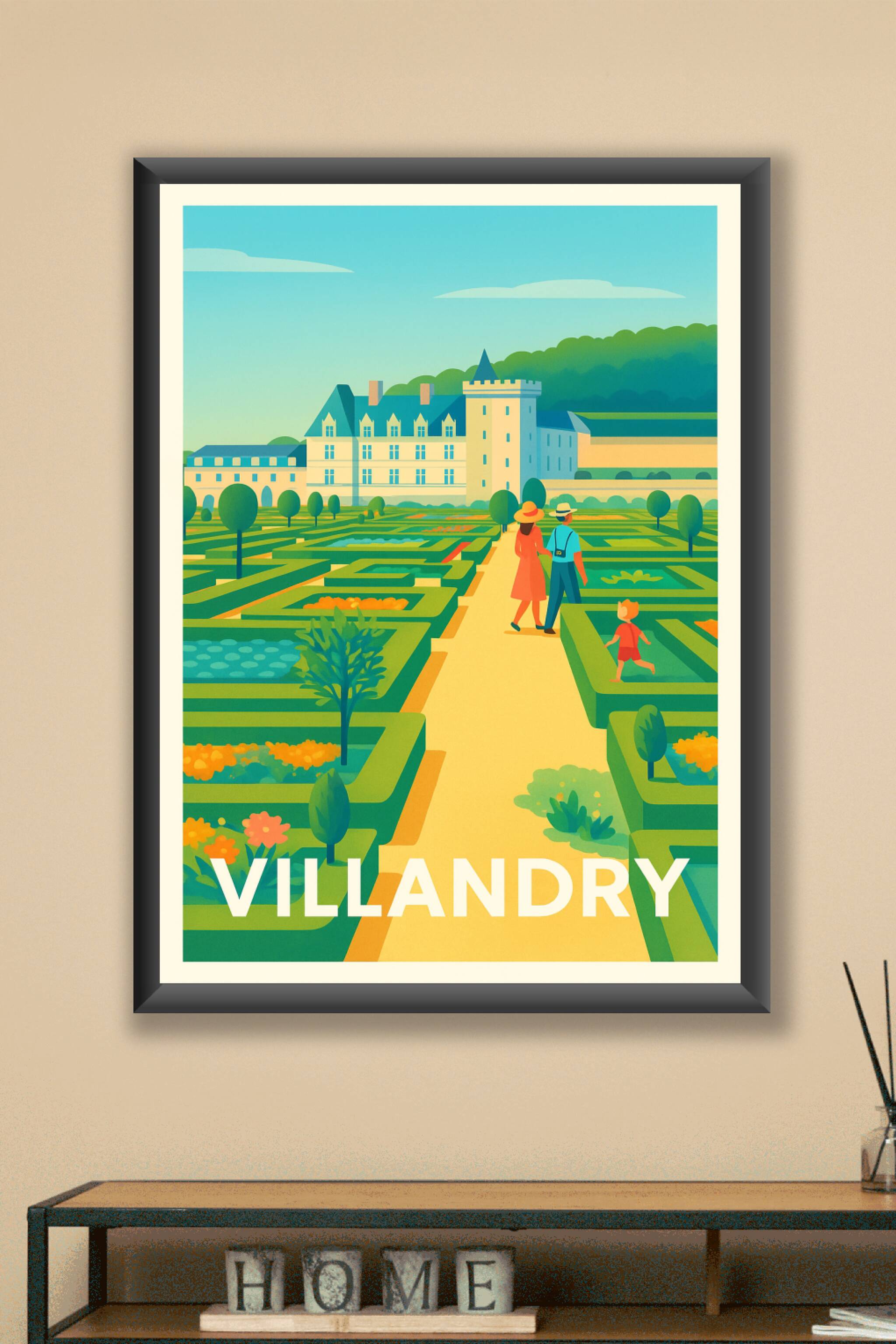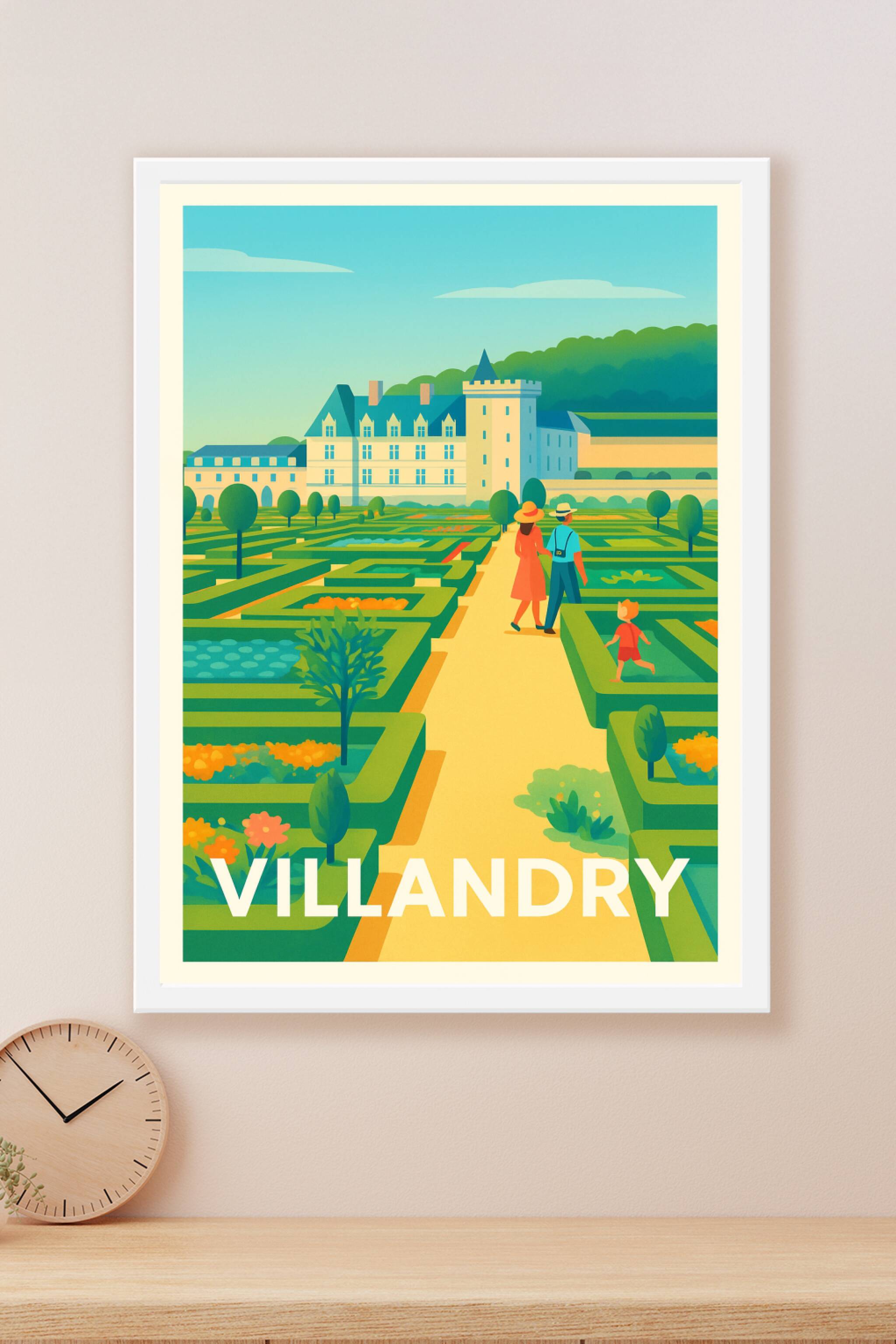 Découvrez la sérénité et la beauté des célèbres jardins du château de Villandry à travers cette affiche illustrée aux couleurs lumineuses et stylis...