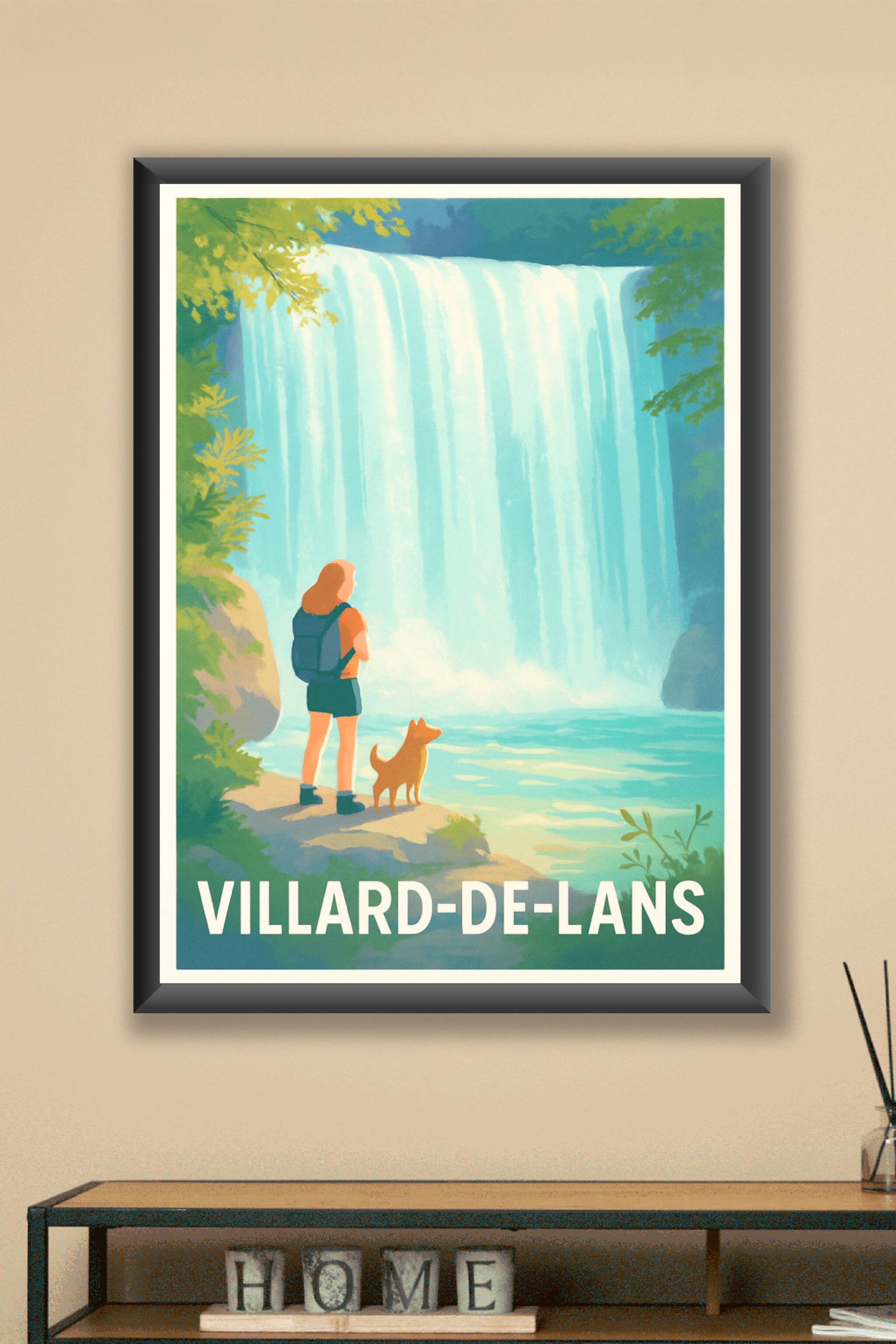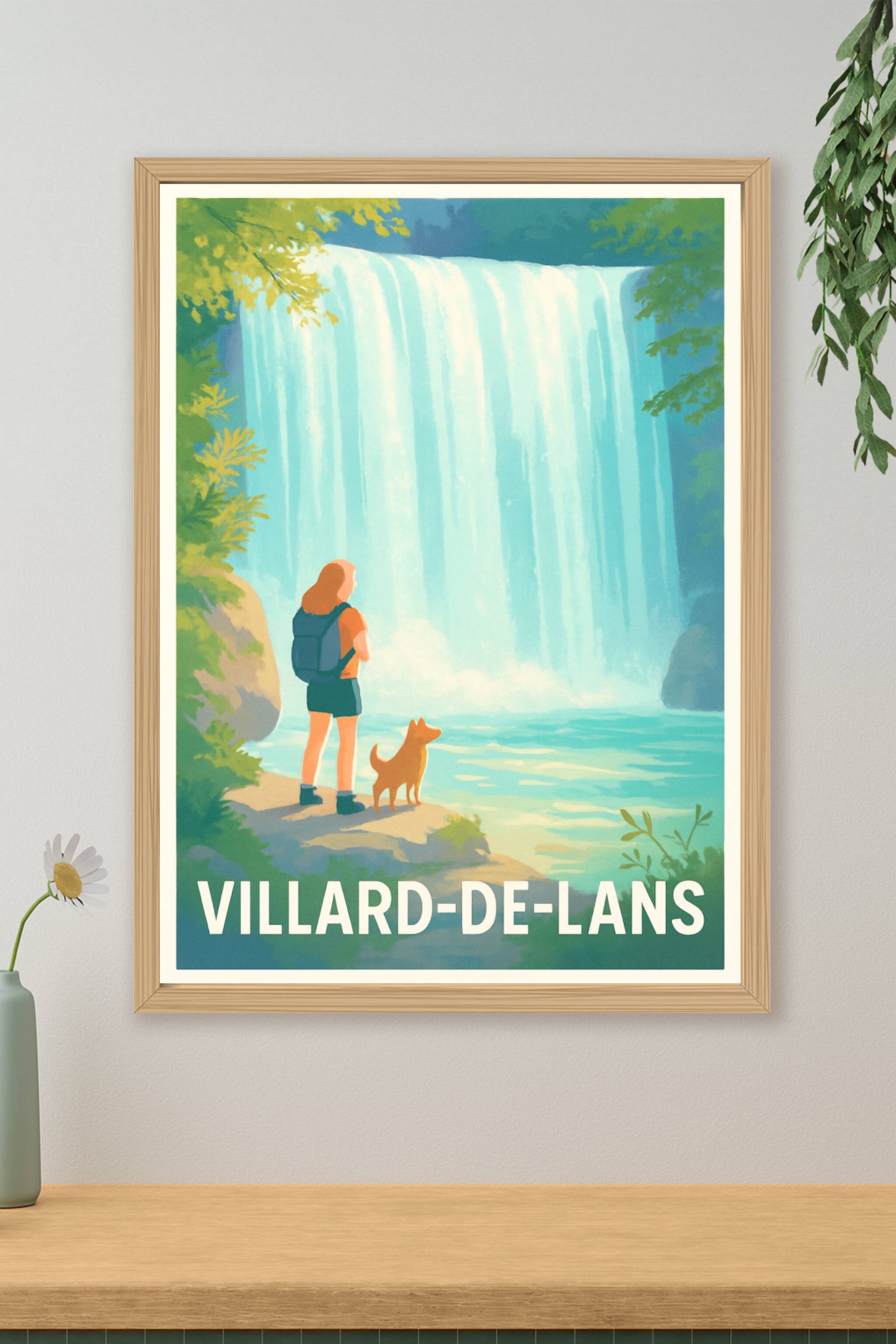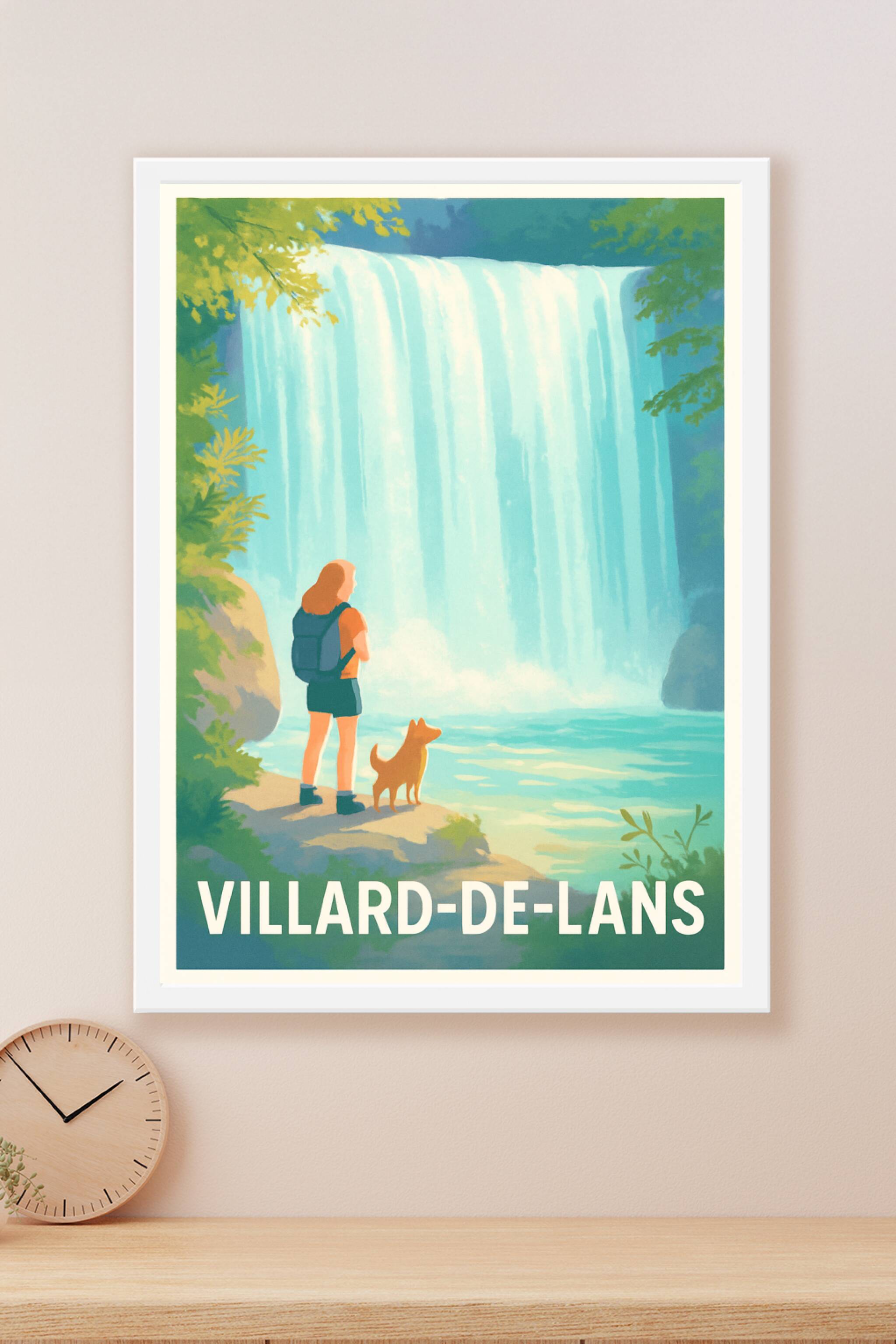 Découvrez la beauté naturelle de Villard-de-Lans avec cette affiche illustrée mettant en scène une cascade majestueuse et une promenade contemplati...