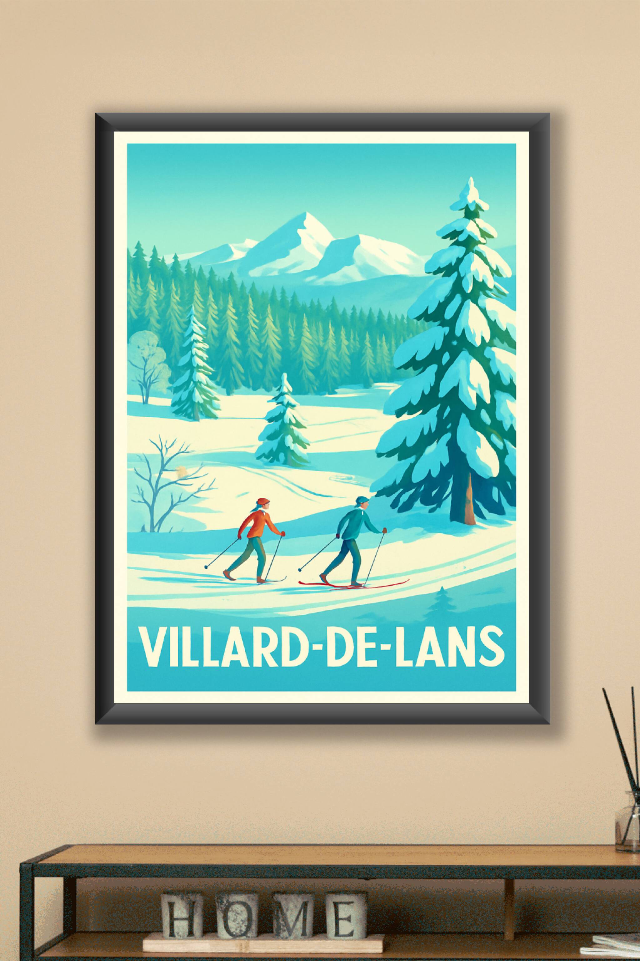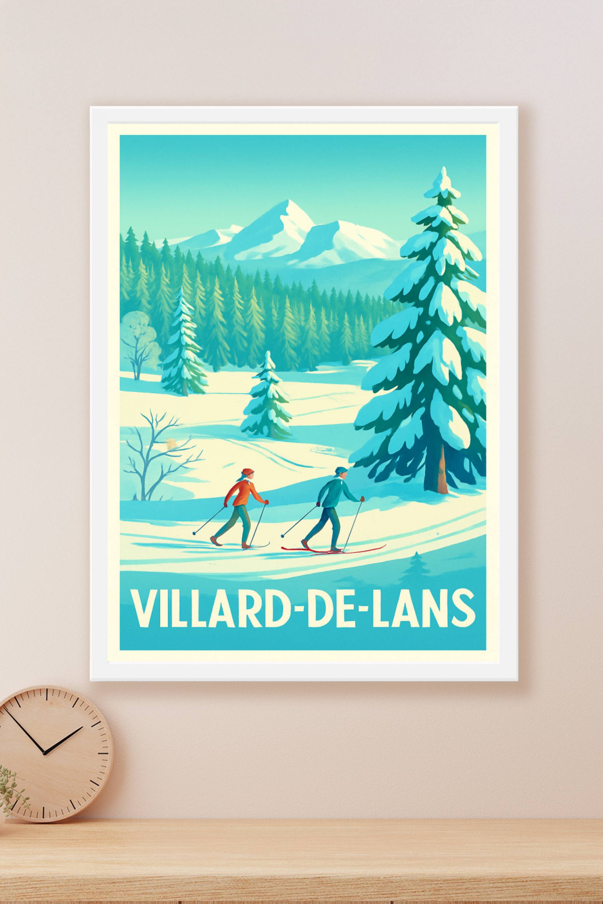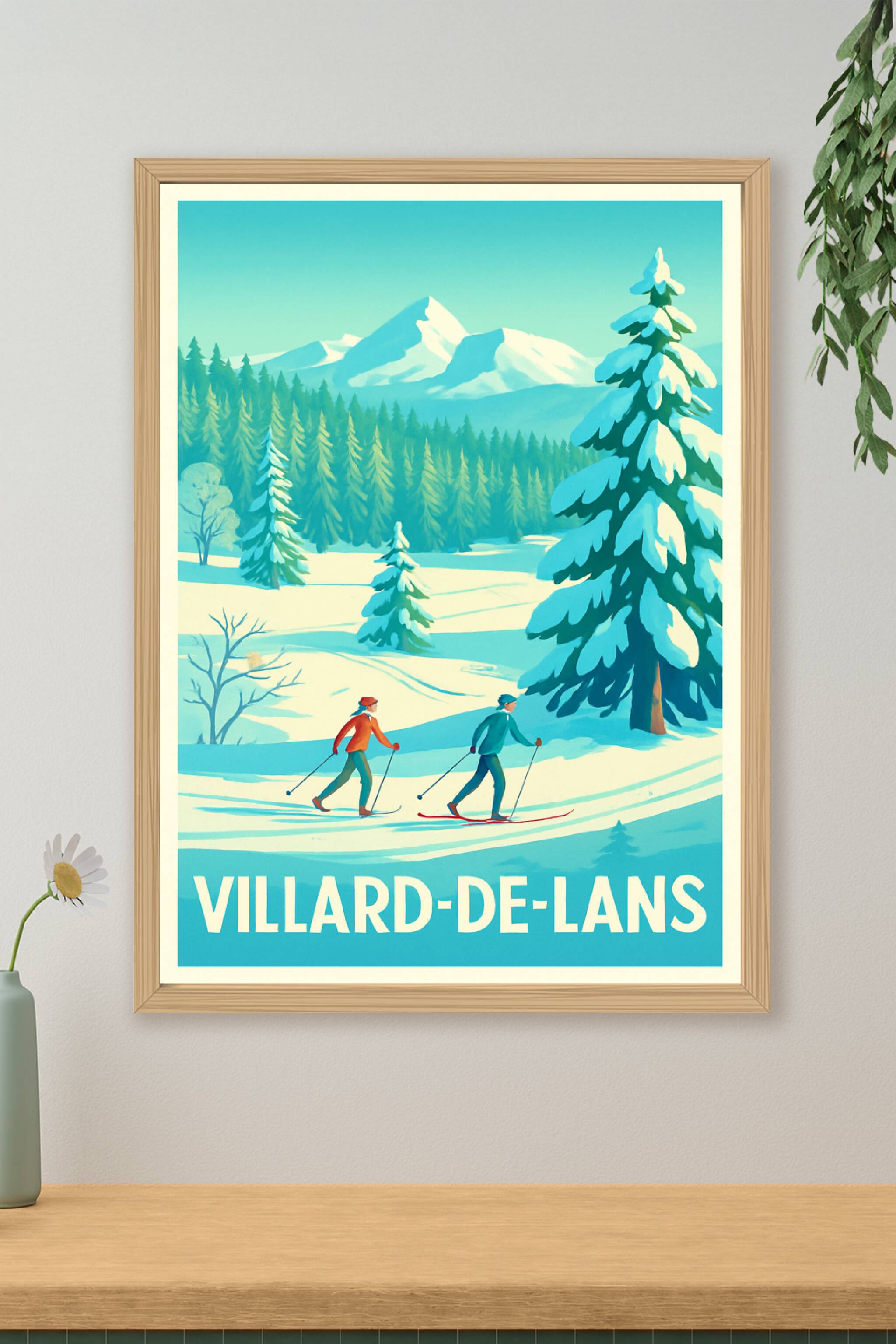 Découvrez l'esprit hivernal de Villard-de-Lans avec cette affiche vintage illustrant une balade en ski de fond au cœur d'un paysage enneigé et pais...