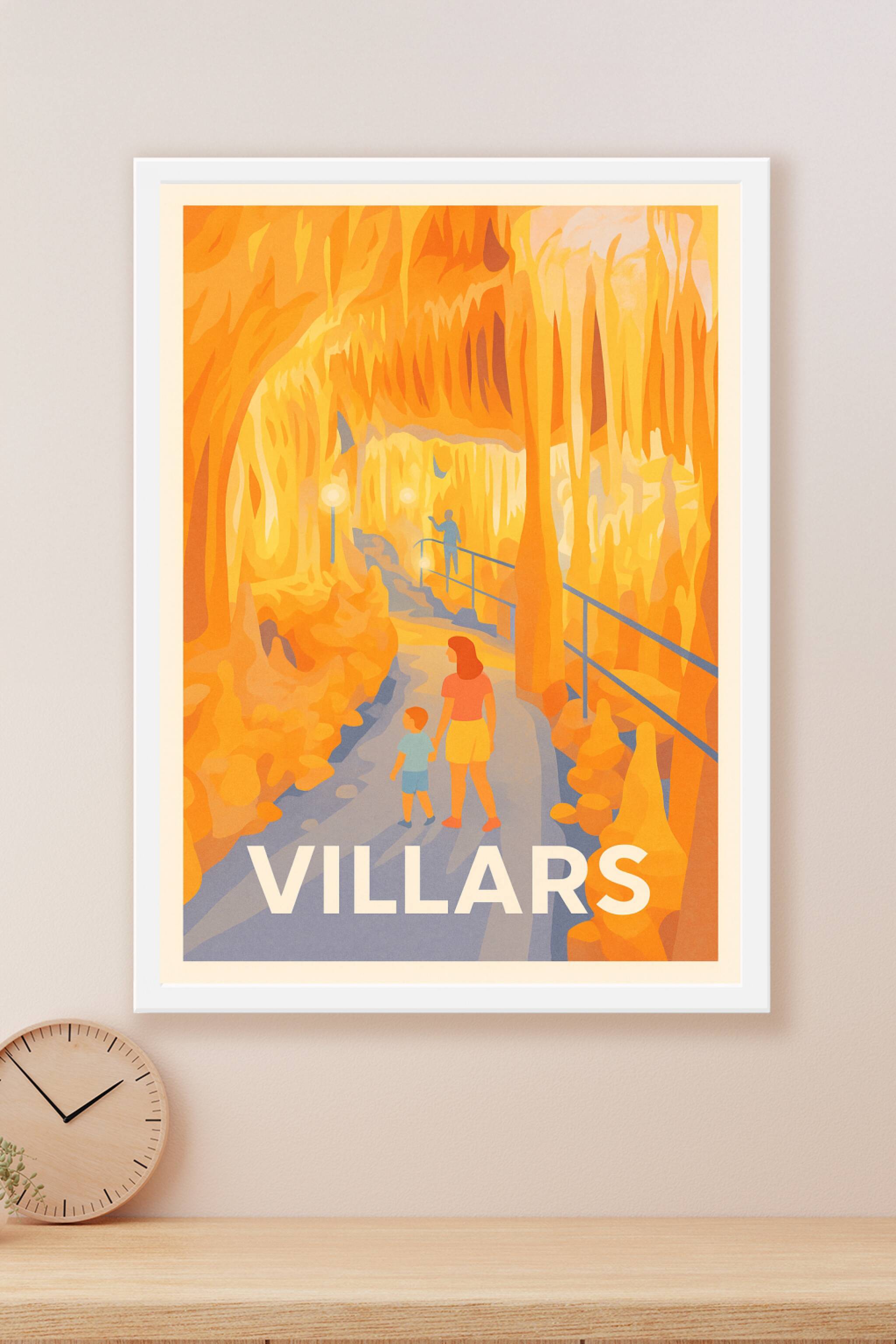 Découvrez l'univers fascinant des grottes de Villars à travers cette affiche au style vintage coloré, mettant en scène un parcours souterrain baigné de lumière dorée. Ce poster invite à un voyage visuel au cœur des stalactites et stalagmites, mettant en valeur la beauté naturelle de cette destination unique. Imprimée en tirage "Fine Art" sur papier 305g coton, cette affiche garantit une qualité d'impression exceptionnelle et des couleurs éclatantes. Disponible en formats A1 à A4, avec ou sans cadre, elle est idéale pour apporter une touche artistique et chaleureuse à votre intérieur. Profitez d'une finition premium 100% française, parfaite pour embellir votre décoration ou offrir un souvenir élégant aux passionnés de nature et d'aventure.