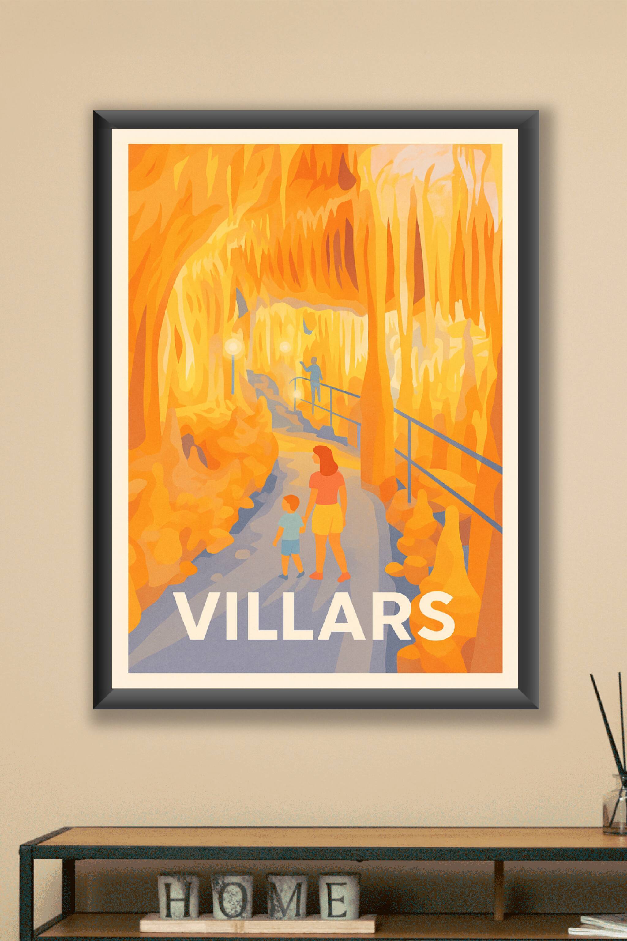 Découvrez l'univers fascinant des grottes de Villars à travers cette affiche au style vintage coloré, mettant en scène un parcours souterrain baign...