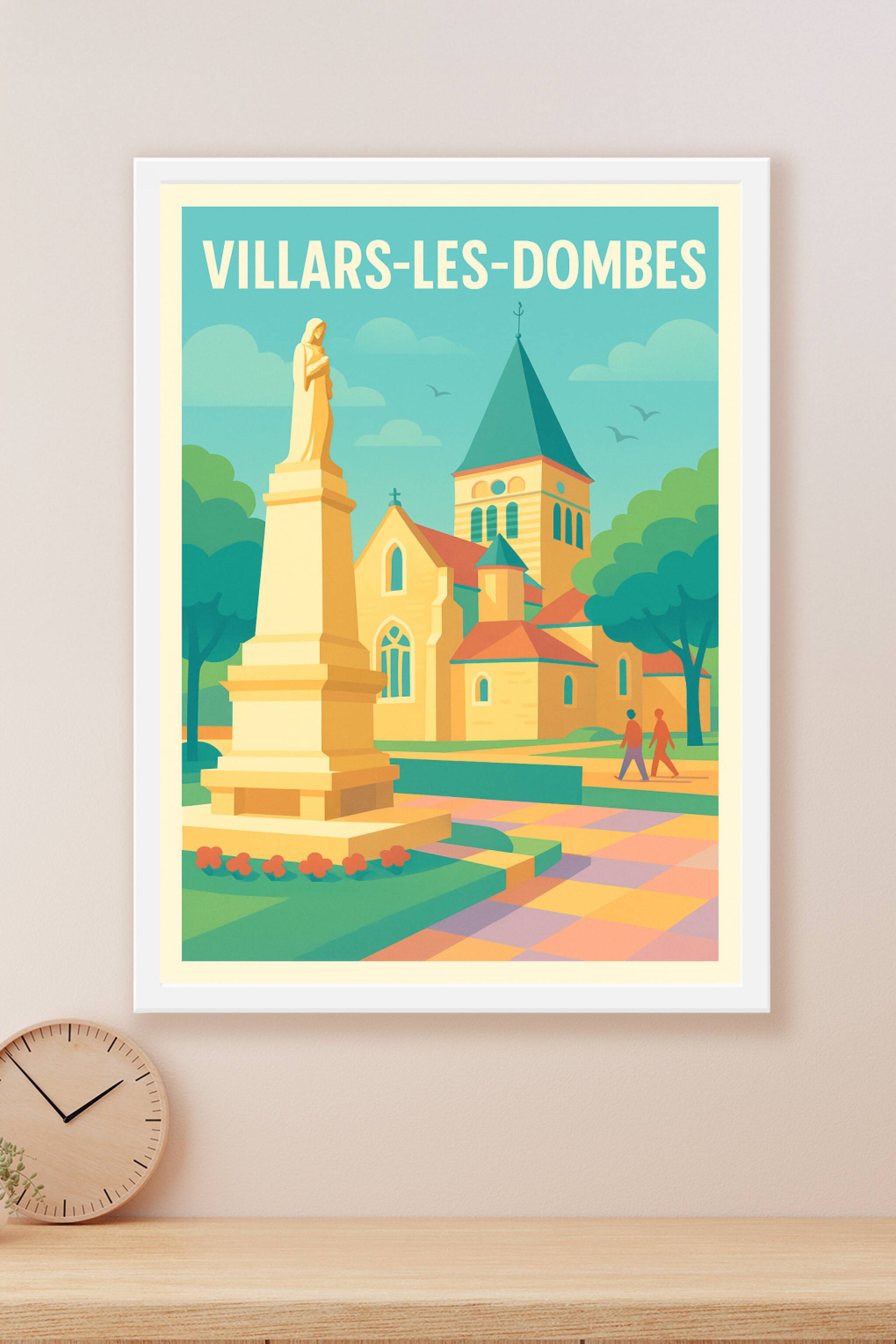 Découvrez l'élégance paisible de Villars-les-Dombes à travers cette affiche illustrée mettant en valeur son patrimoine architectural et ses espaces...