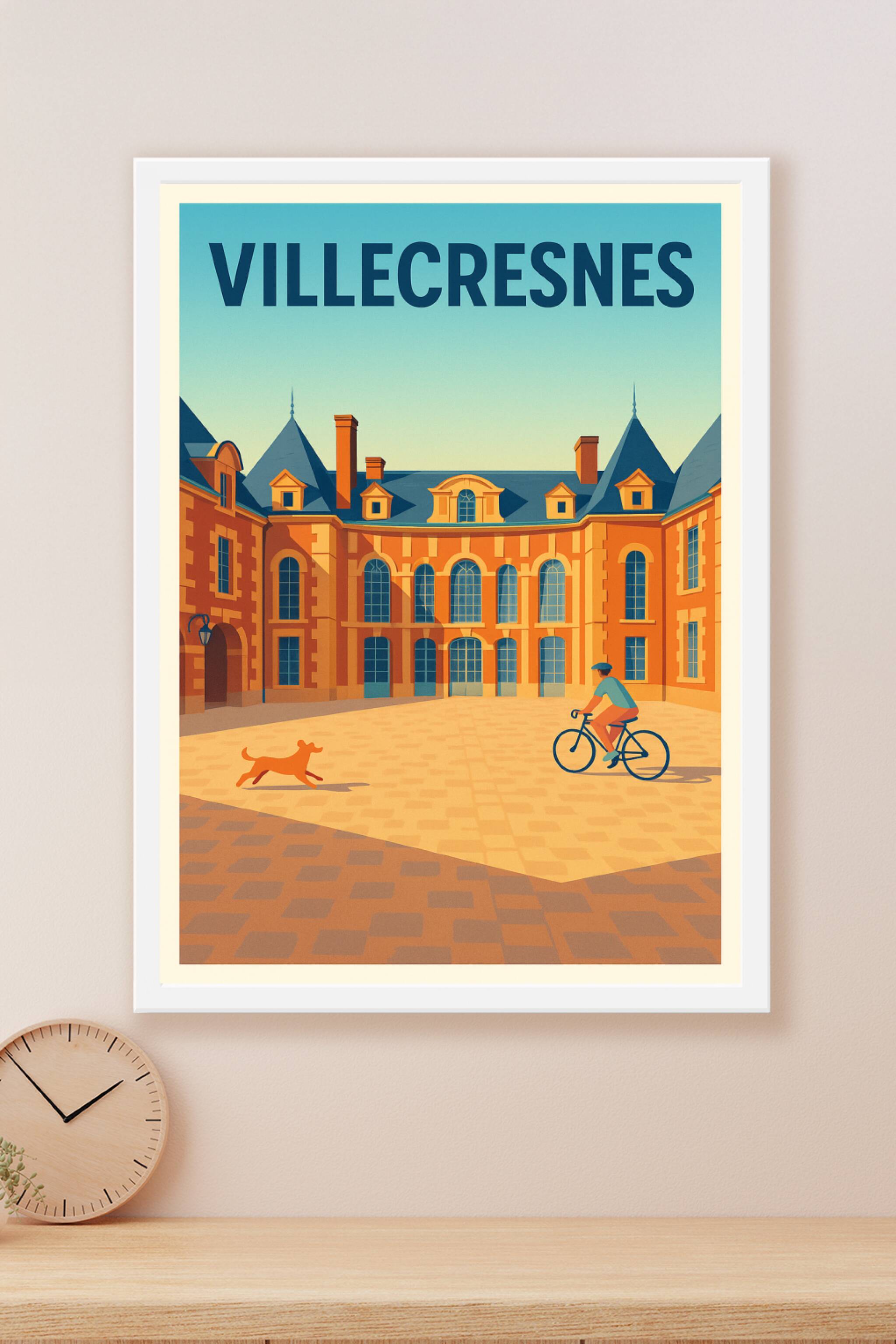 Découvrez cette magnifique affiche illustrant une scène paisible et lumineuse dans la charmante ville de Villecresnes. Cette poster représente l’ar...