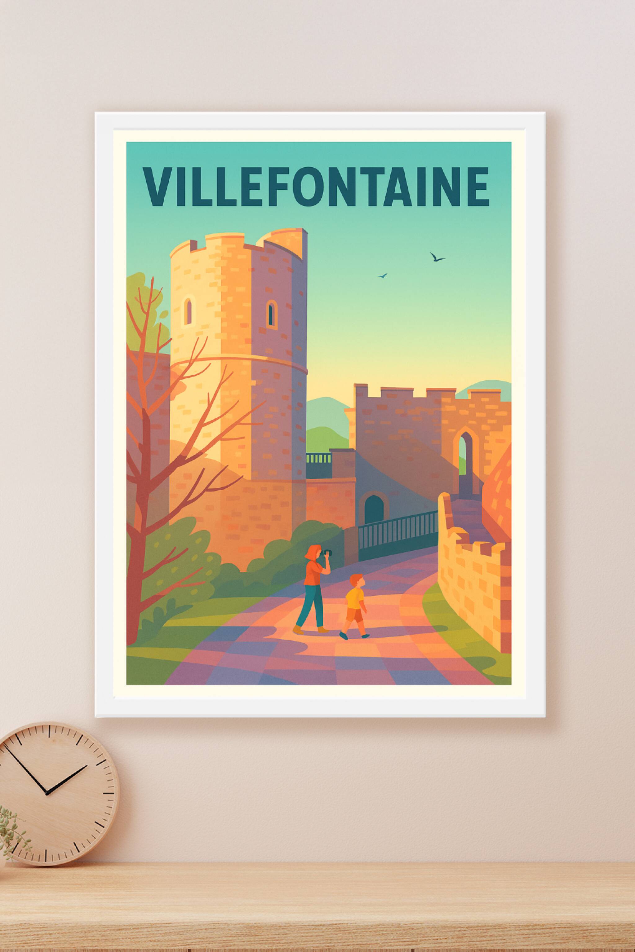 Découvrez l'élégance intemporelle de Villefontaine avec cette affiche illustrée qui capture la beauté de ses tours médiévales baignées par une douc...