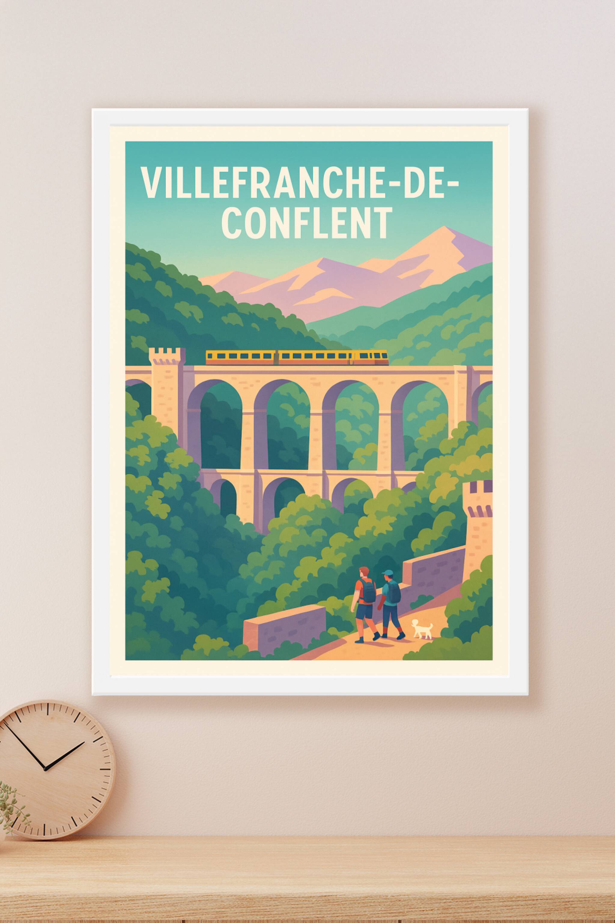 Découvrez la beauté naturelle et l'architecture emblématique de Villefranche-de-Conflent avec cette affiche illustrée où un train traverse un majes...