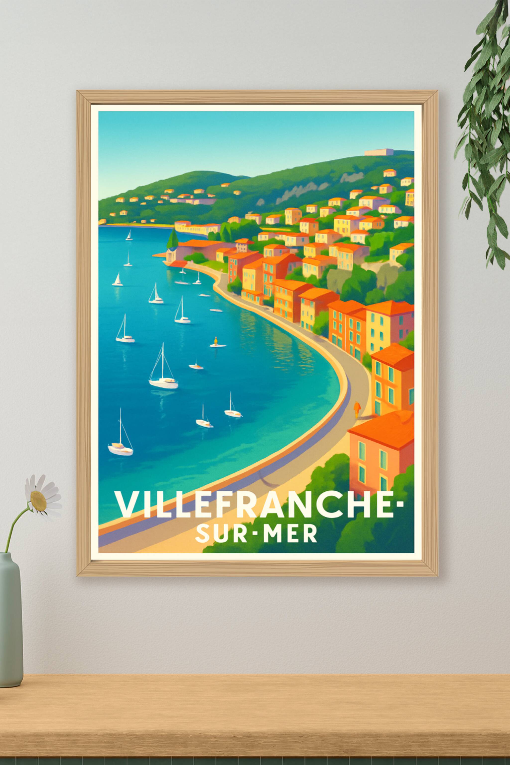 Découvrez cette affiche captivante qui met en lumière la magnifique baie de Villefranche-sur-Mer, avec ses voiliers blancs et ses maisons aux façad...