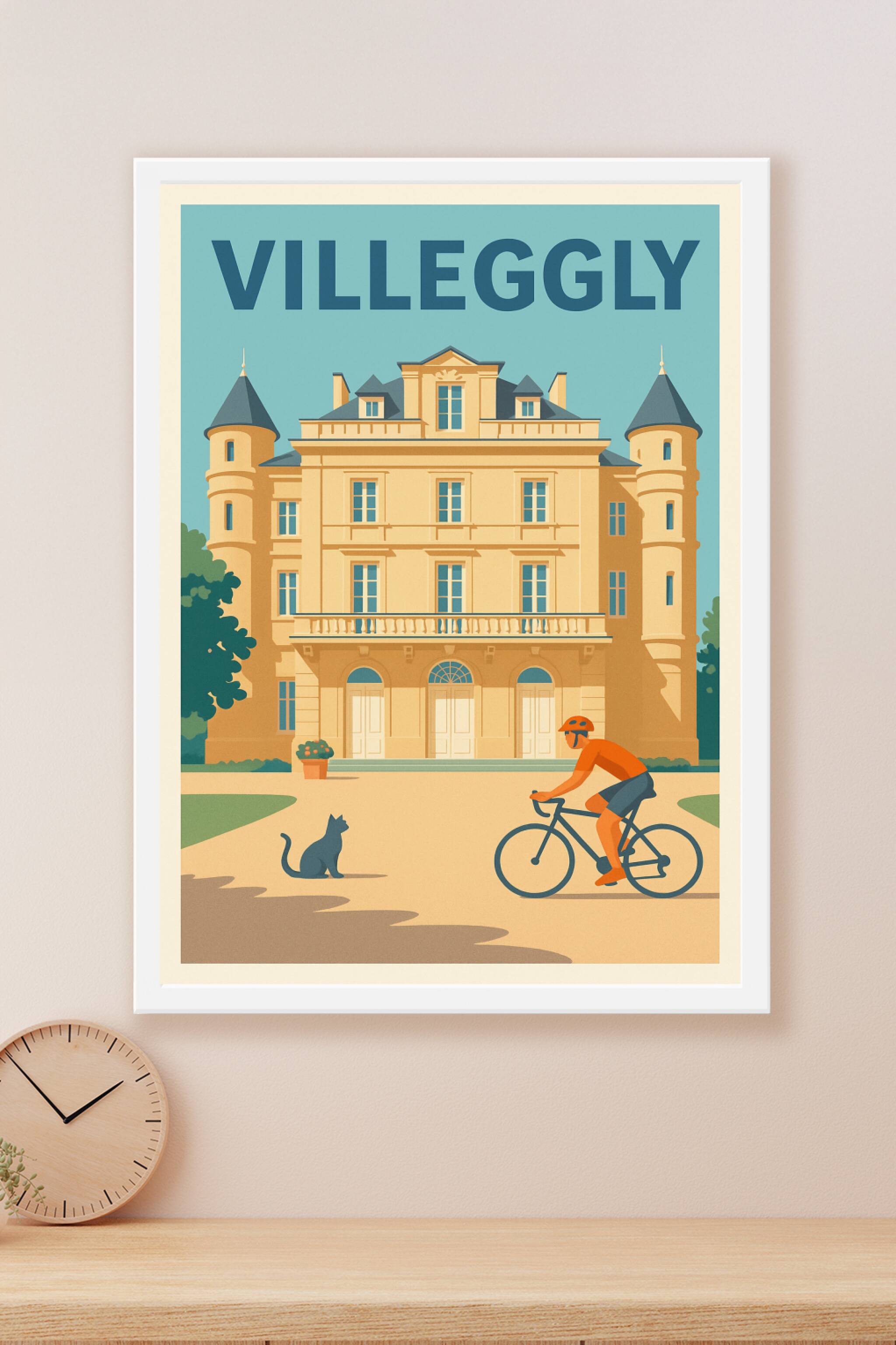 Découvrez l'ambiance paisible et raffinée de Villegly avec ce poster au style rétro qui met en lumière le majestueux château de la ville. L'illustr...