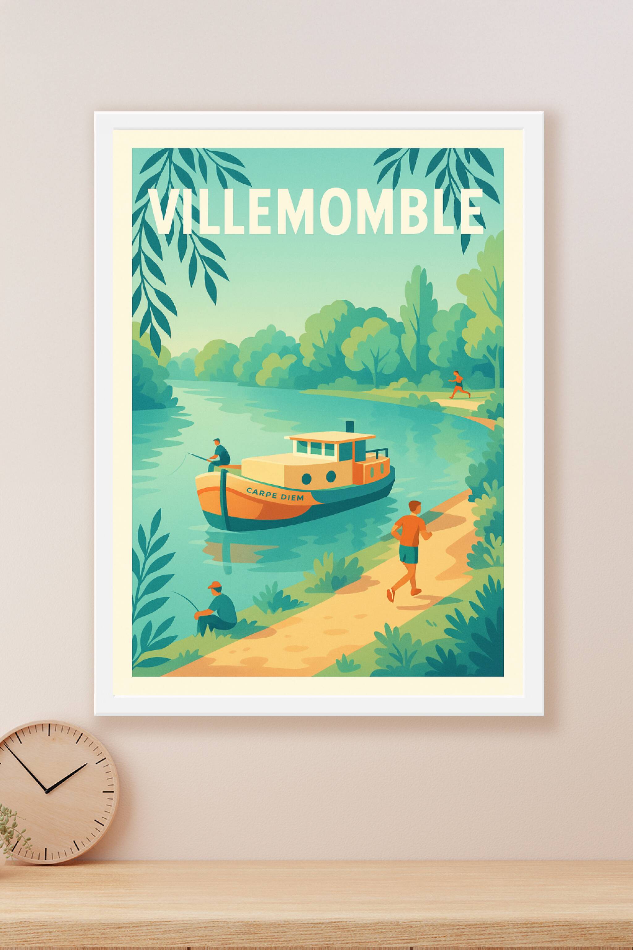 Découvrez la douceur de vivre à Villemomble avec cette affiche au style vintage mettant en scène un bateau nommé 'Carpe Diem' sur une rivière paisi...