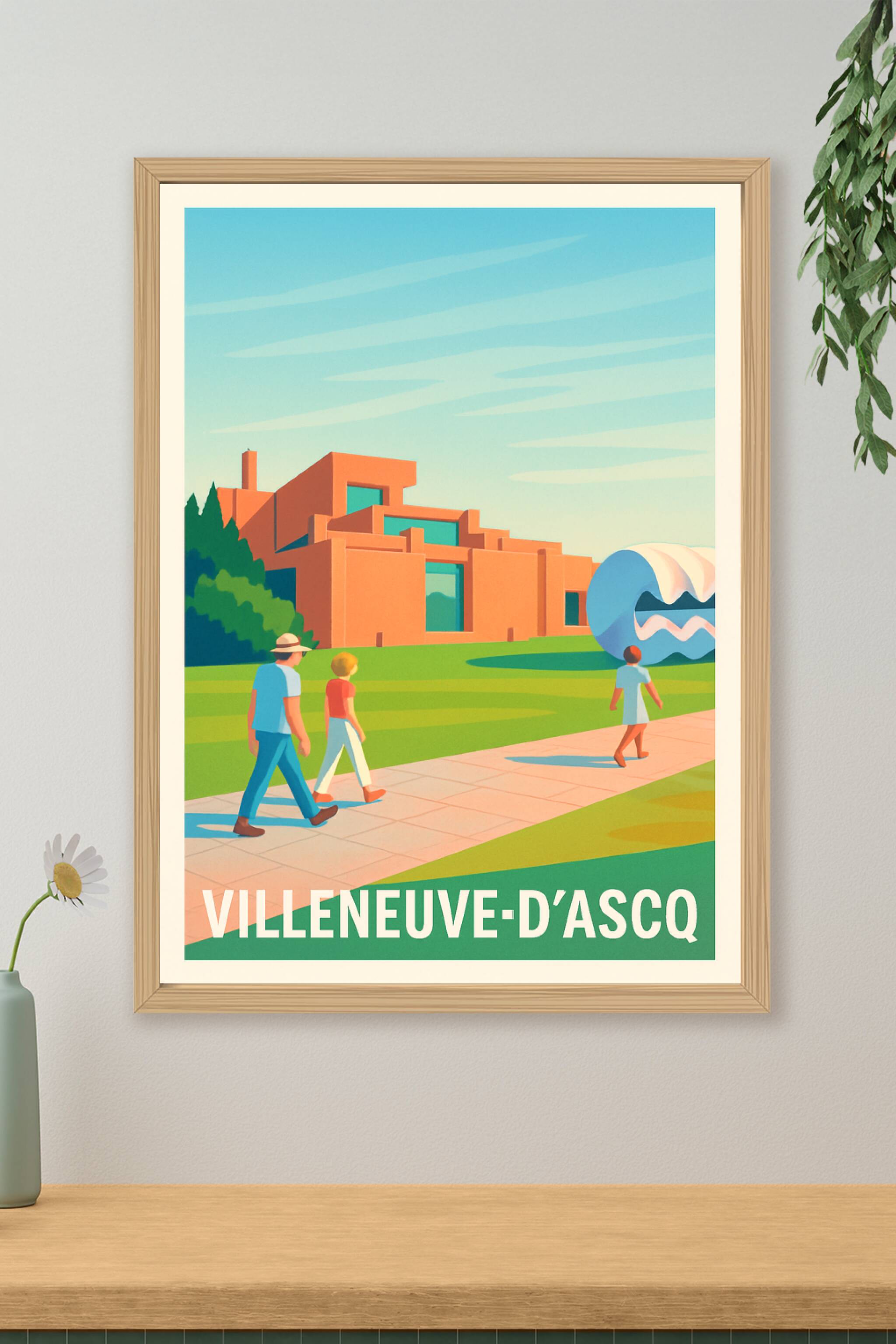 Découvrez l'élégance moderne de Villeneuve-d'Ascq à travers cette affiche stylisée mettant en avant une architecture contemporaine nichée dans un c...