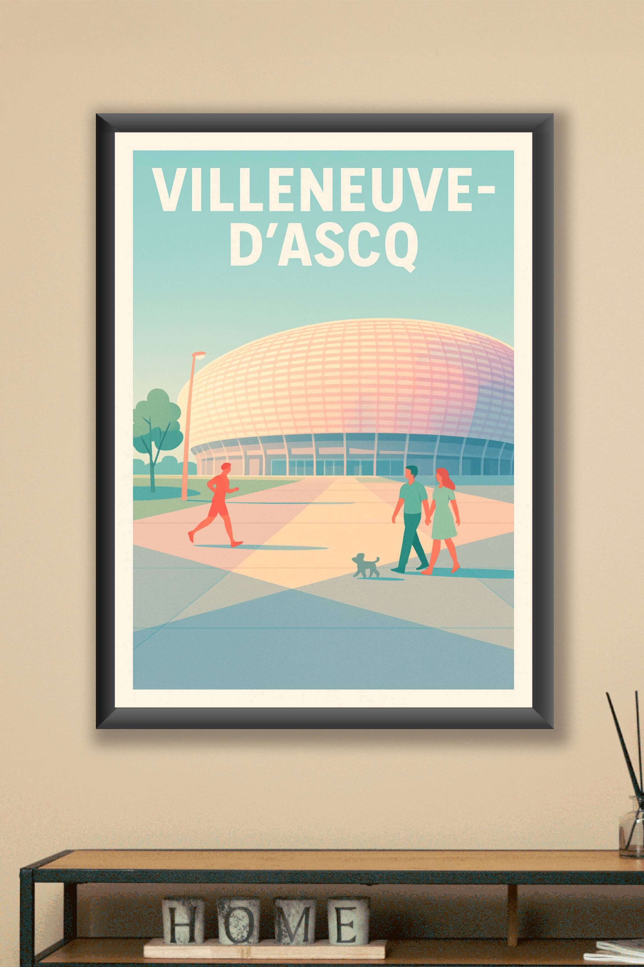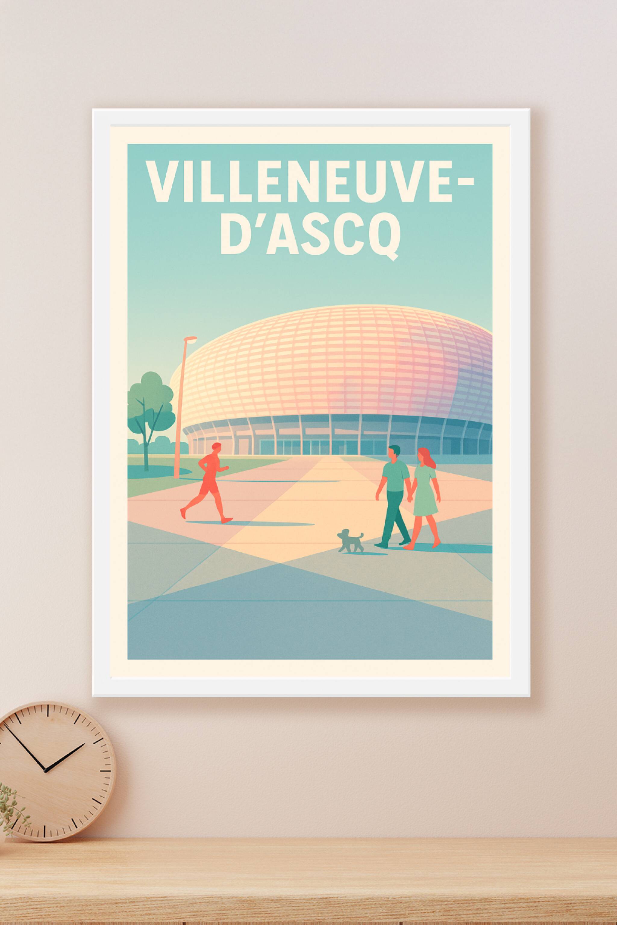 Découvrez le charme contemporain de Villeneuve-d'Ascq à travers cette affiche au design épuré et couleurs pastel douces. Le poster met en avant un ...