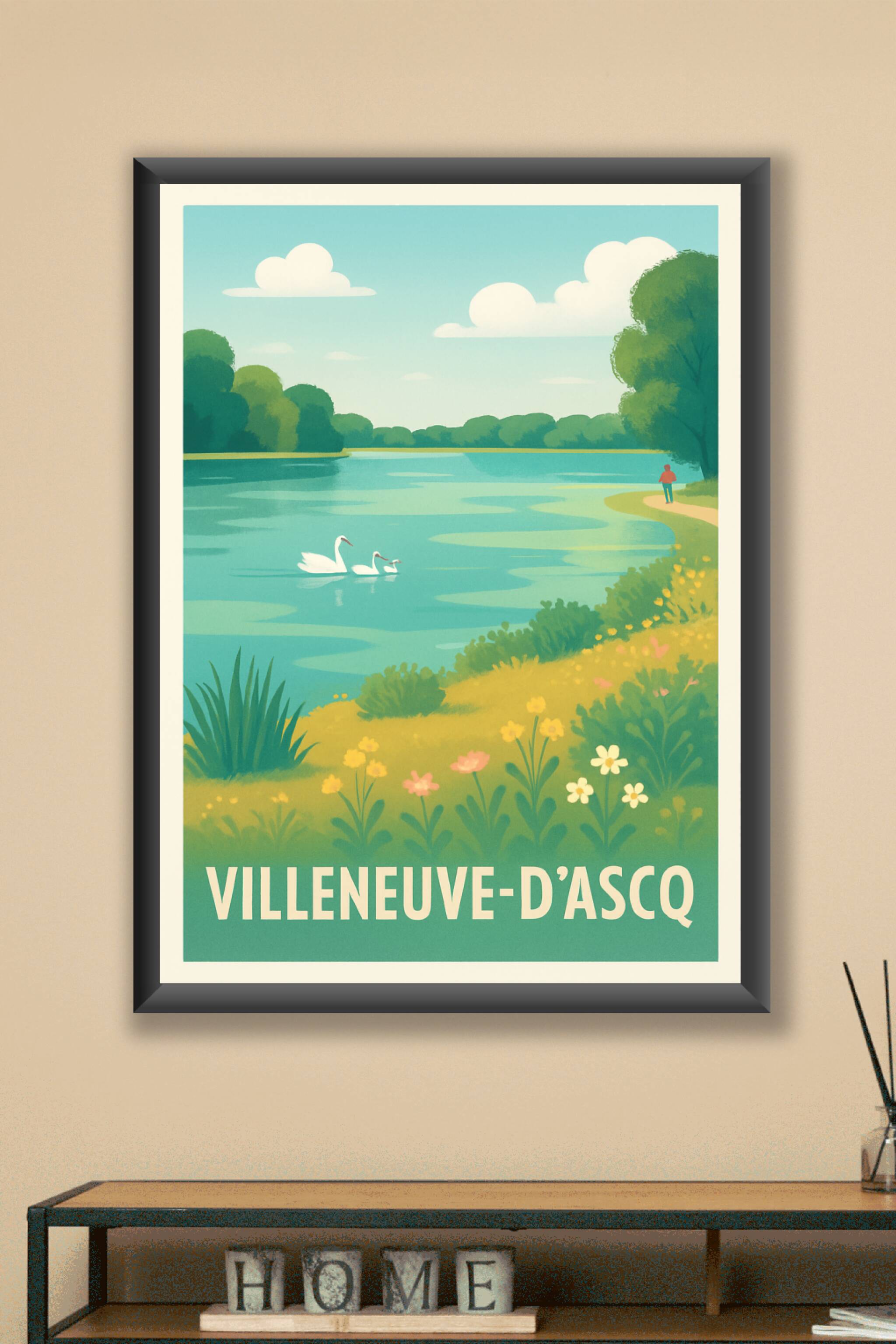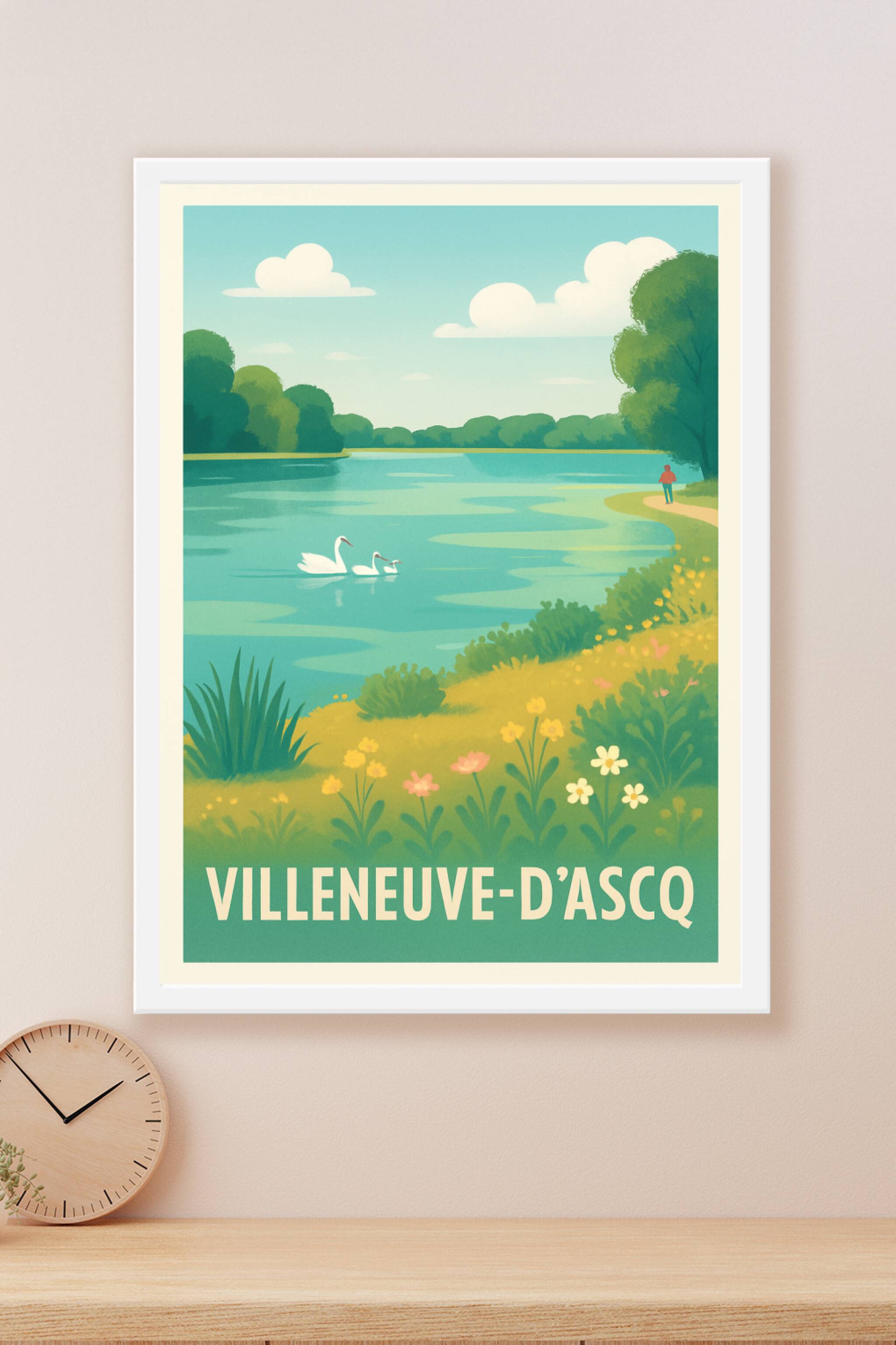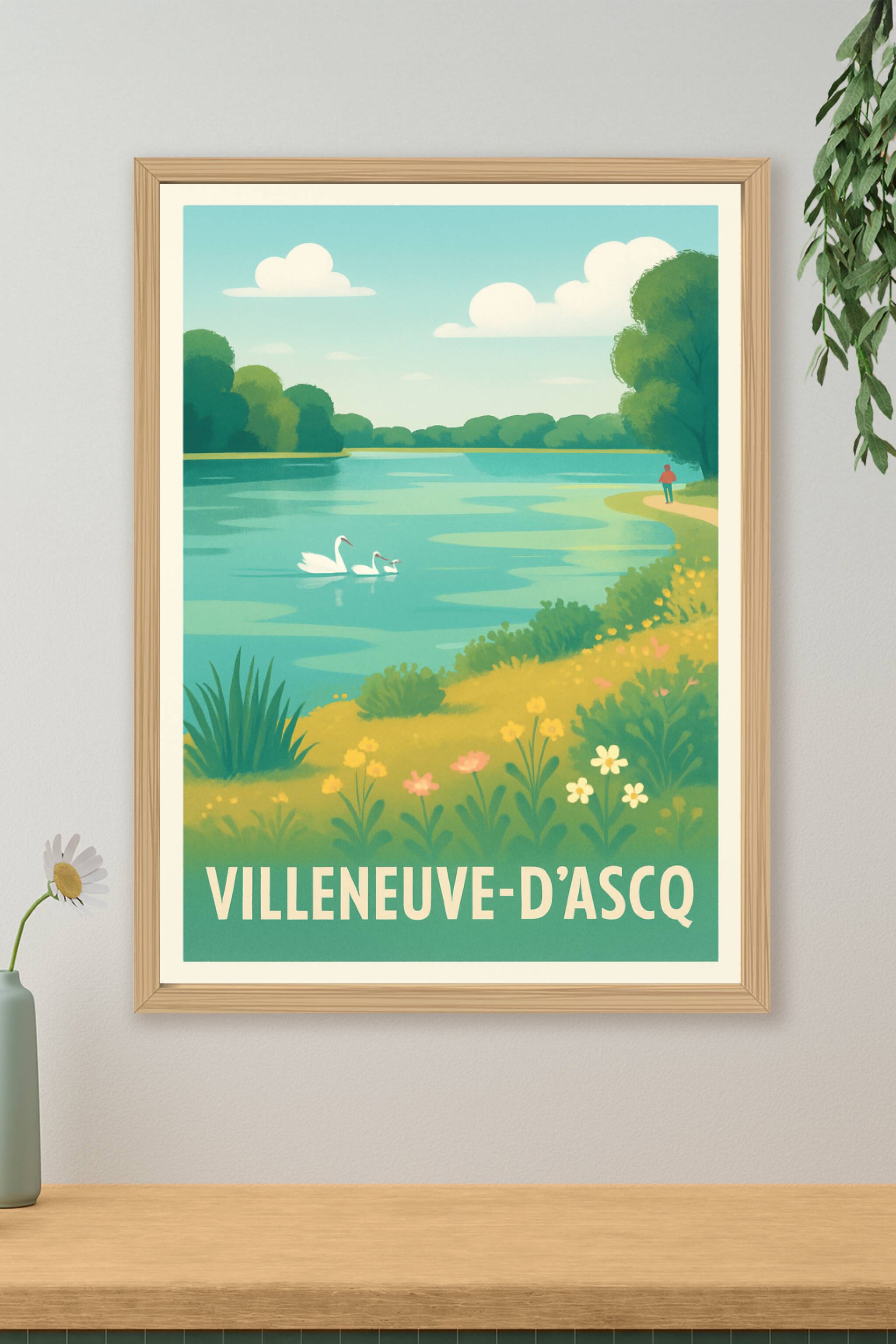 Découvrez la douceur paisible de Villeneuve-d'Ascq avec cette affiche illustrée mettant en scène un paysage naturel au bord de l'eau, où cygnes et ...