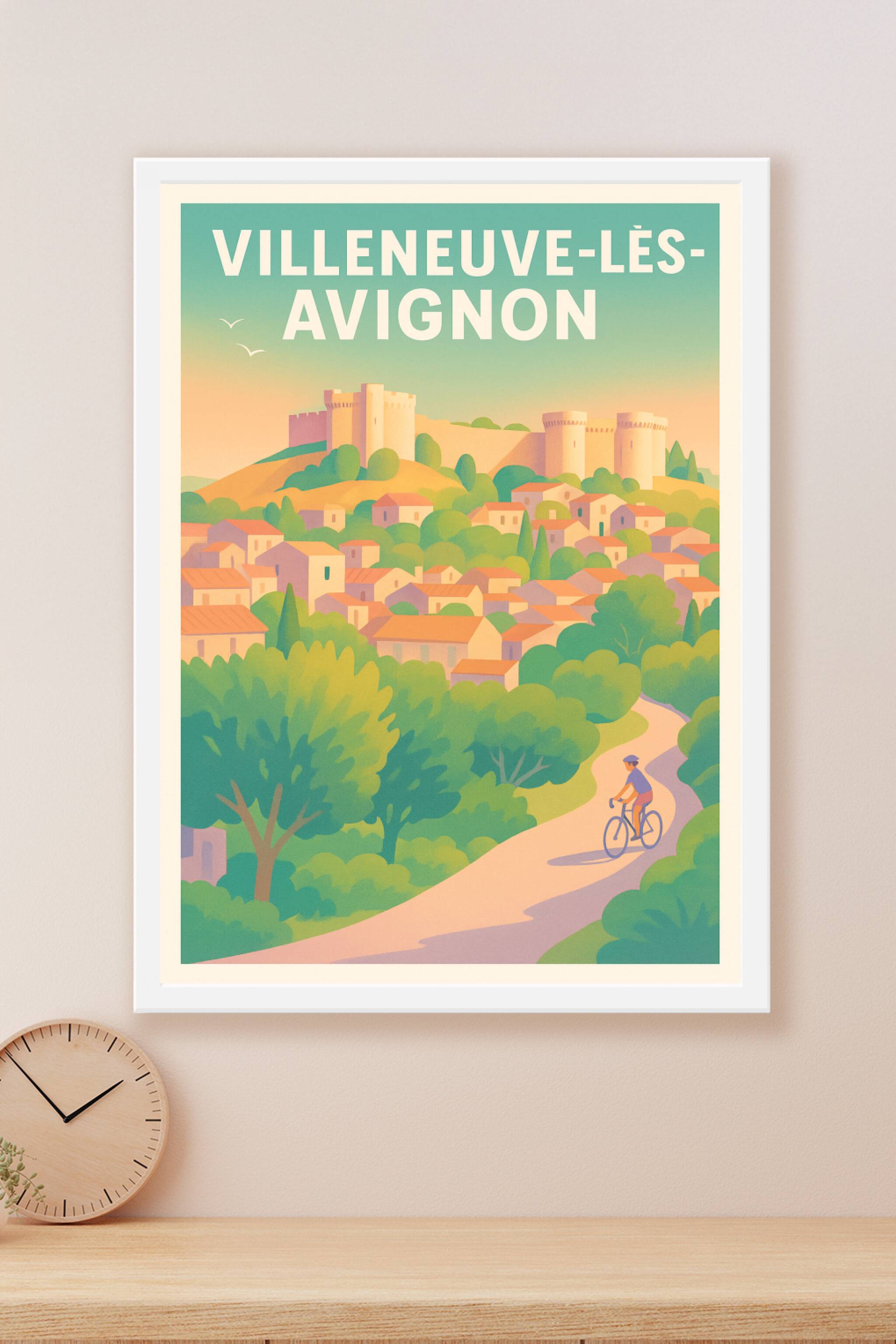 Découvrez Villeneuve-lès-Avignon à travers cette affiche au style doux et éclatant, illustrant ses maisons pittoresques, ses collines verdoyantes e...