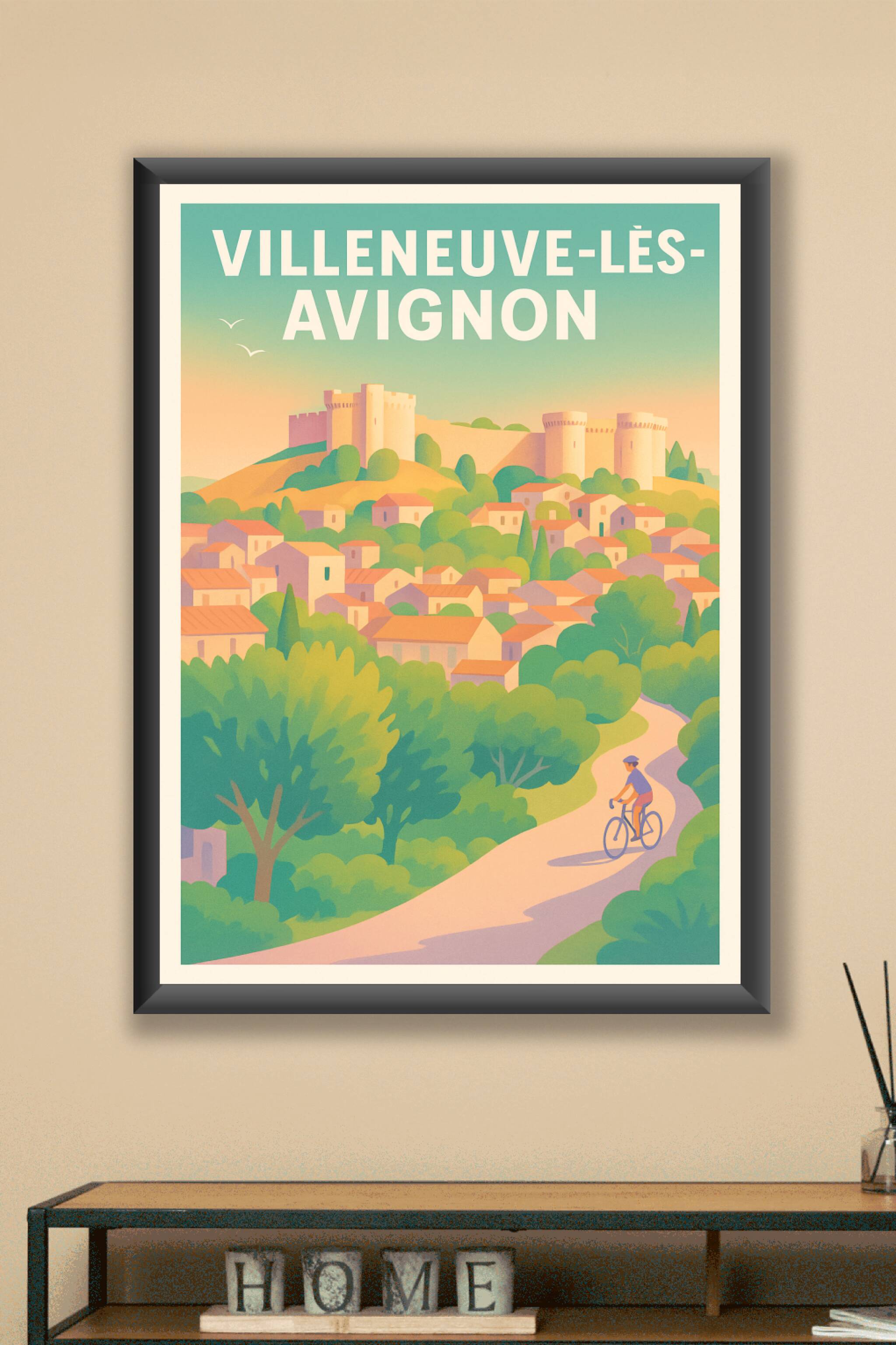 Découvrez Villeneuve-lès-Avignon à travers cette affiche au style doux et éclatant, illustrant ses maisons pittoresques, ses collines verdoyantes et son imposant château médiéval. Ce poster évoque la tranquillité et le charme typique de la Provence, parfait pour apporter une touche d'authenticité et de sérénité à votre intérieur. Disponible en tirage "Fine Art" sur papier 305g coton, cette affiche bénéficie d'une qualité d'impression exceptionnelle qui ravira les amateurs d'art et de décoration. Choisissez votre format préféré, de l'A4 compact à l'imposant A1, avec ou sans cadre, pour personnaliser votre espace ou offrir un souvenir raffiné aux amoureux du Sud de la France.