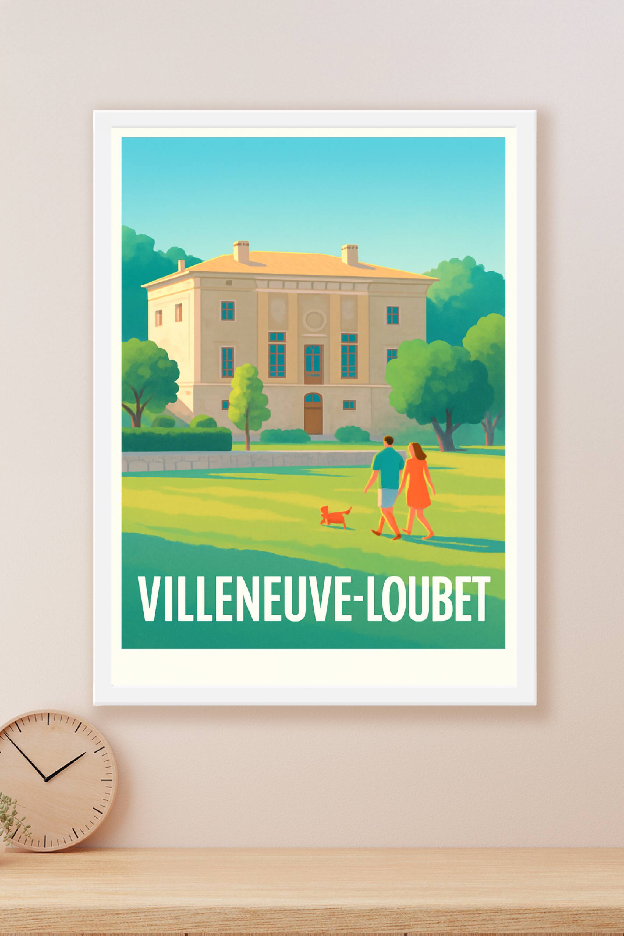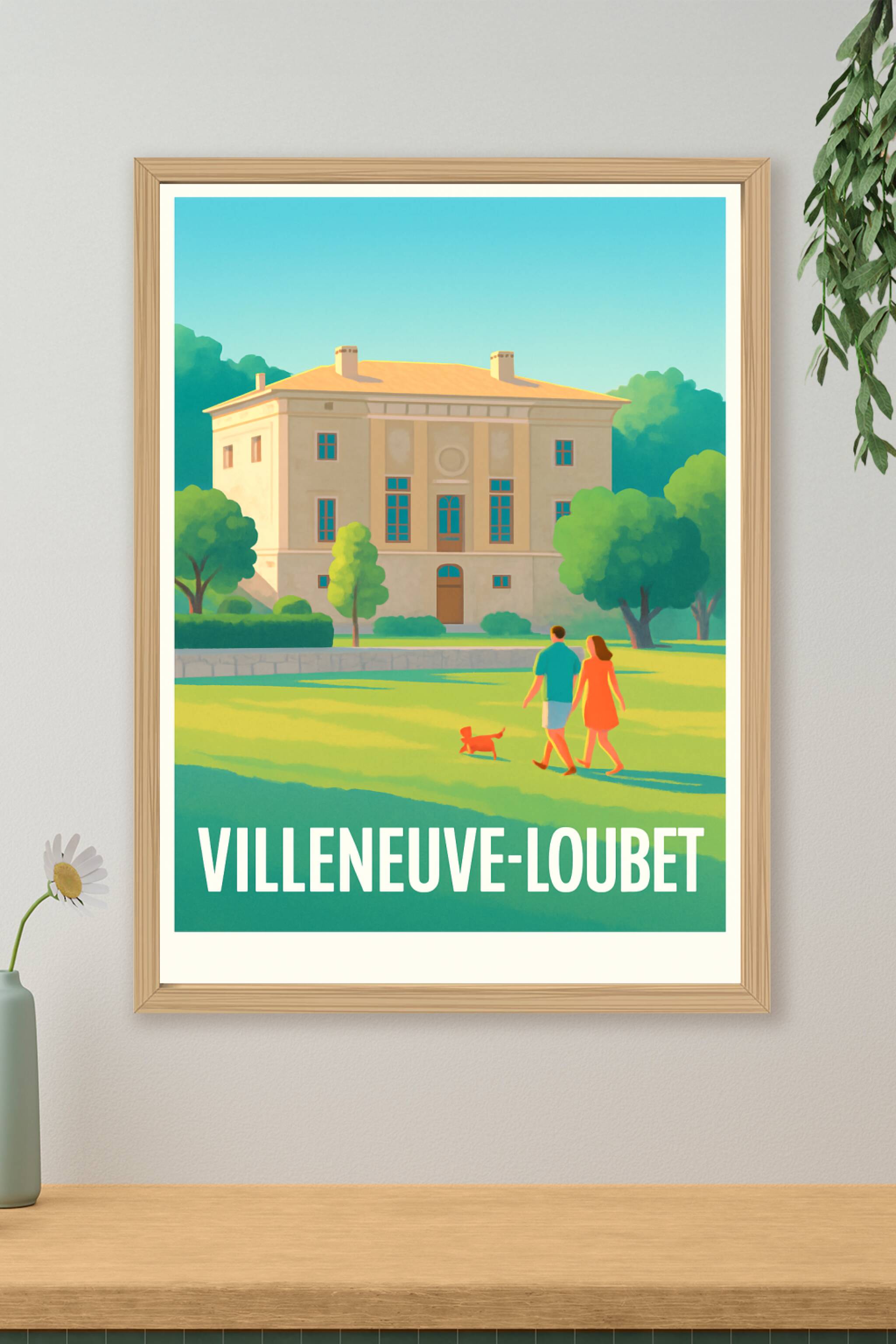 Découvrez l'élégance et la douceur de vivre de Villeneuve-Loubet avec cette affiche illustrée qui capture un moment paisible au pied d'un bâtiment ...