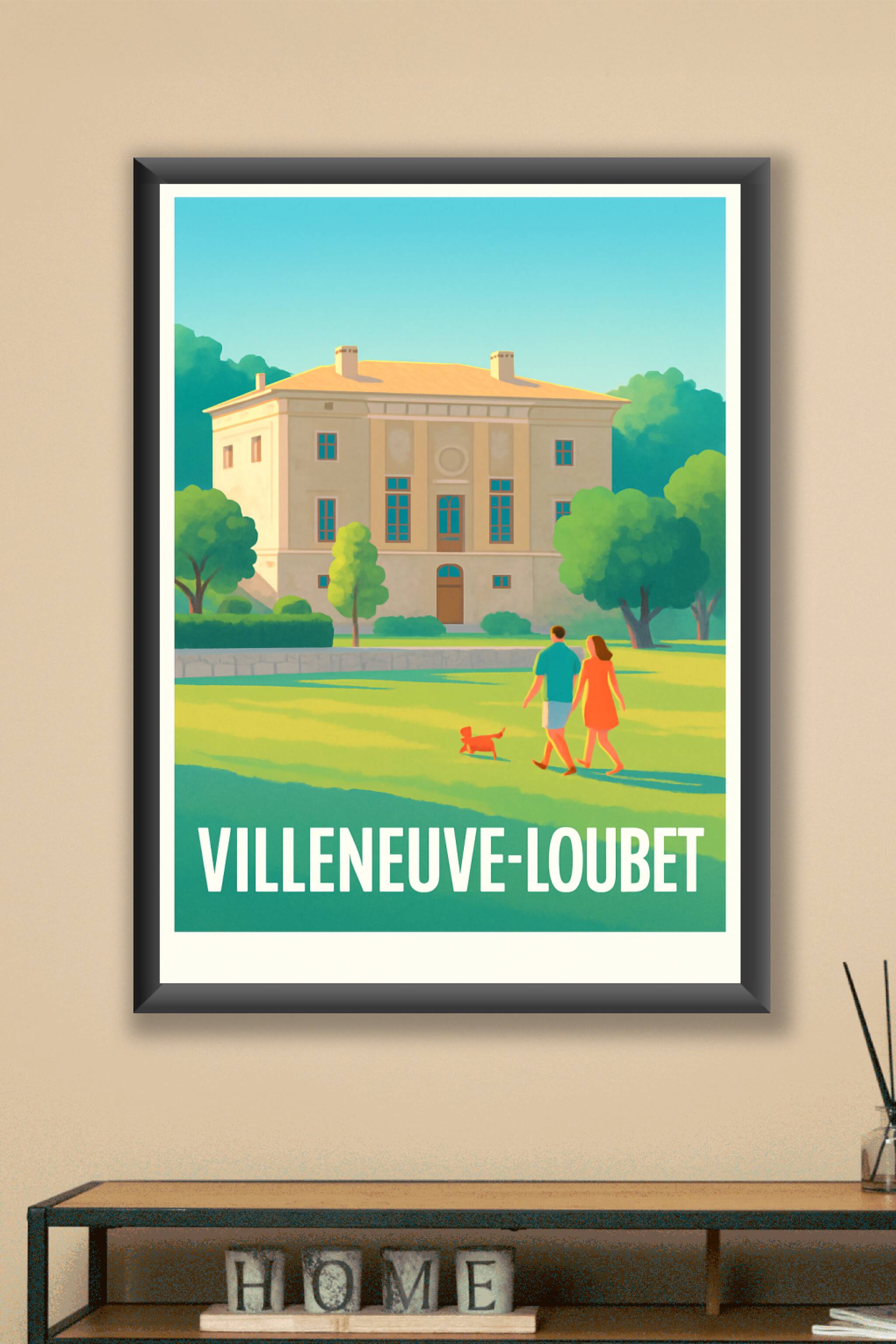 Découvrez l'élégance et la douceur de vivre de Villeneuve-Loubet avec cette affiche illustrée qui capture un moment paisible au pied d'un bâtiment historique baigné de lumière. Ce poster au style vintage évoque un après-midi ensoleillé, idéal pour apporter une atmosphère apaisante et chaleureuse à votre décoration intérieure. Imprimée en tirage "Fine Art" sur papier 305g coton, cette affiche garantit une qualité d'impression exceptionnelle et une grande longévité des couleurs. Disponible en formats A1 à A4, avec ou sans cadre, elle ravira les amateurs d'art et de patrimoine en quête d'un souvenir authentique et raffiné de Villeneuve-Loubet.