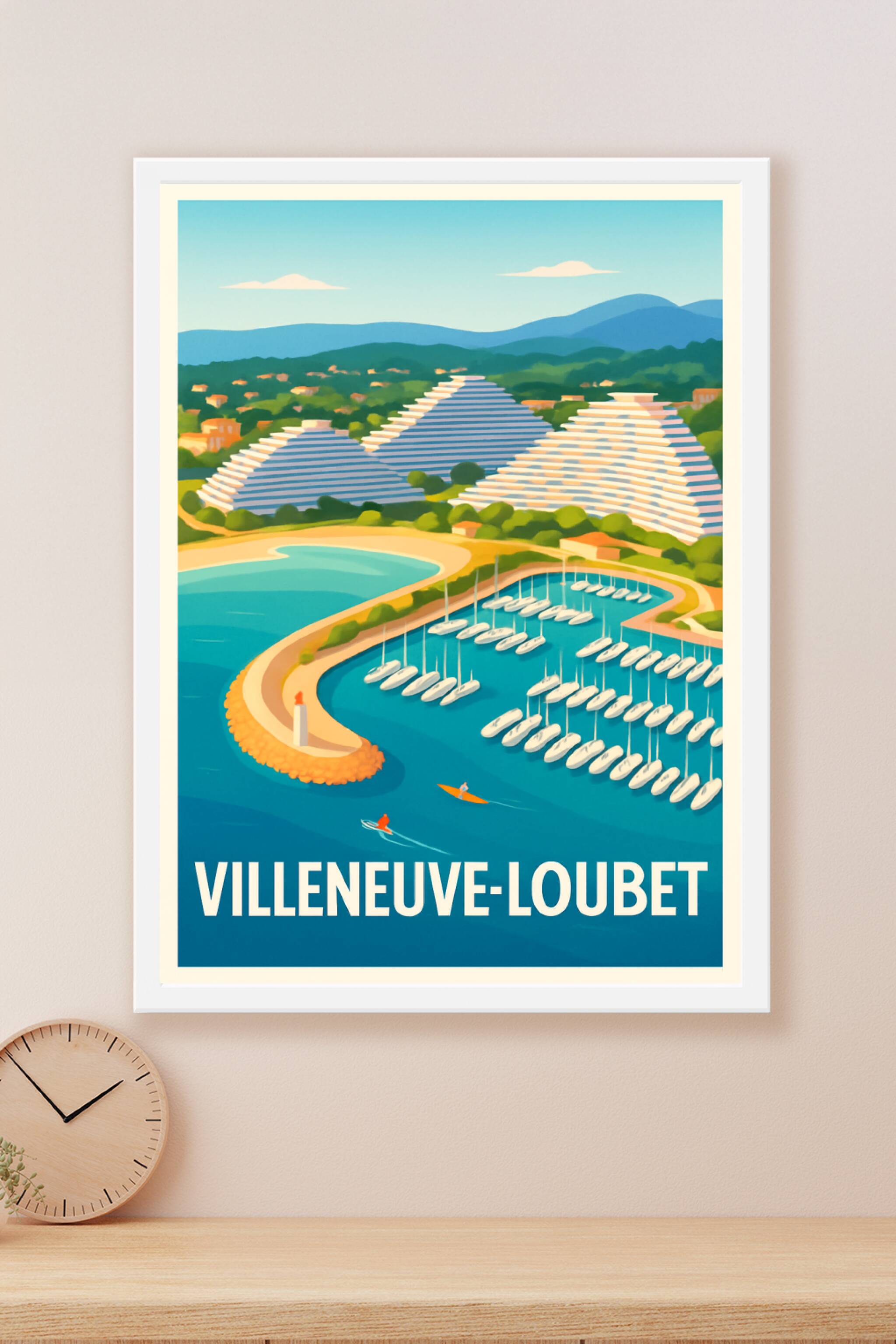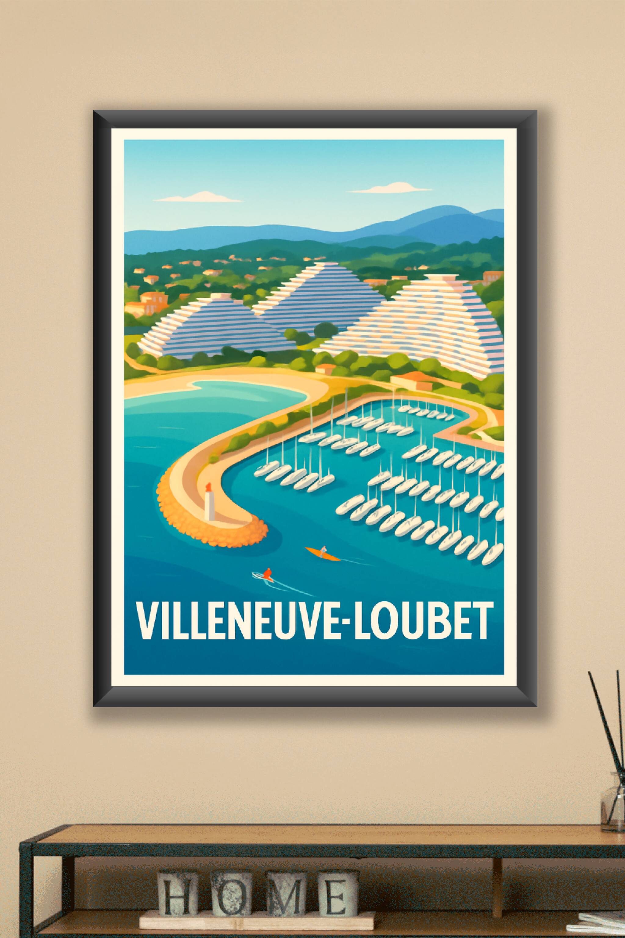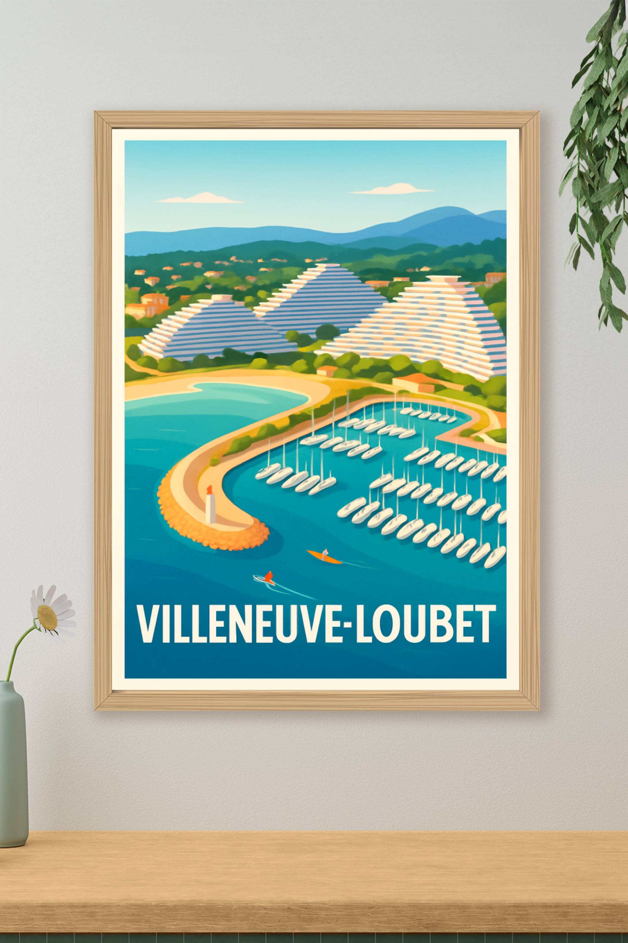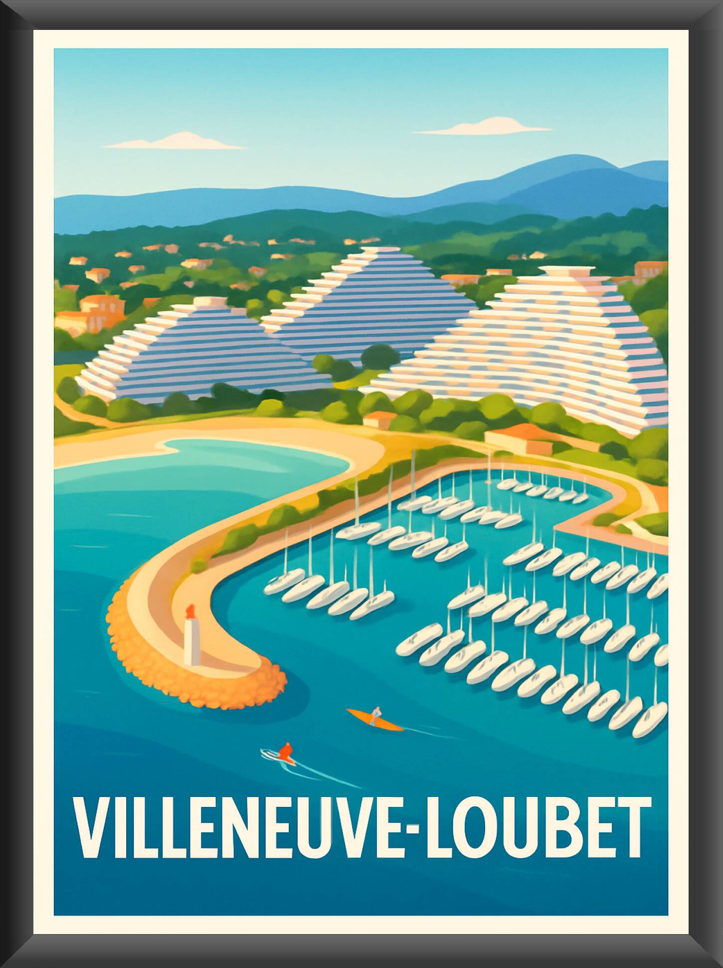 Découvrez le charme unique de Villeneuve-Loubet avec cette affiche illustrée mettant en valeur ses célèbres pyramides et son port de plaisance anim...