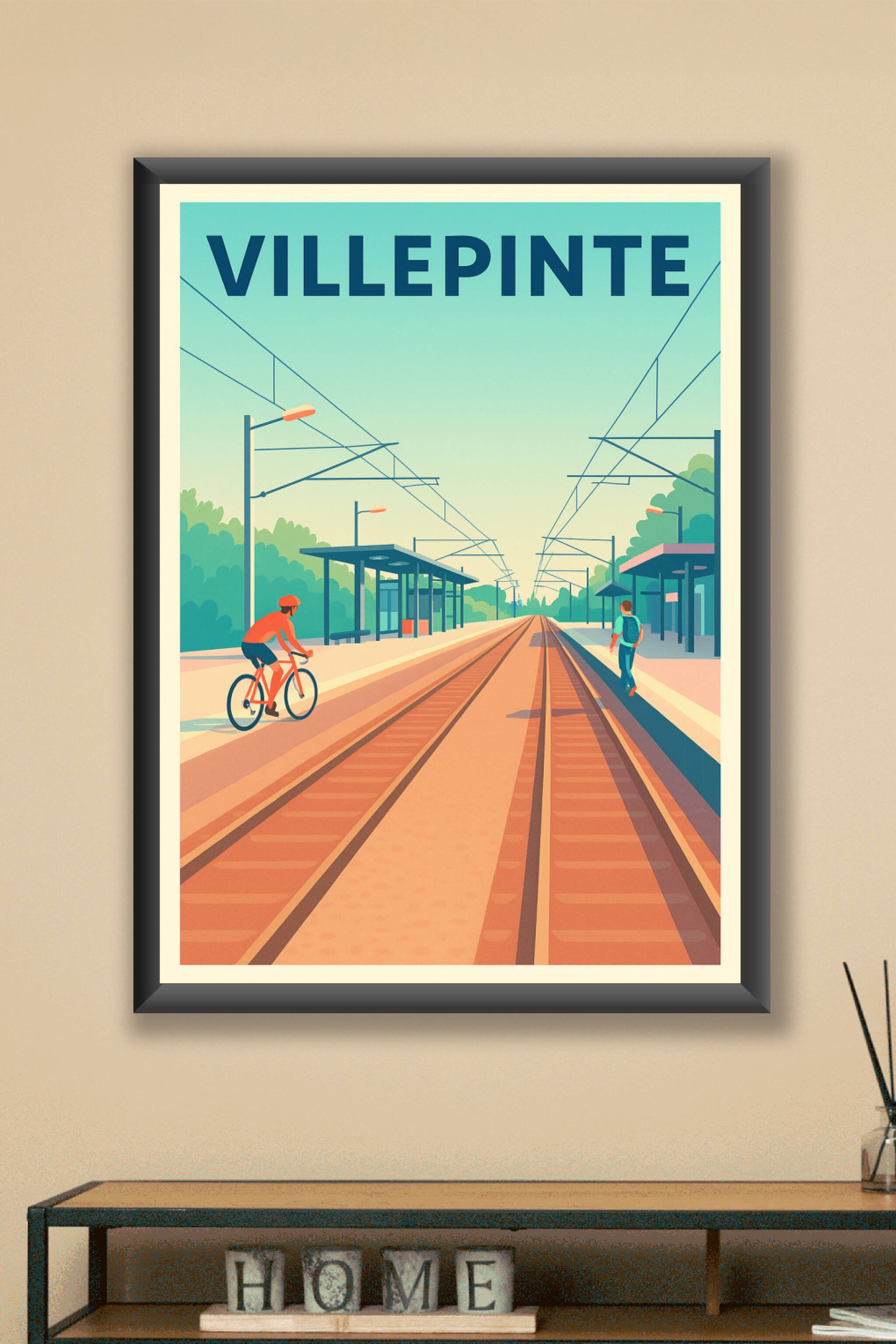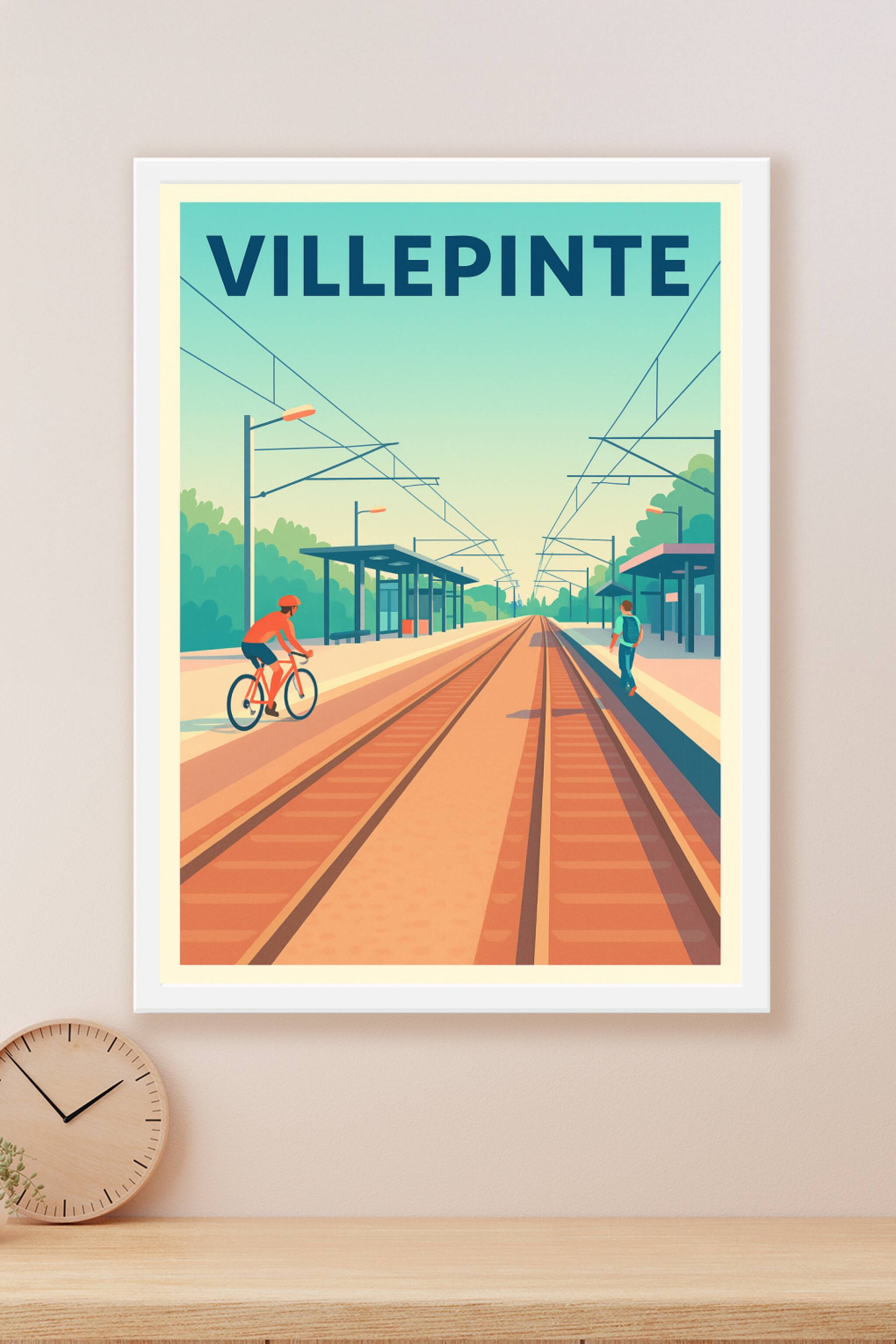 Découvrez cette affiche vibrante qui capture l'esprit tranquille du quotidien à Villepinte, avec son quai de gare, un cycliste et un piéton évoluan...