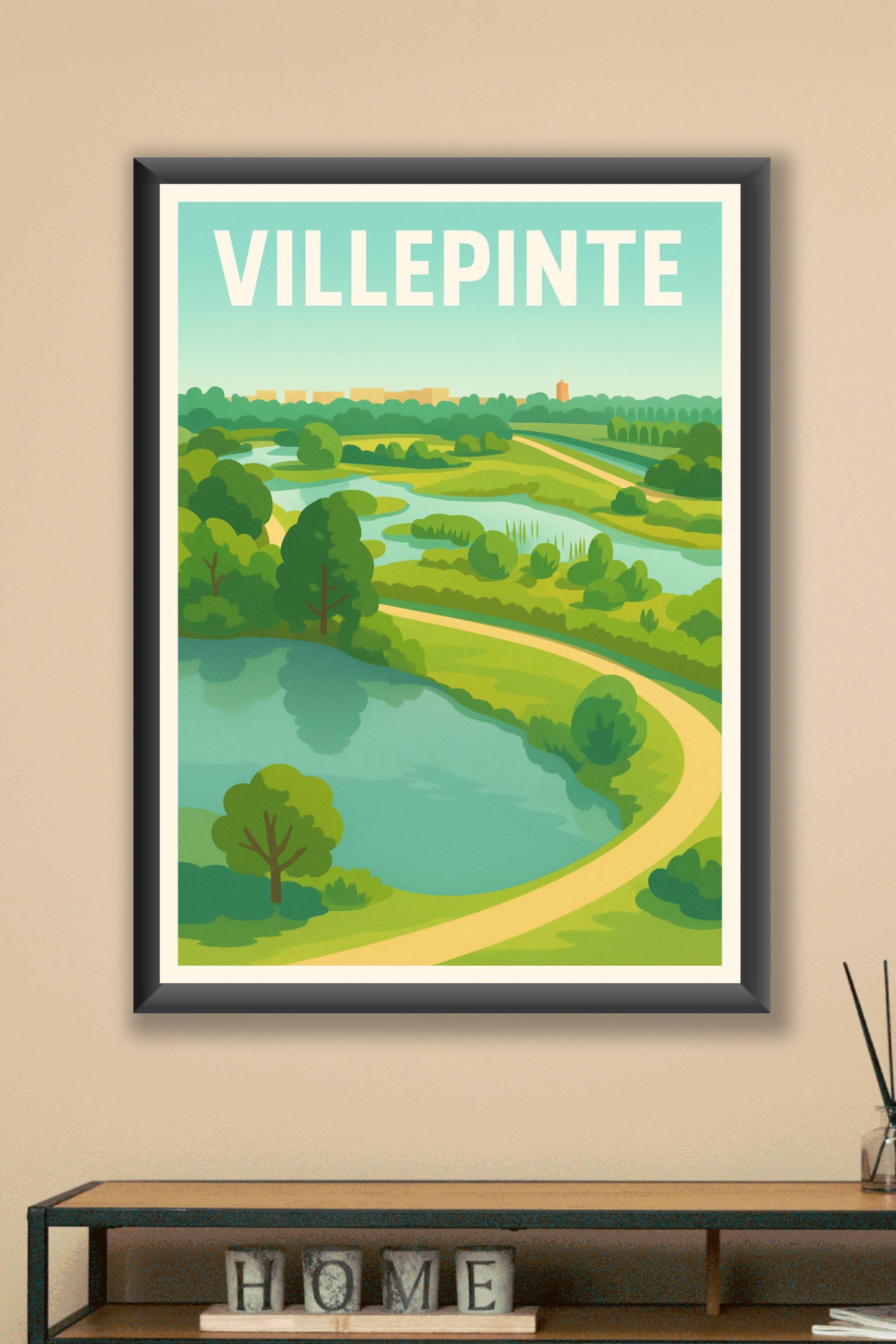 Découvrez le charme bucolique de Villepinte avec cette affiche illustrée qui capture la douceur des paysages verdoyants et des sentiers sinueux lon...