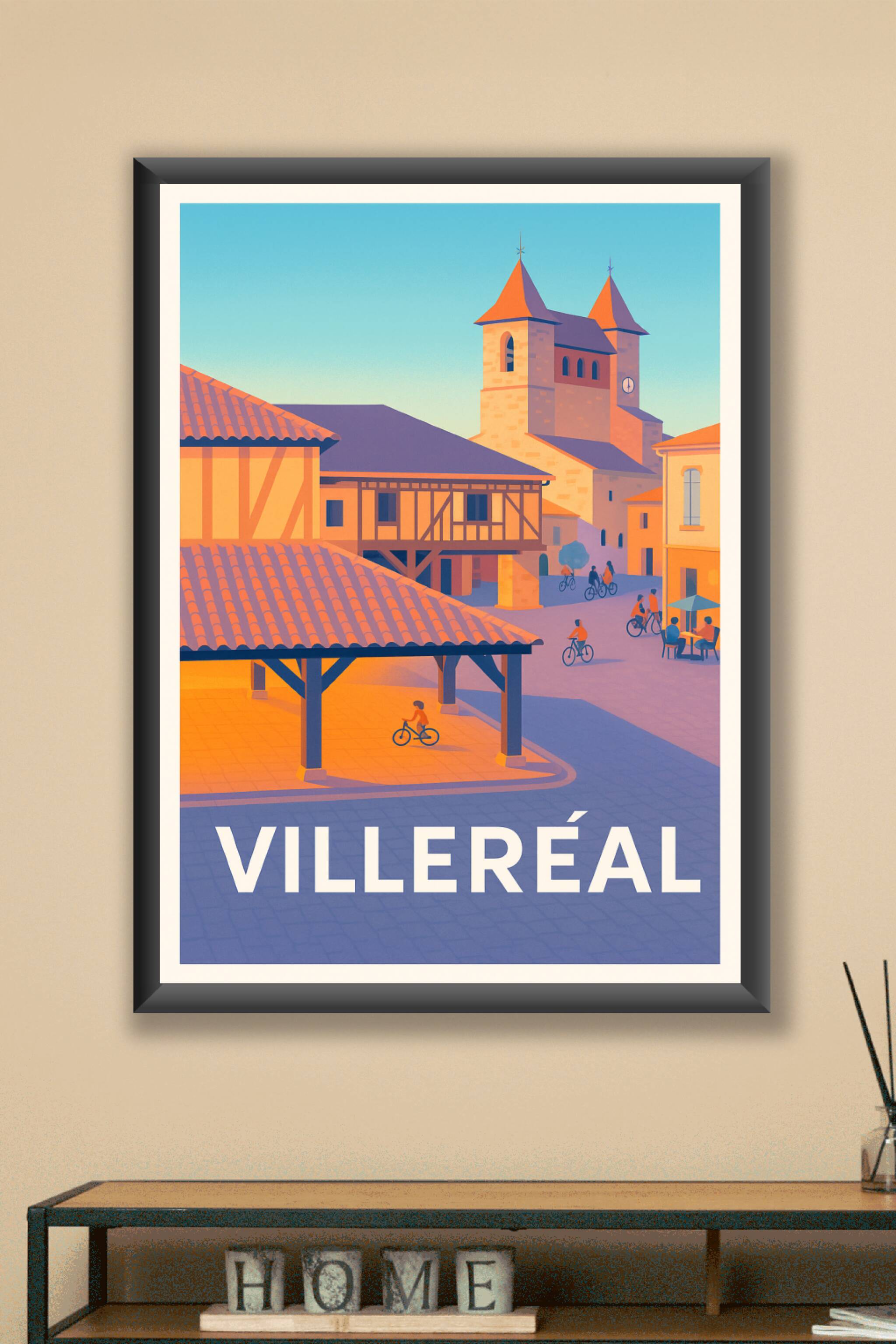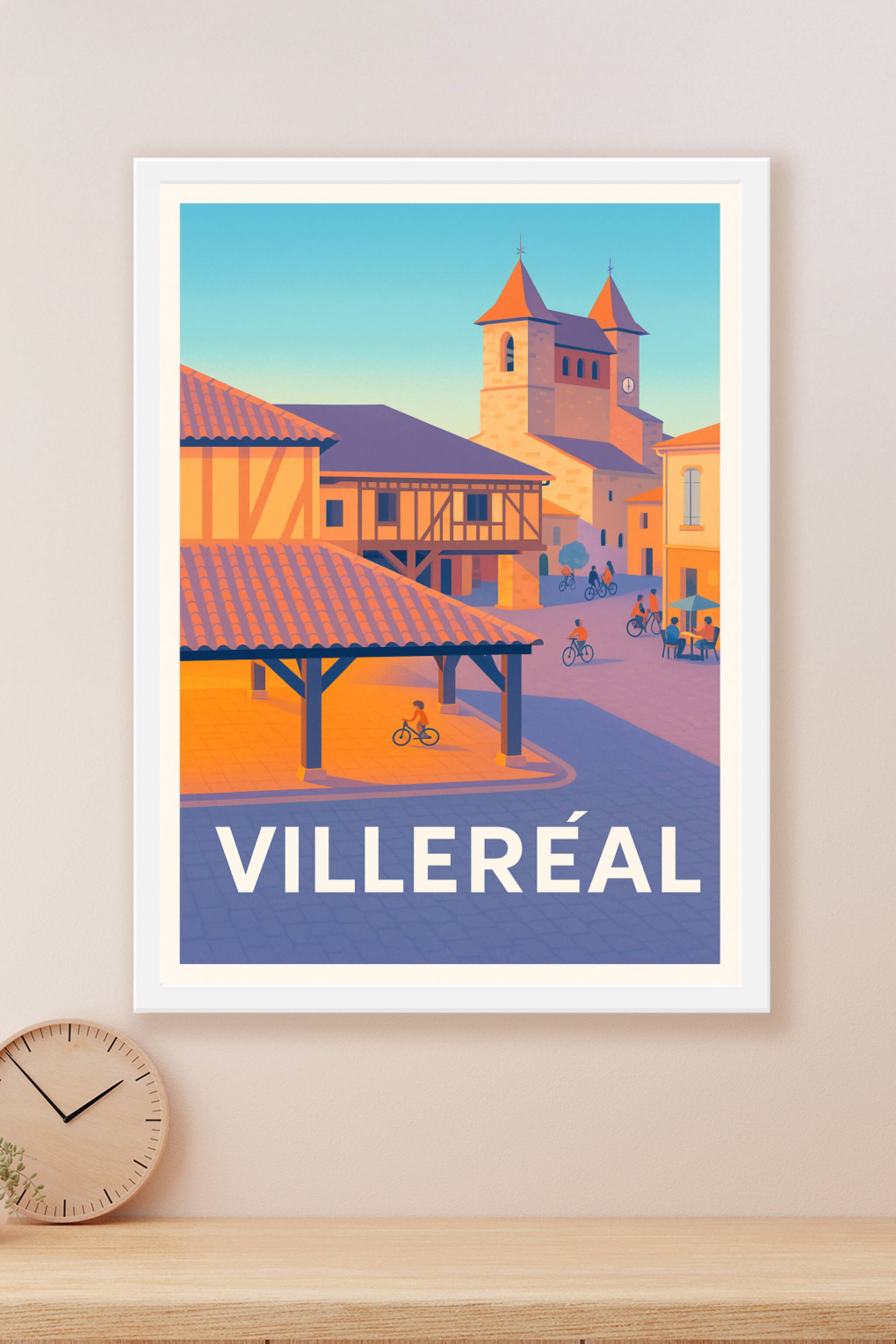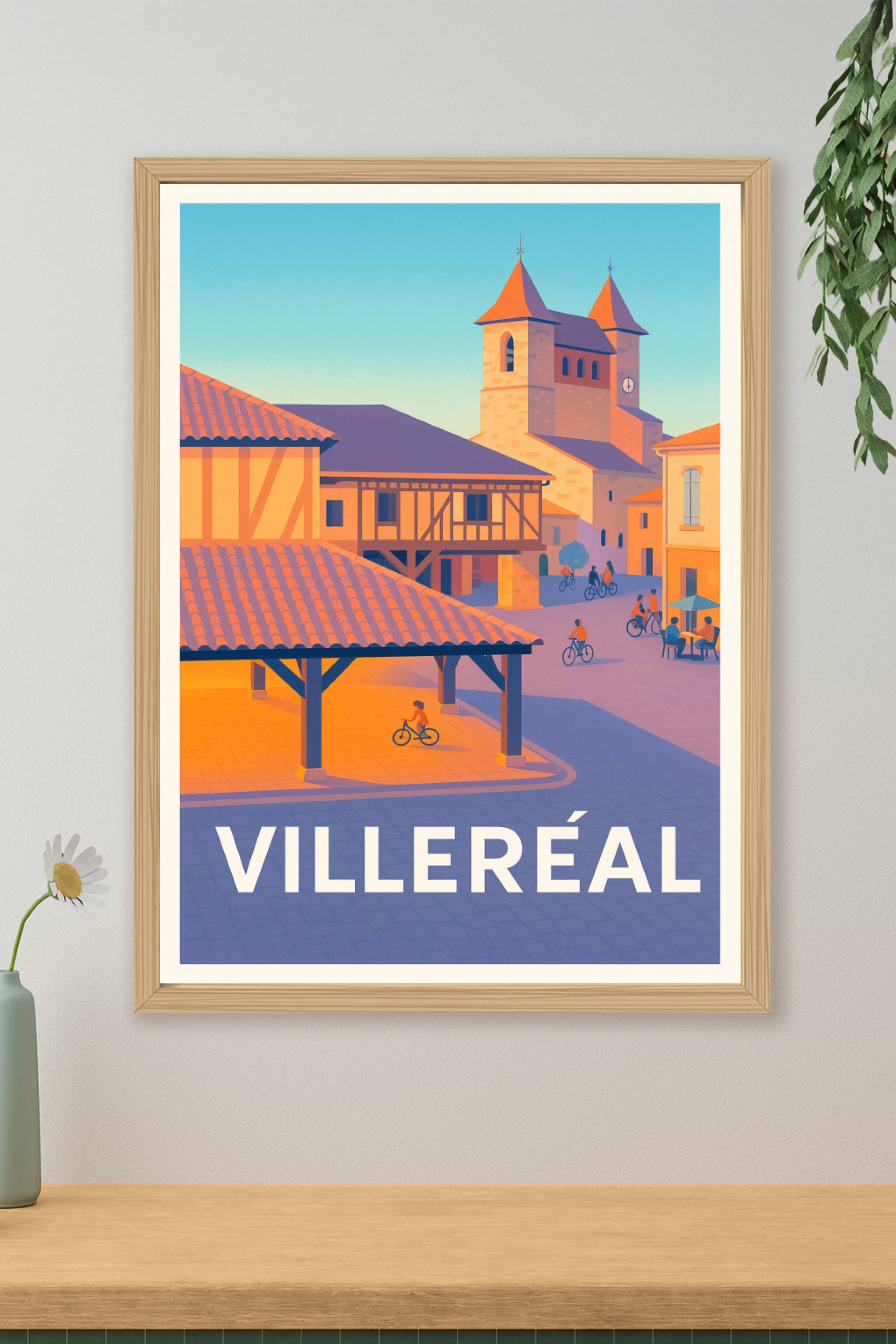 Découvrez l'authenticité de Villeréal à travers cette affiche illustrée mettant en scène la place centrale animée et ses bâtiments historiques typi...