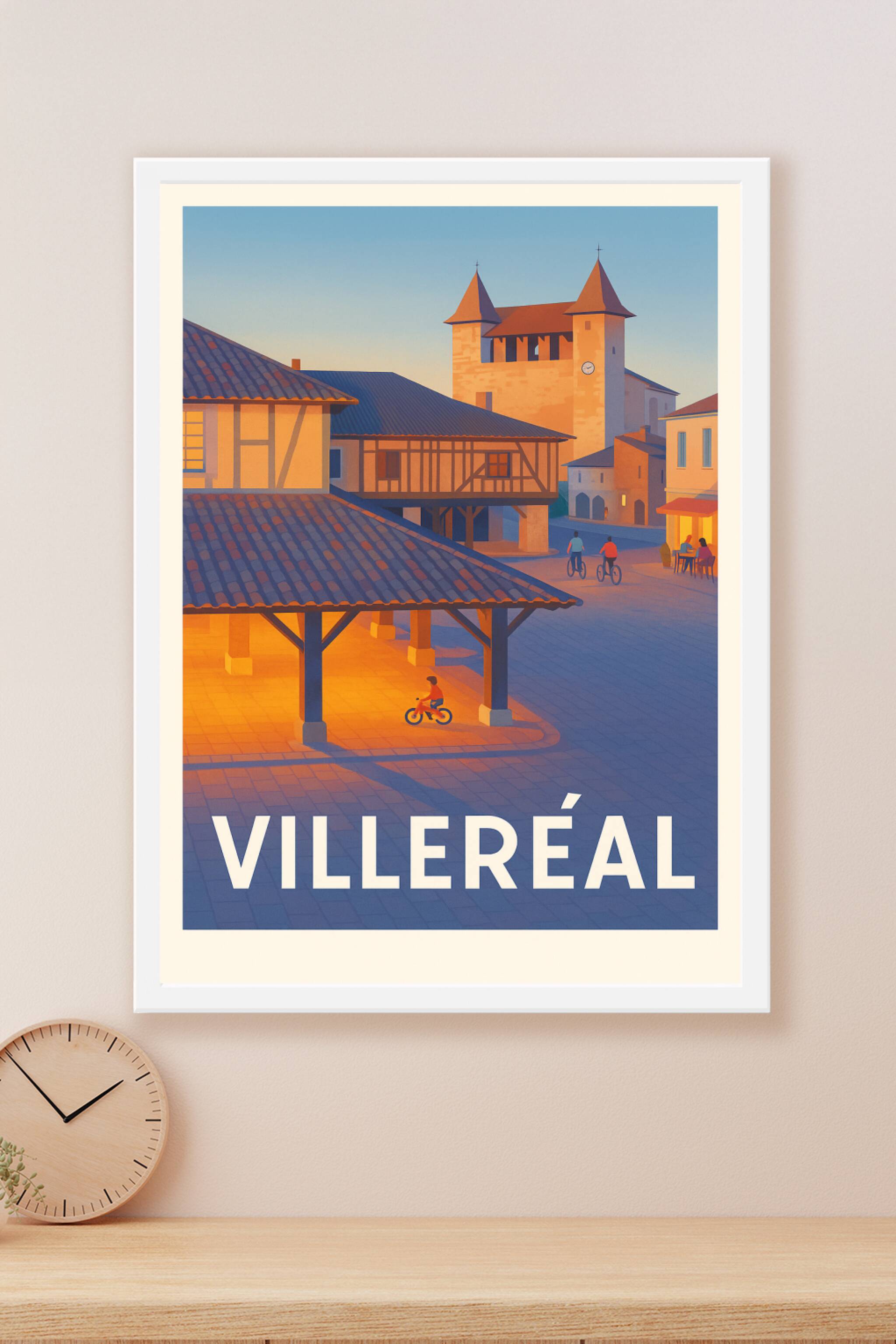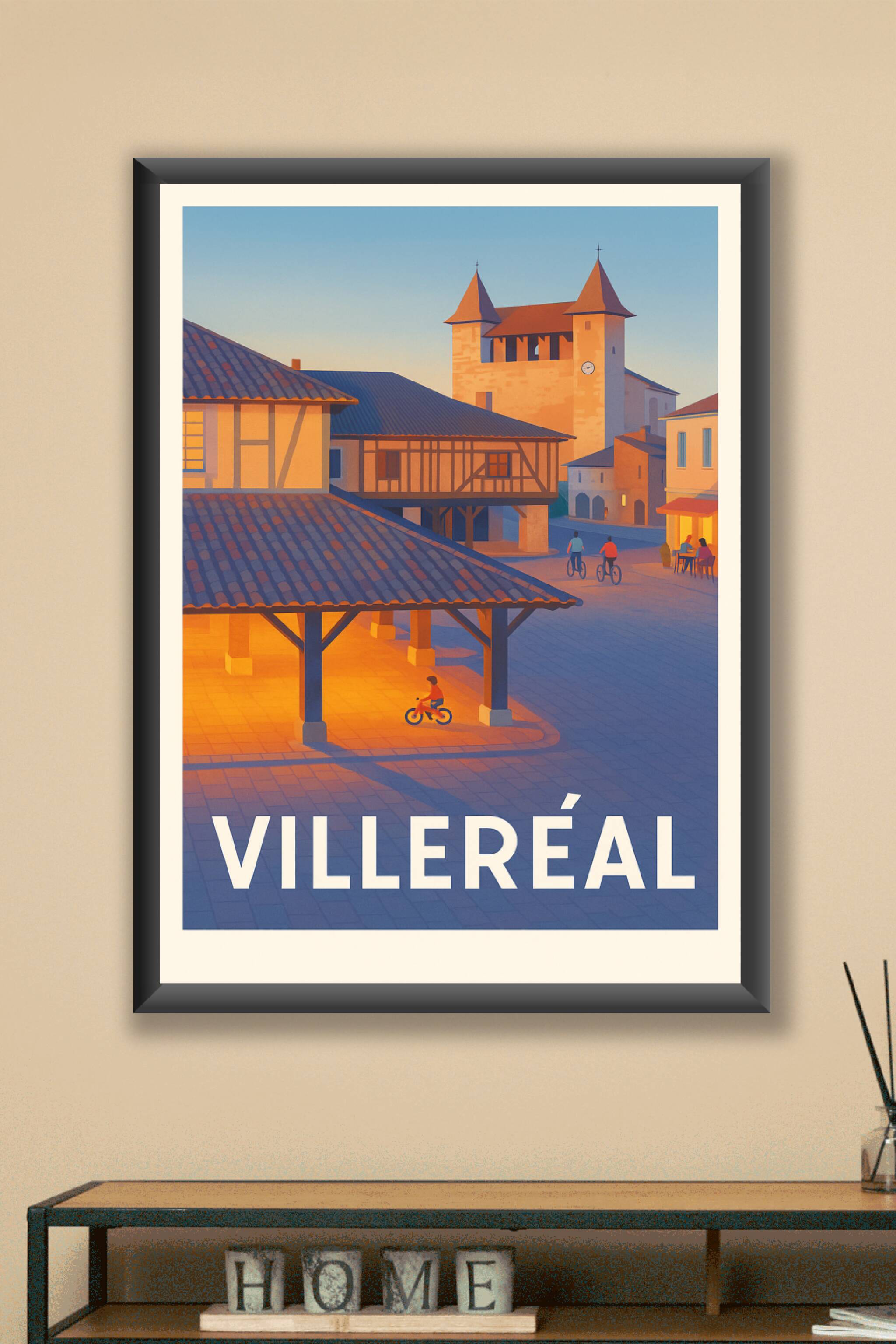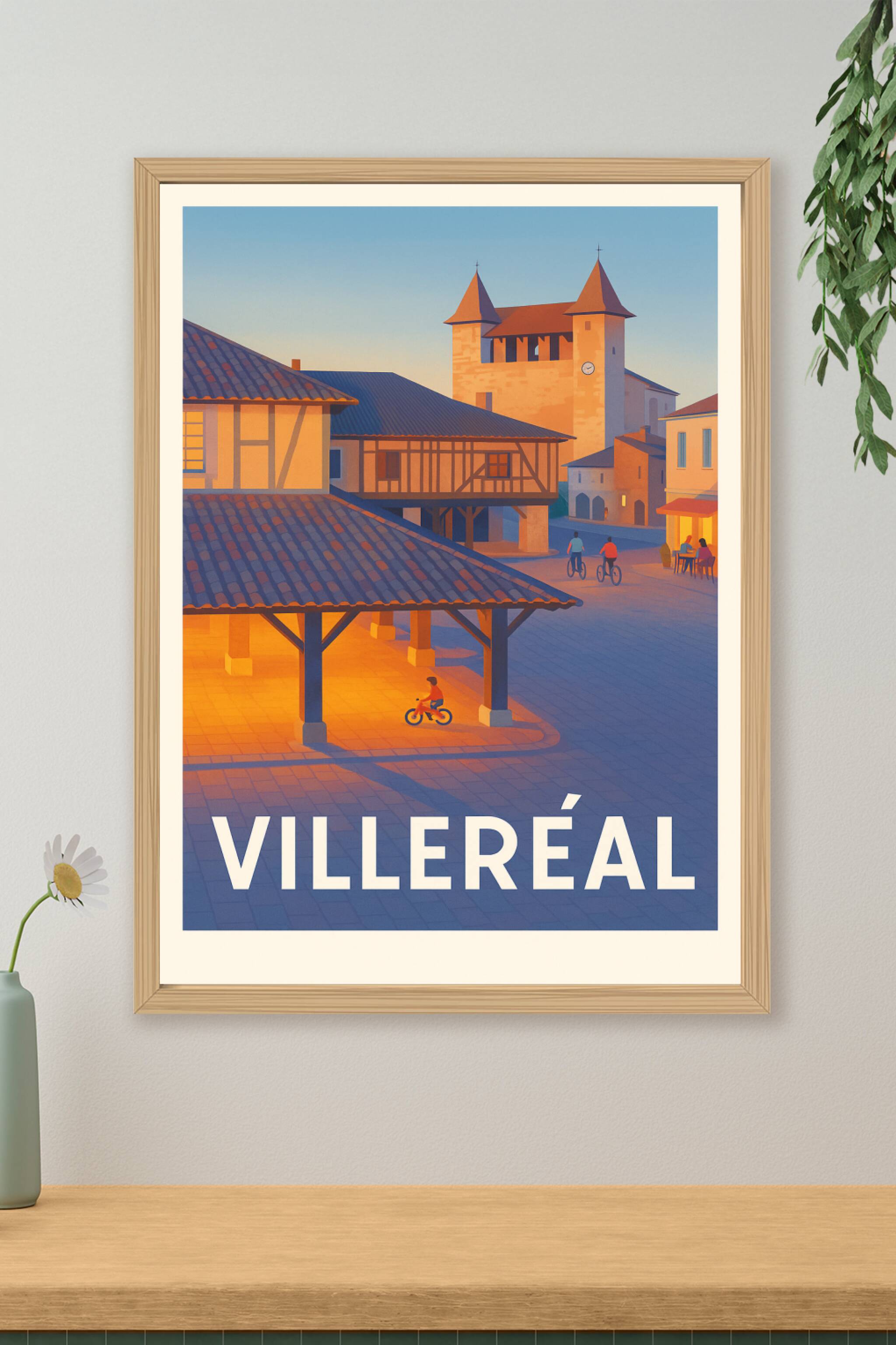 Découvrez l'atmosphère paisible et chaleureuse de Villeréal à travers cette affiche artistique qui met en lumière l'architecture typique de cette b...