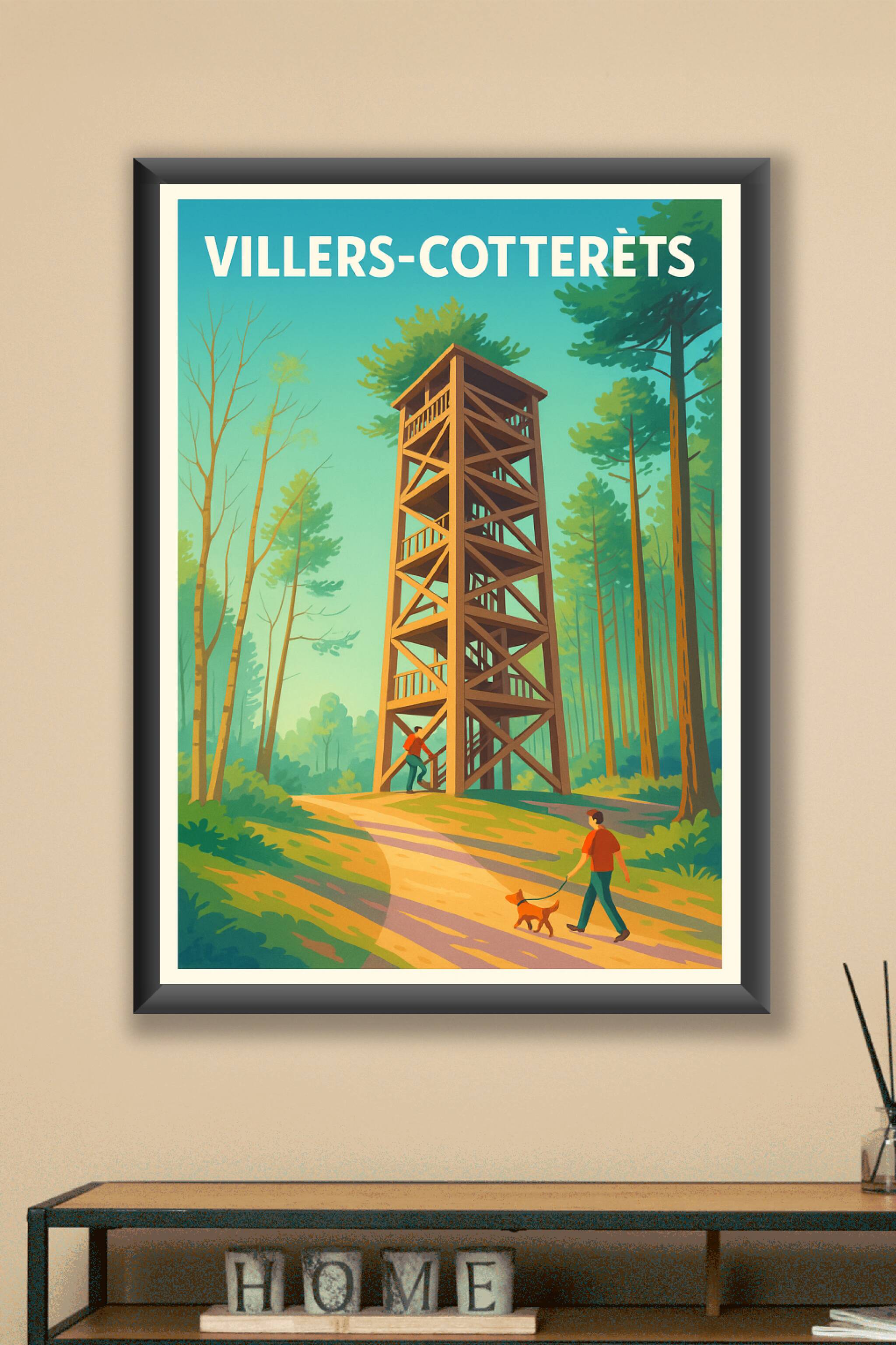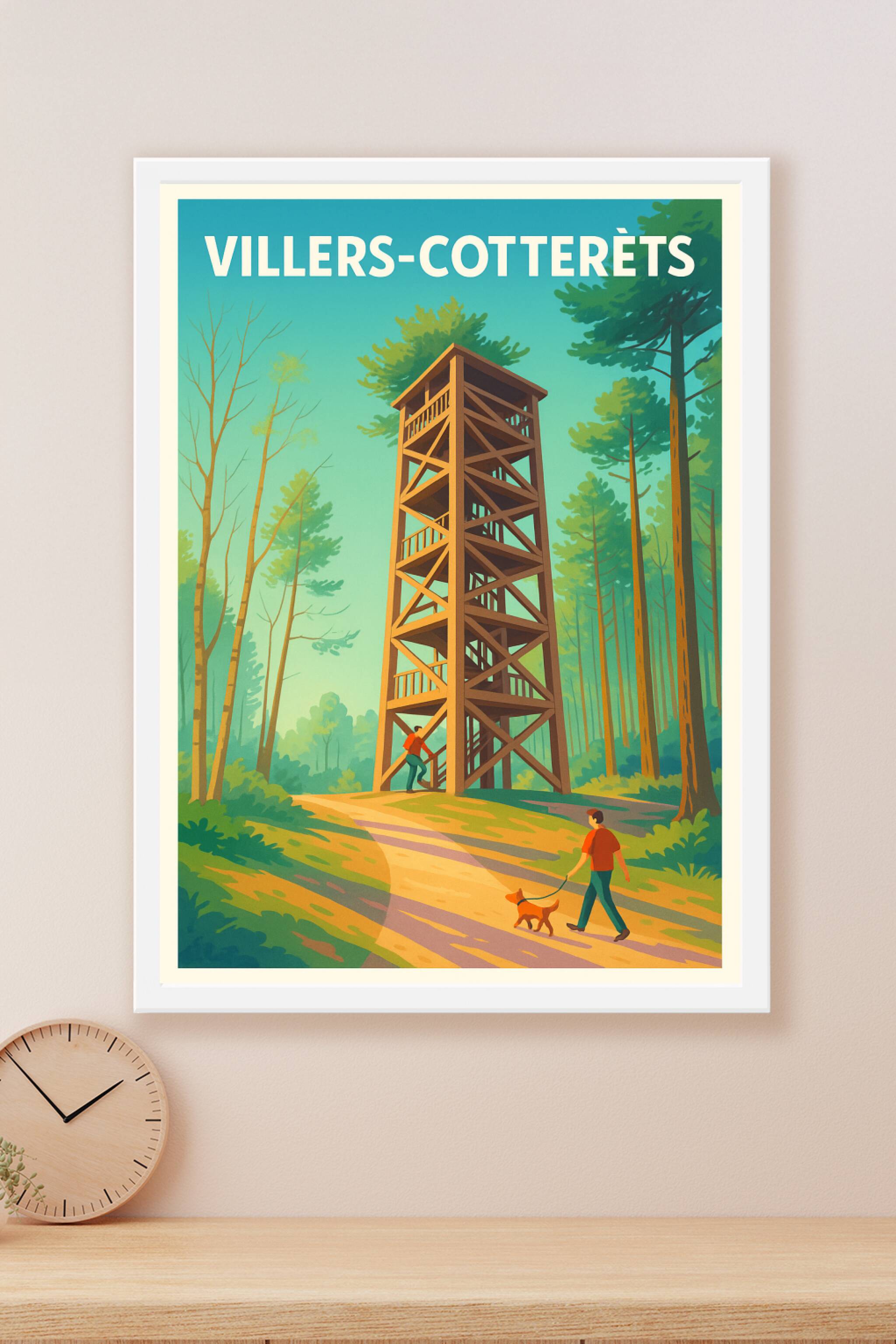 Découvrez cette affiche qui capture la beauté paisible de Villers-Cotterêts, avec son emblématique belvédère en bois niché au cœur d'une forêt verd...