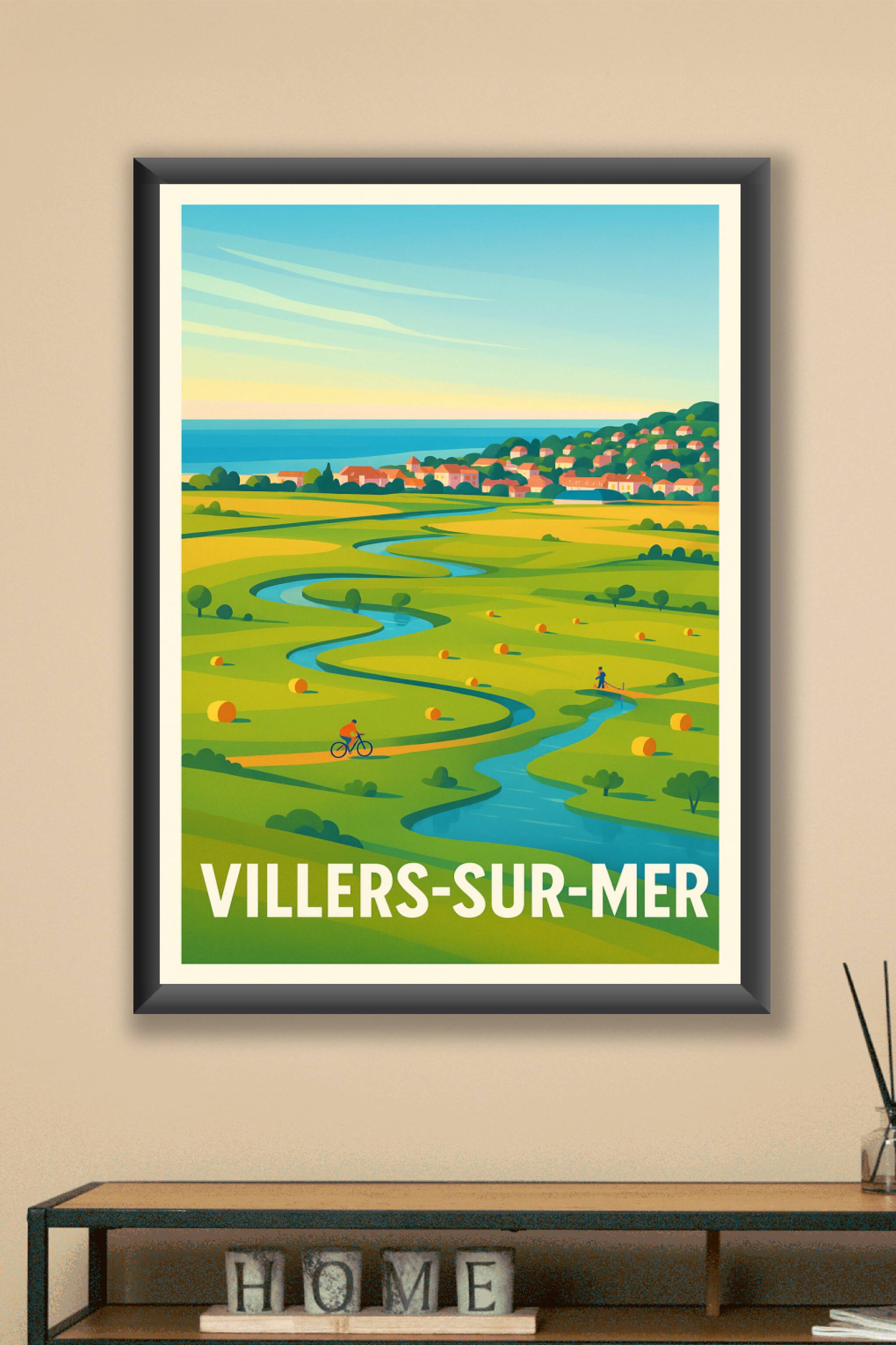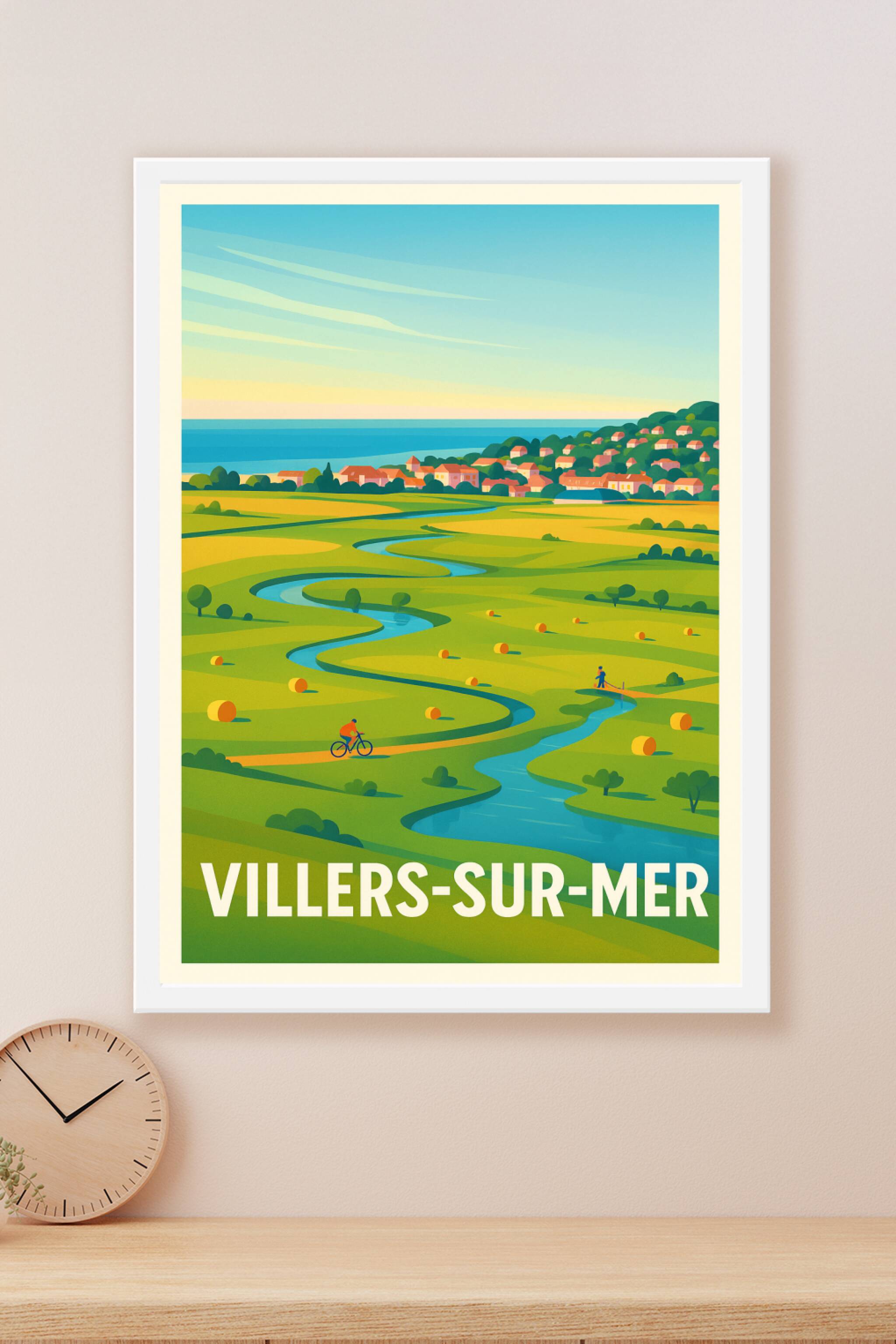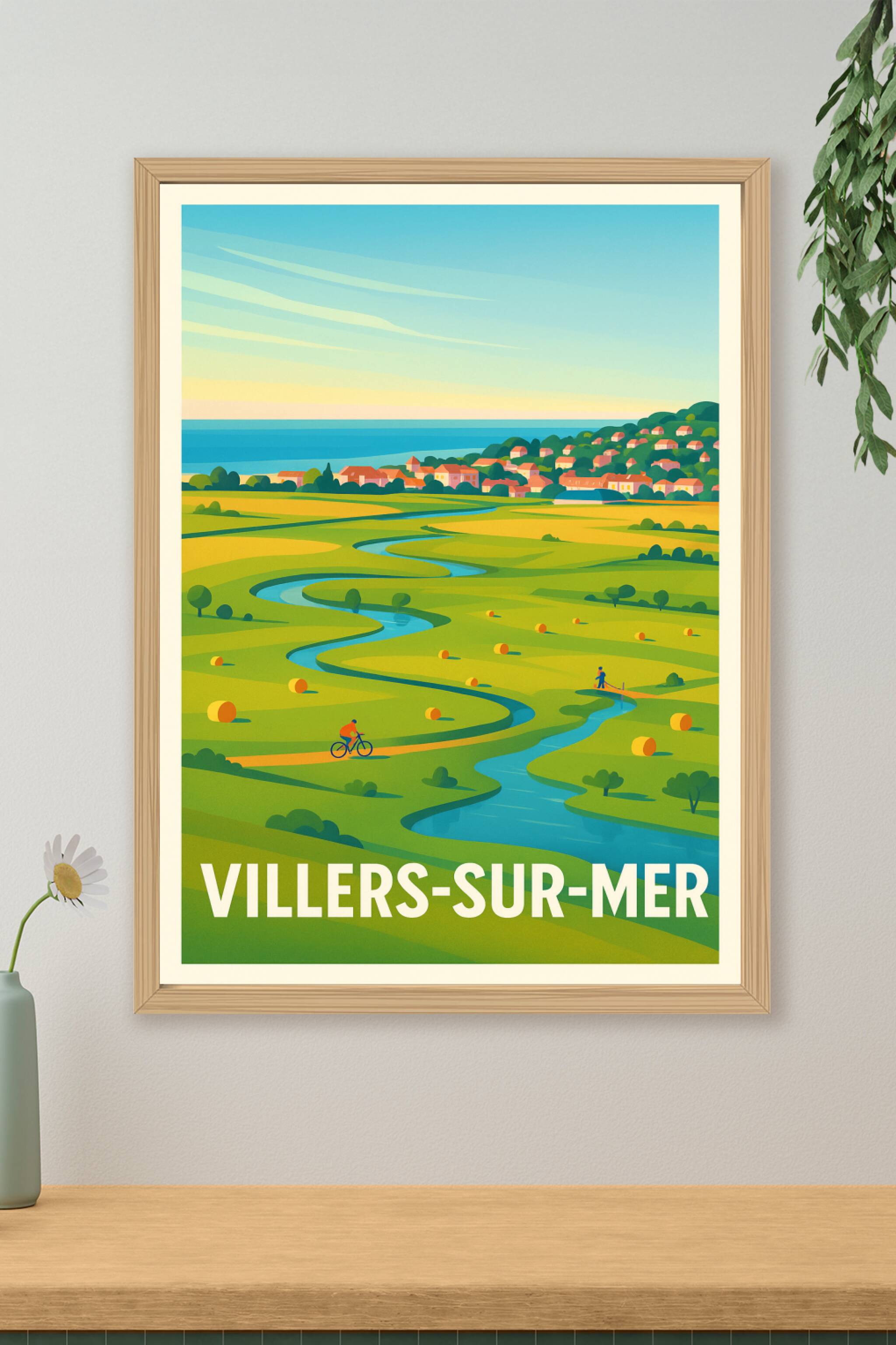 Découvrez Villers-sur-Mer autrement avec cette affiche artistique qui capture la douceur de la campagne normande et ses champs verdoyants bordant u...