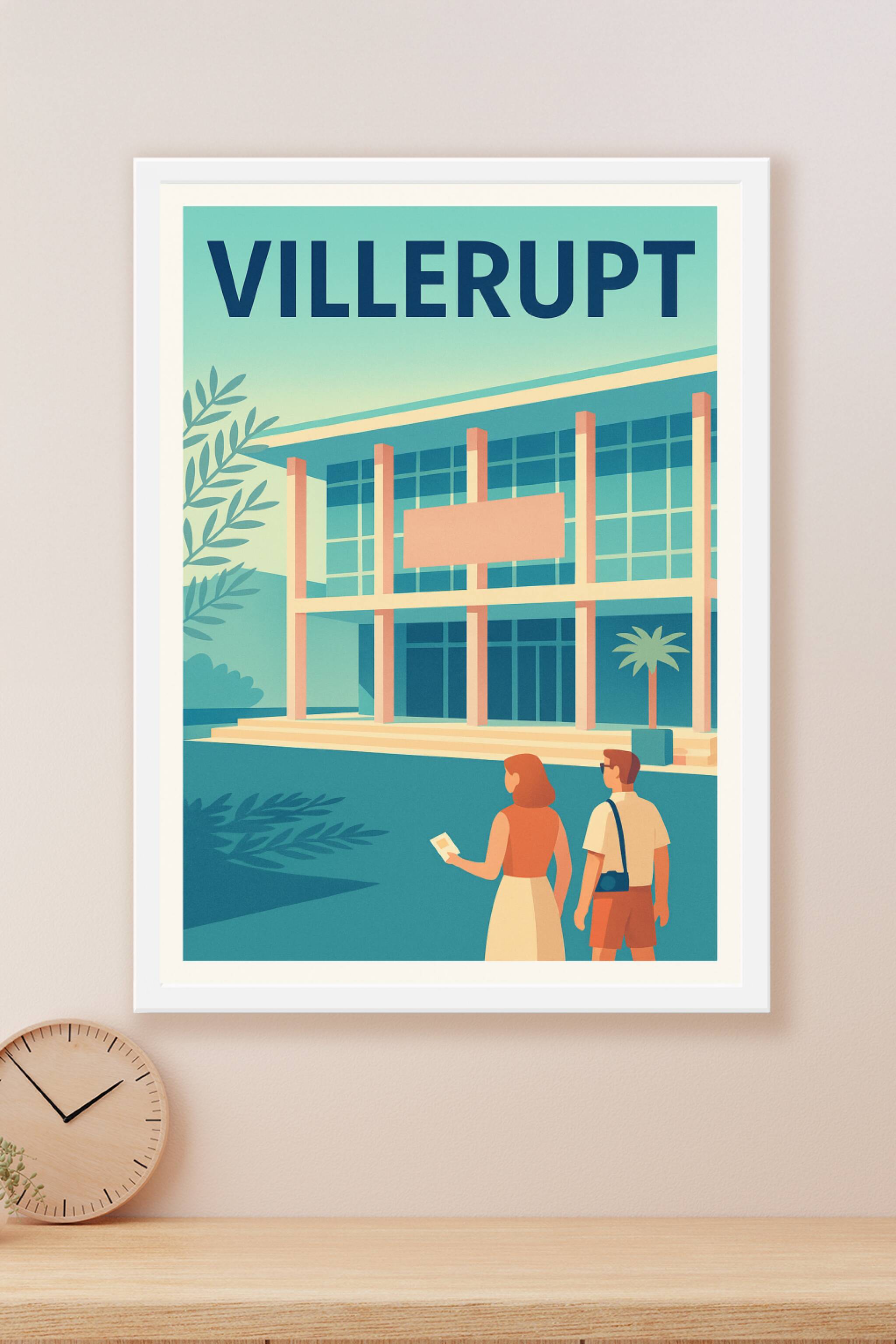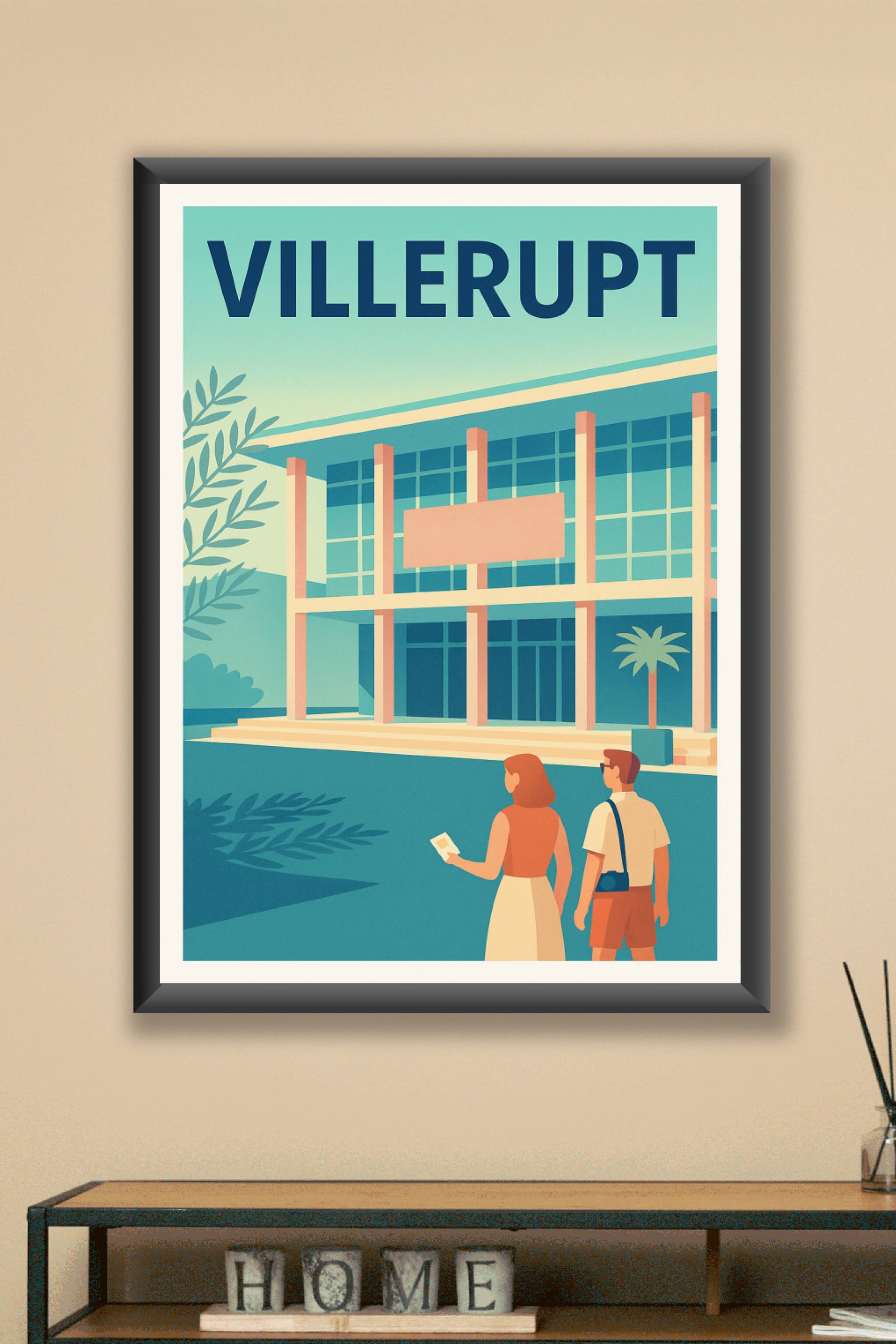 Plongez au cœur de Villerupt avec cette affiche rétro illustrant un bâtiment emblématique et sa façade moderne. Ce poster évoque un voyage tranquil...
