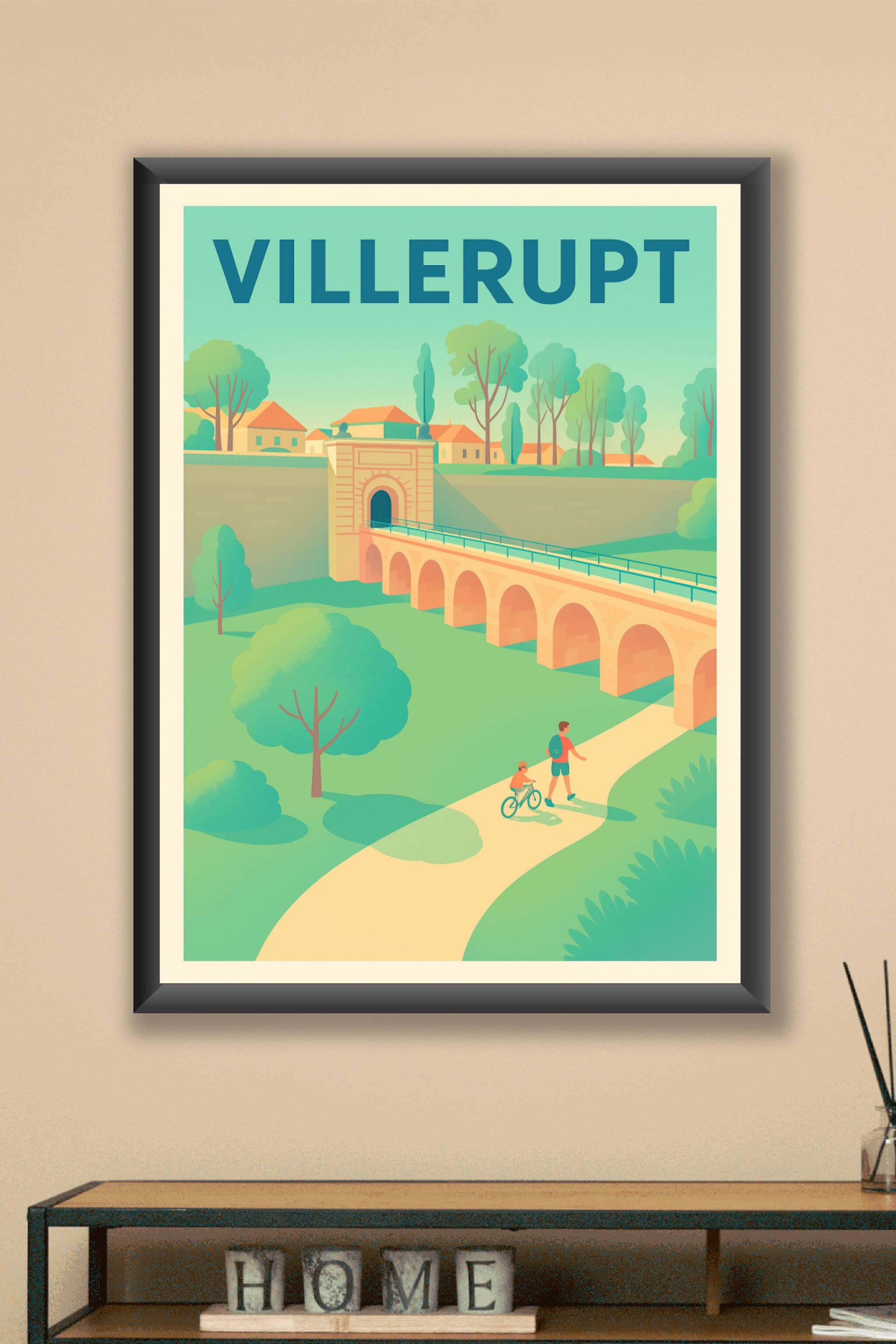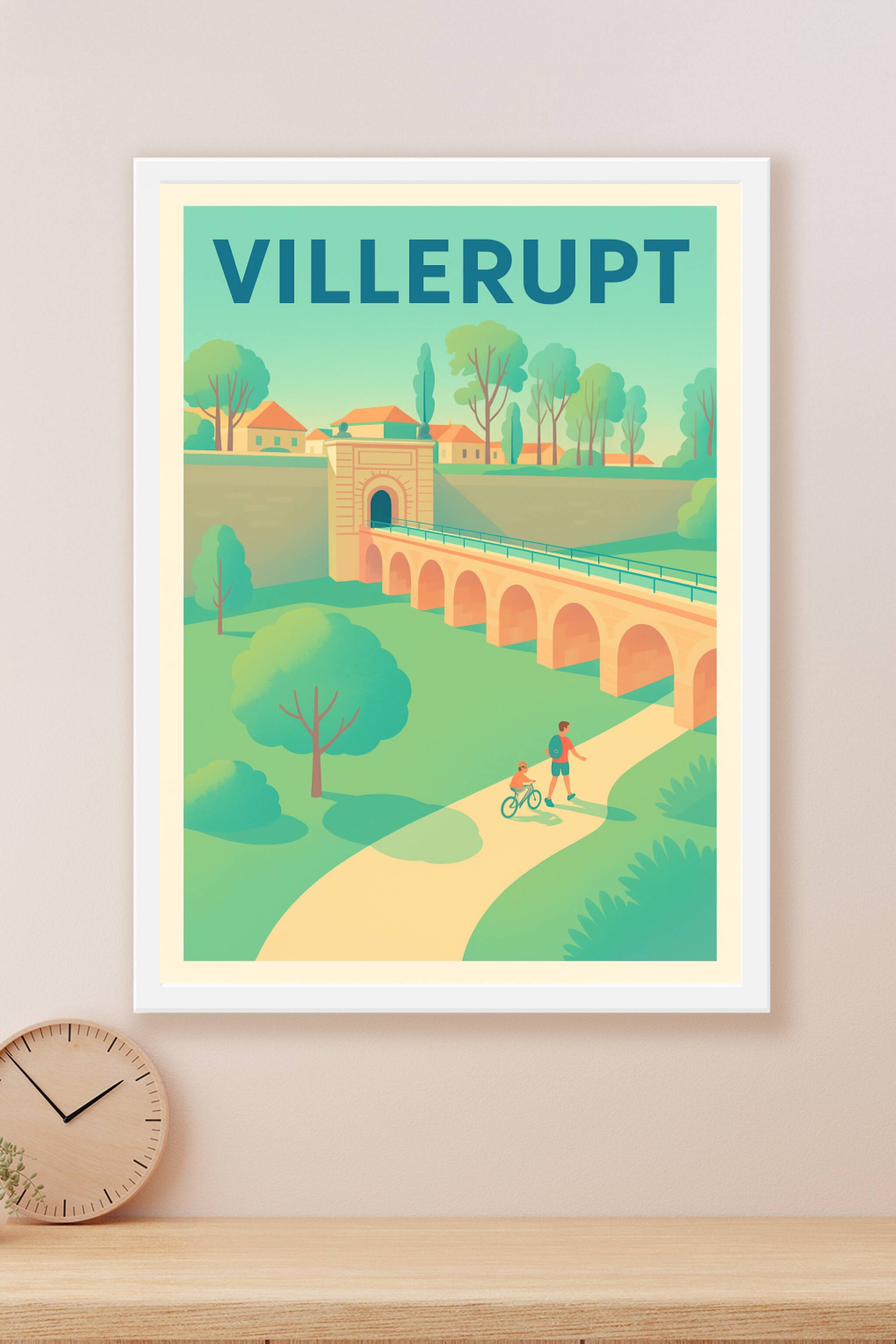 Découvrez la sérénité et le charme de Villerupt à travers cette affiche illustrée représentant un sentier paisible longeant un majestueux pont à ar...